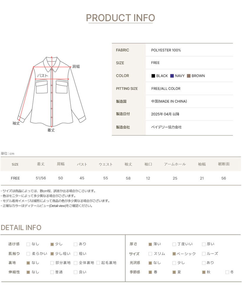 肩断面50 バスト45 ウエスト55 袖丈58 袖断面12 アームホール25 袖幅21 裾断面56 着丈(前/後)51/56