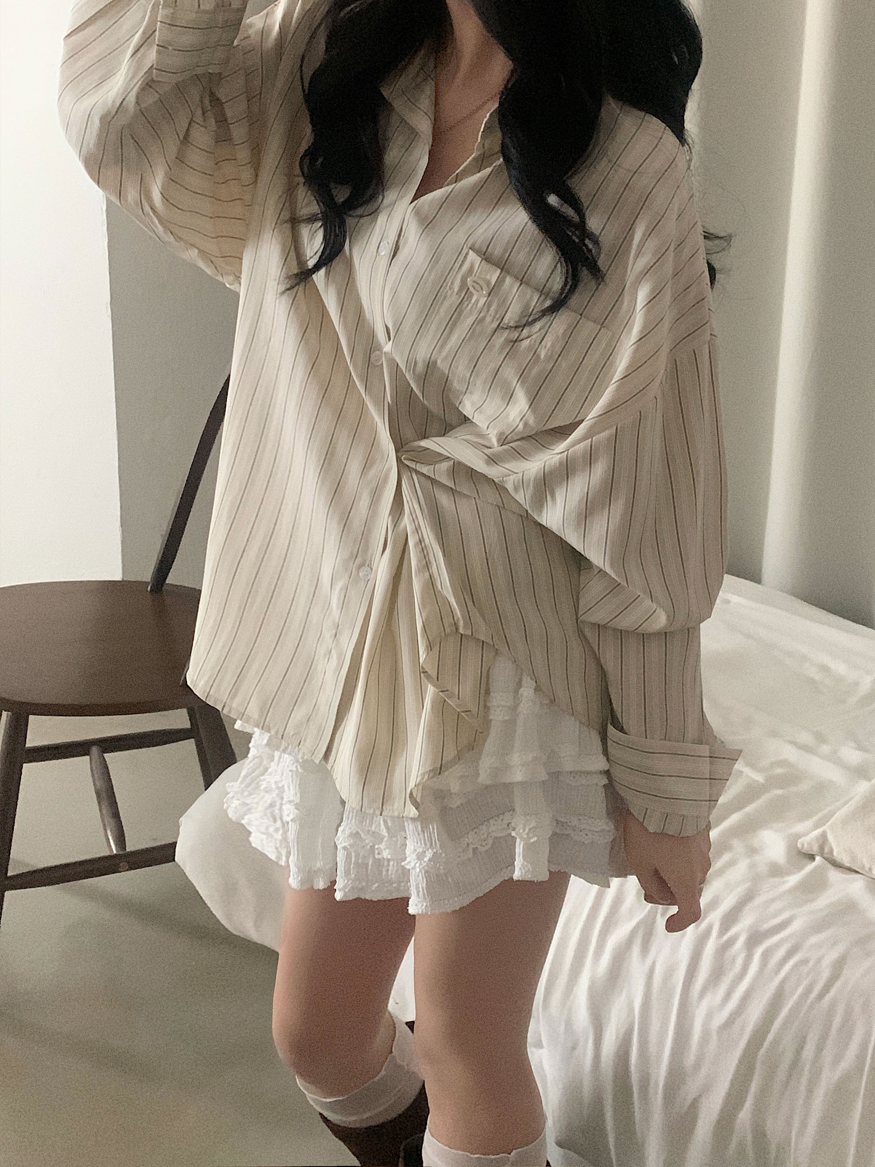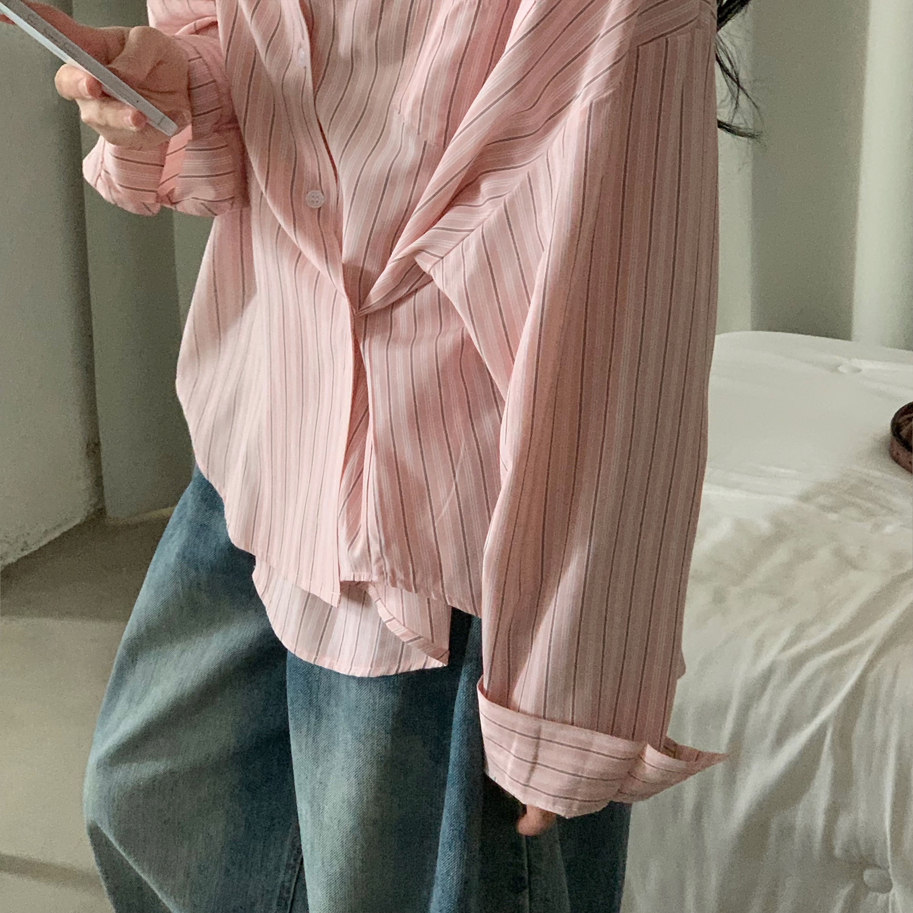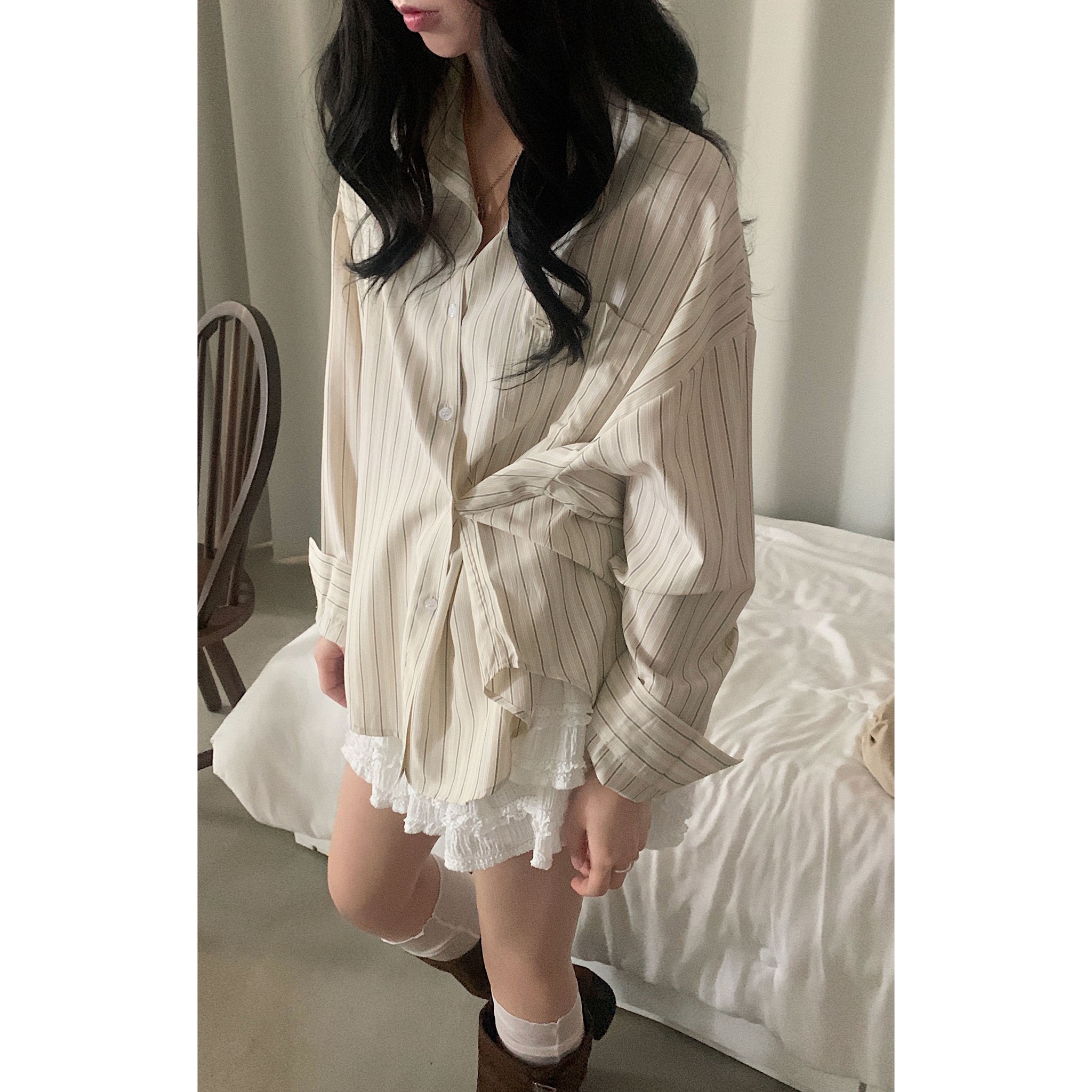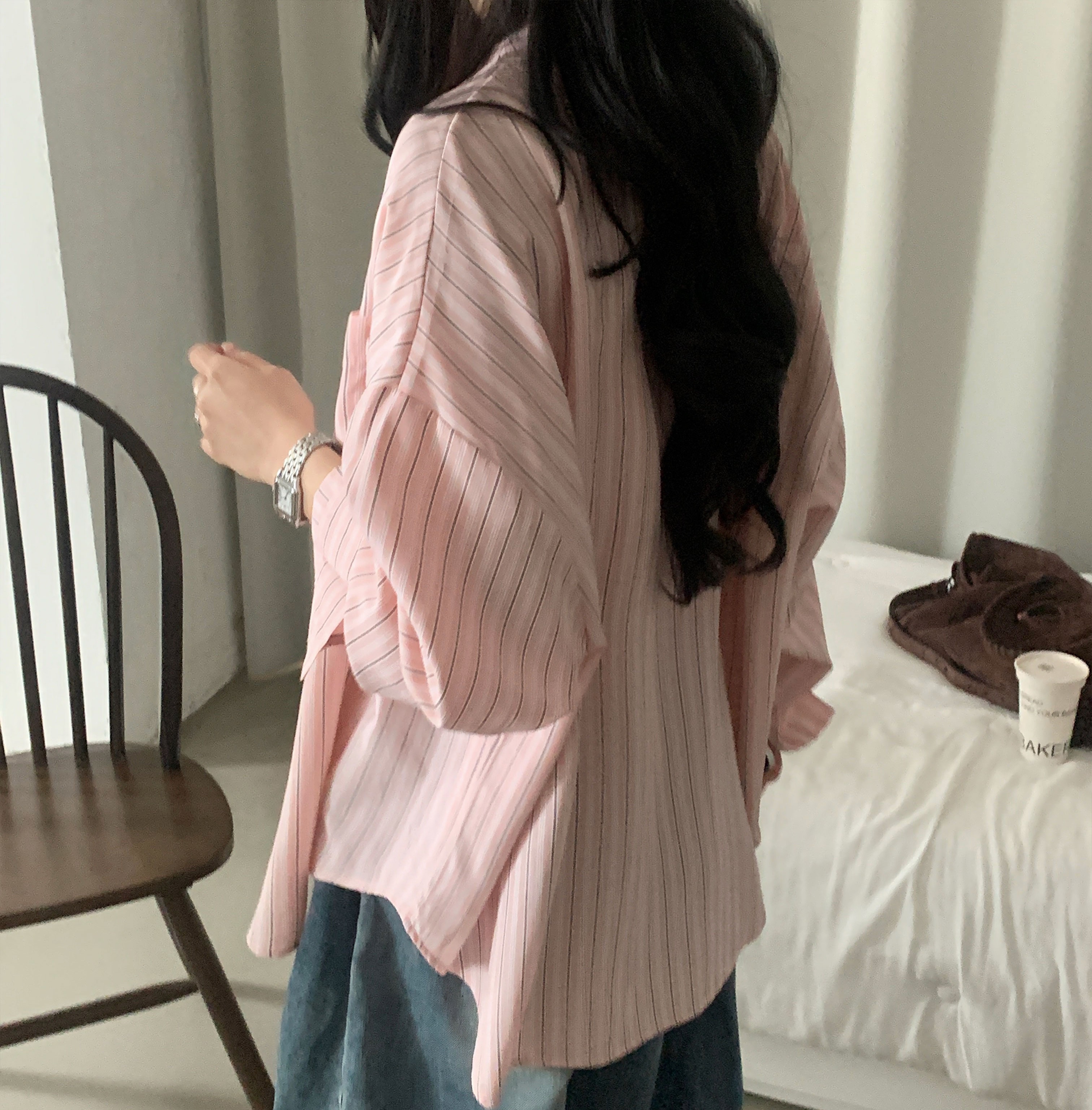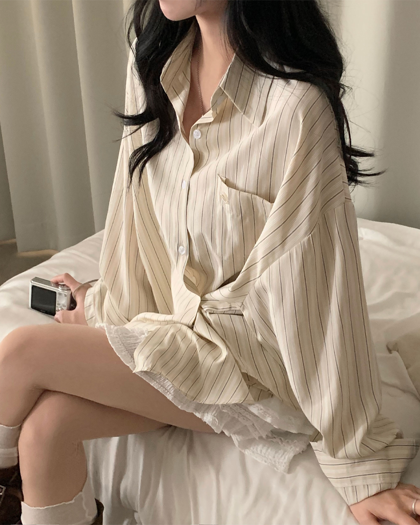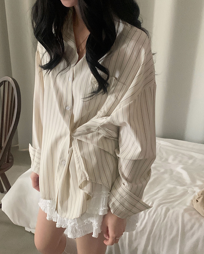 (3color)ストライプ ボーダーラップオーバーサイズシャツ