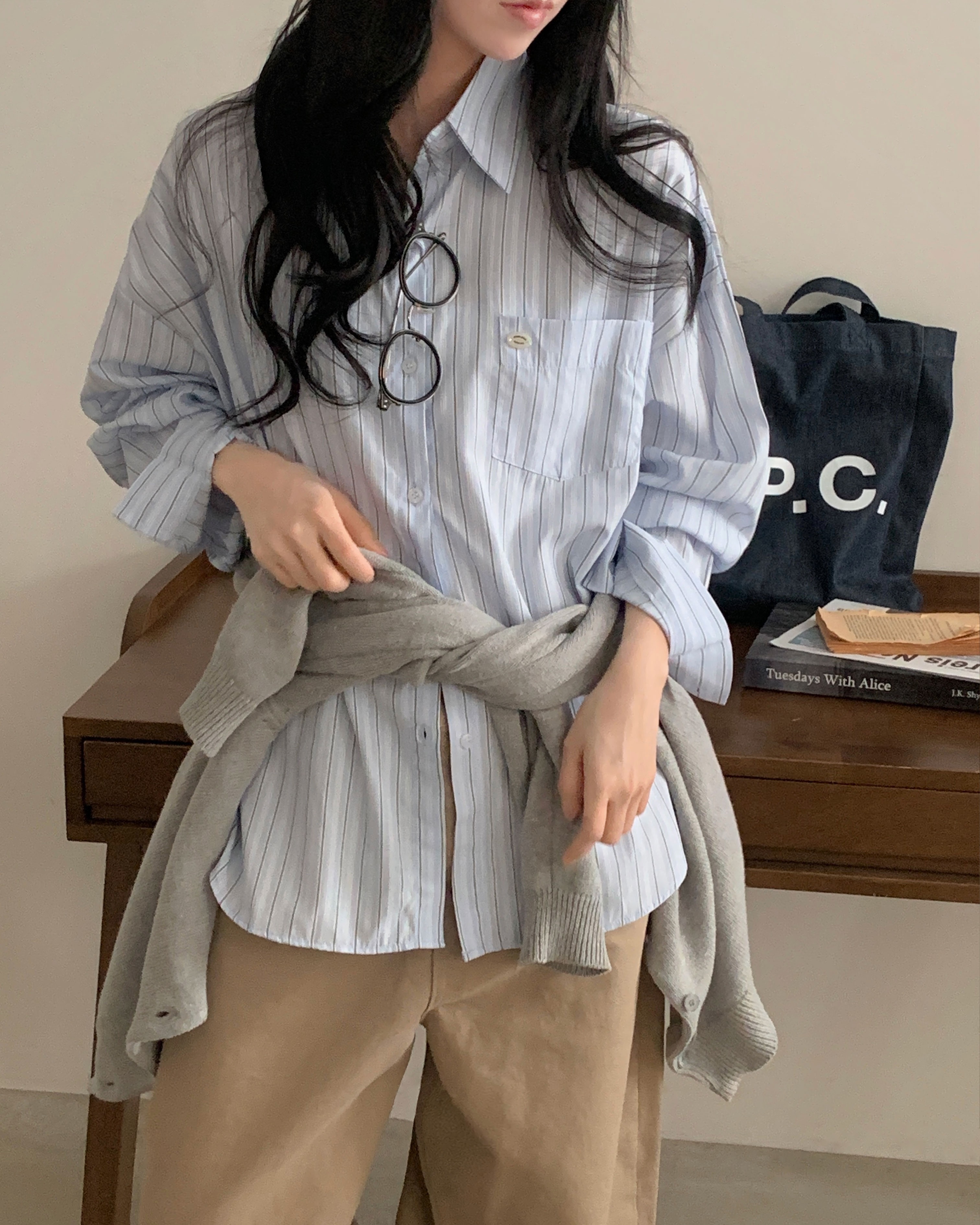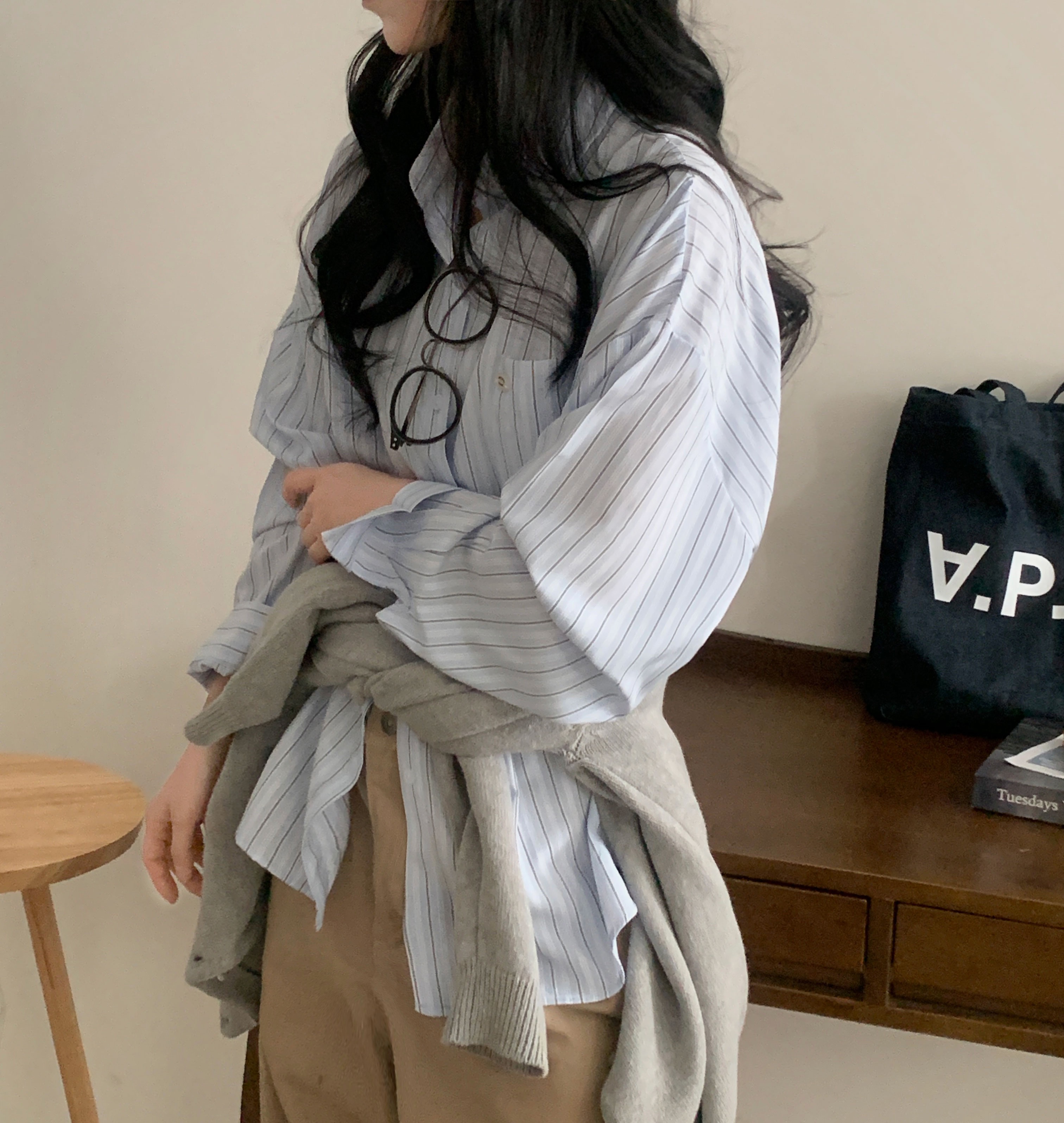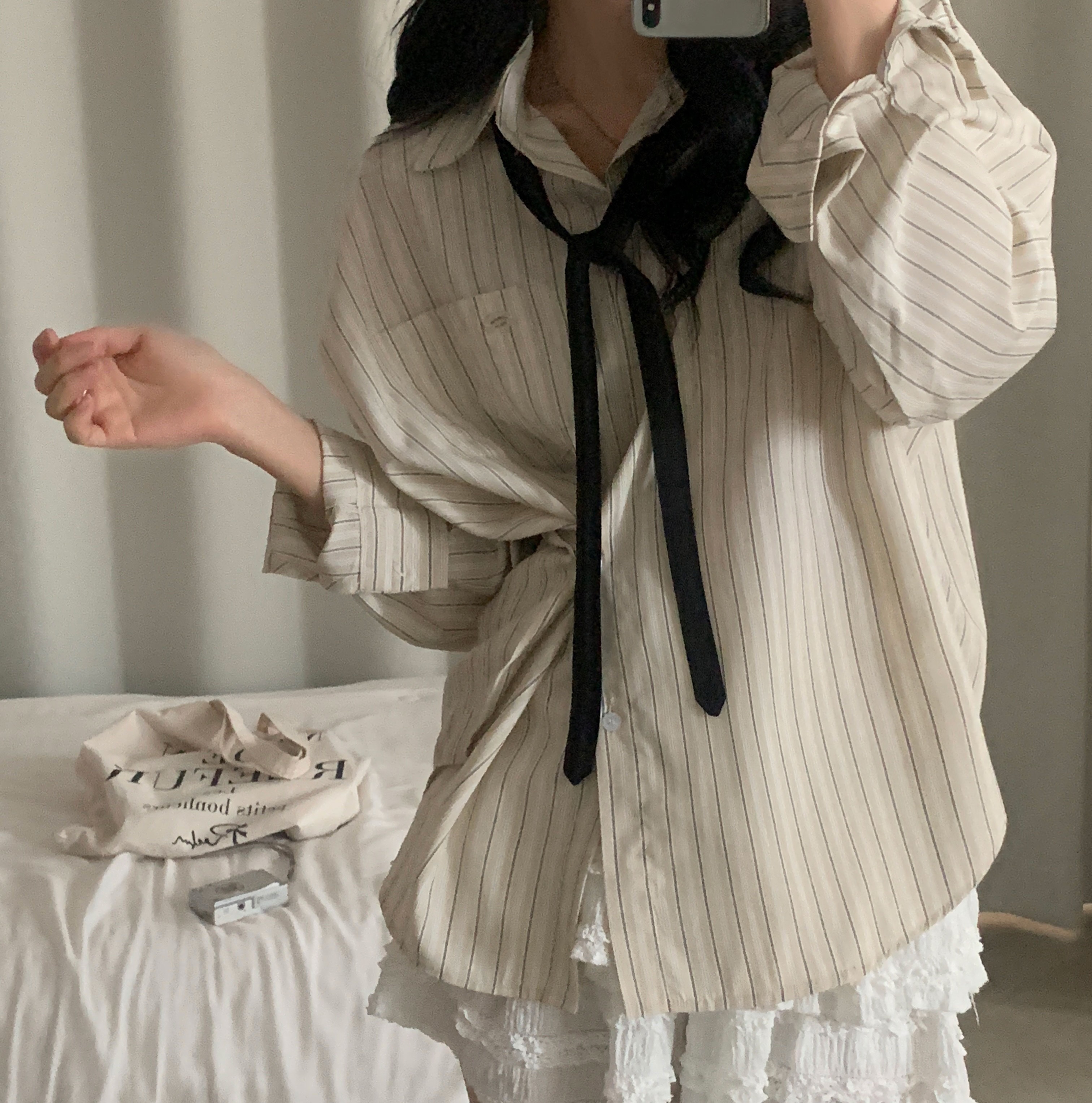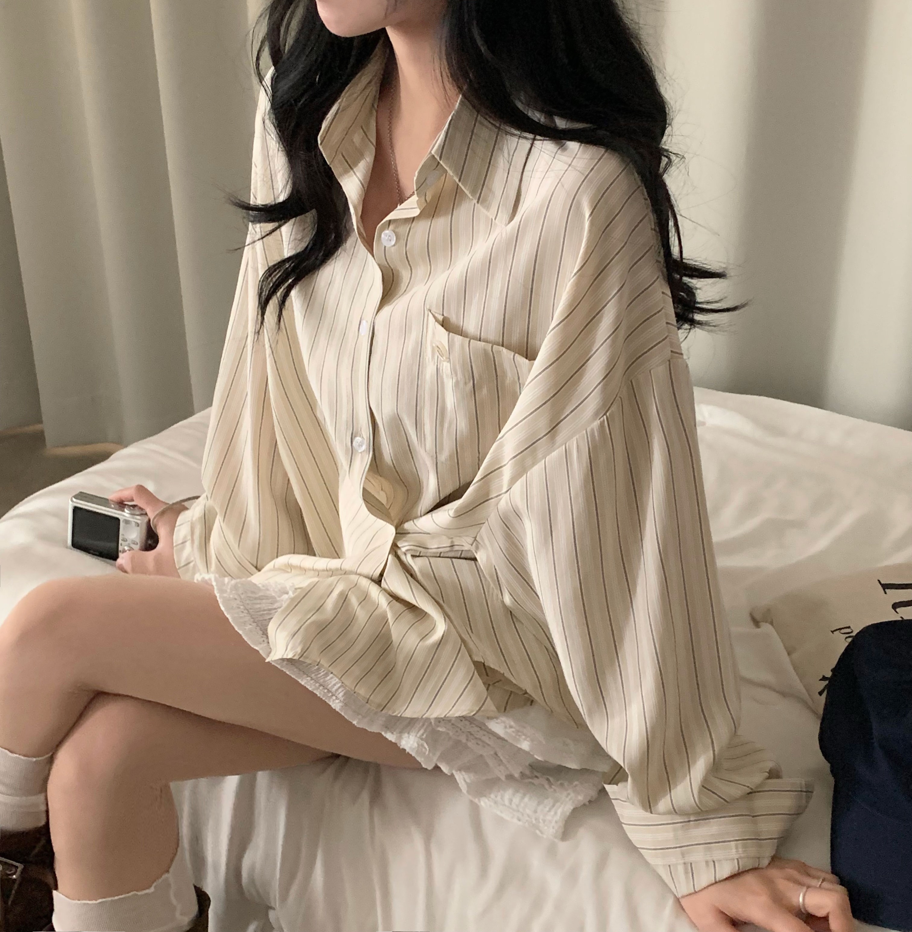 (3color)ストライプ ボーダーラップオーバーサイズシャツ
