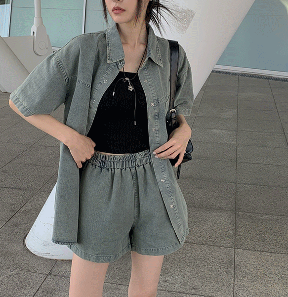 [original]デニム半袖シャツ+ショートパンツセットアップ