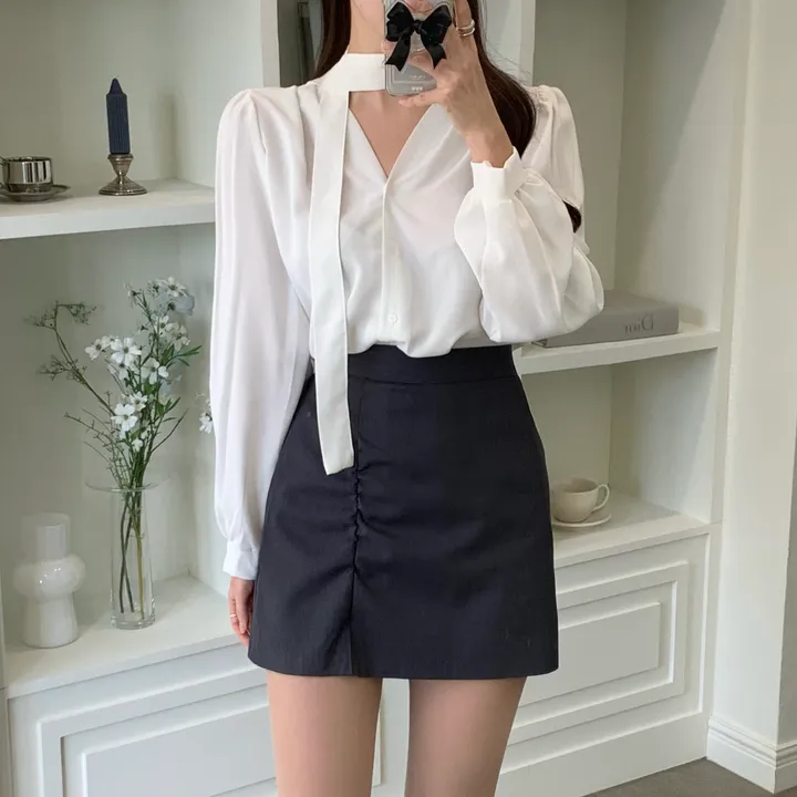 タイチョーカーシャーリングVネックブラウス