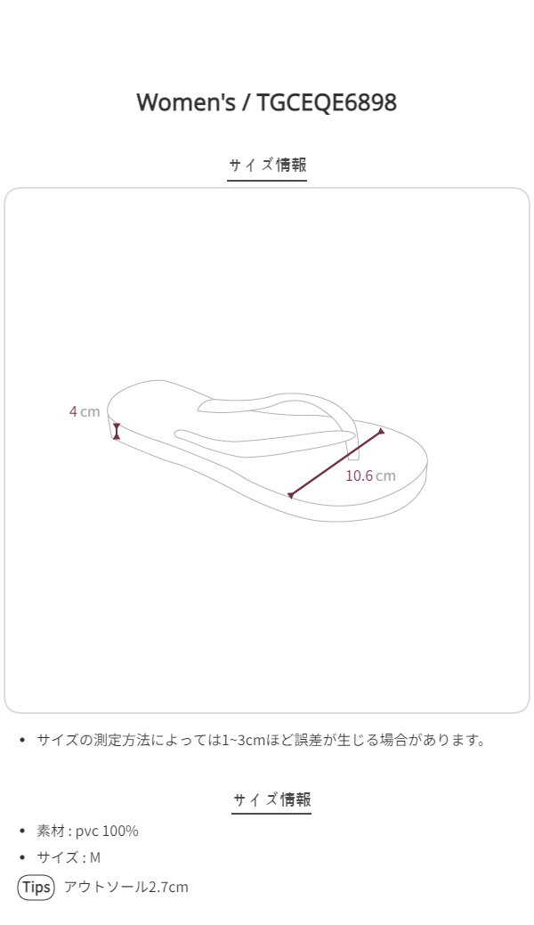 靴底に書いてあるサイズ(10単位)はソール全体の長さが測定された表記ですので実際のサイズとは関係ありませんのでご購入の際にご参考ください。
