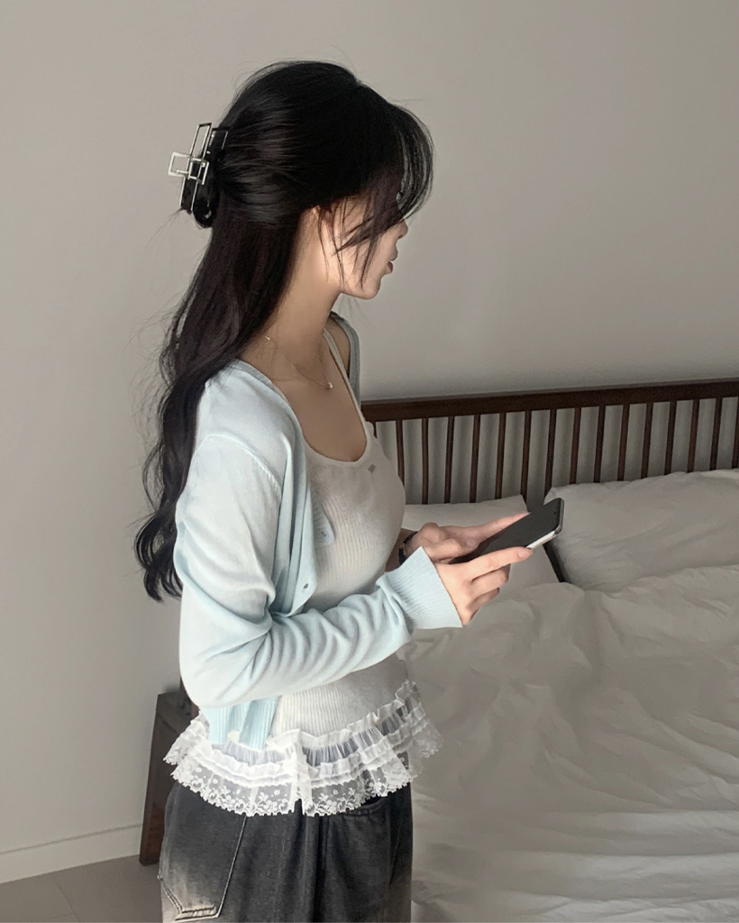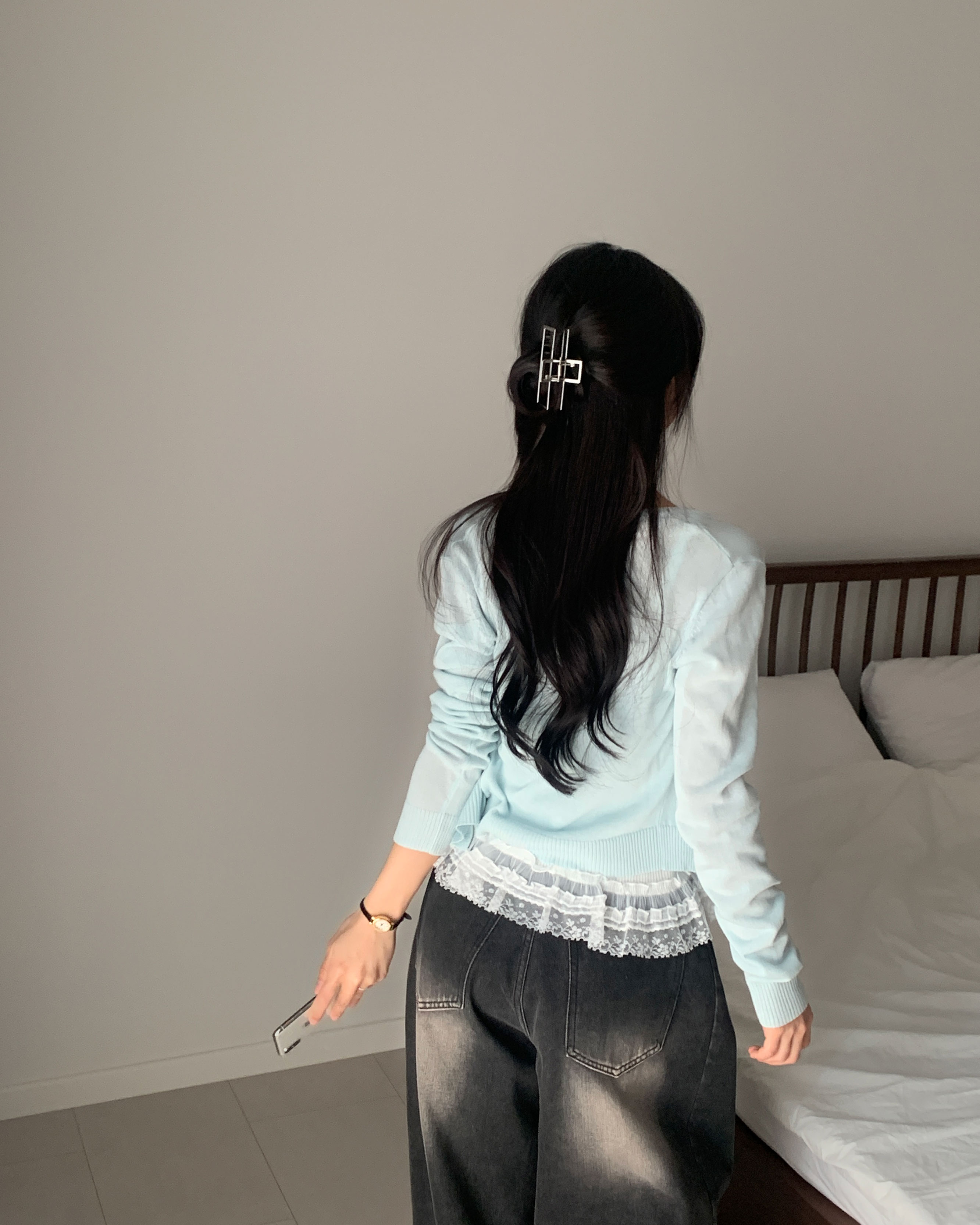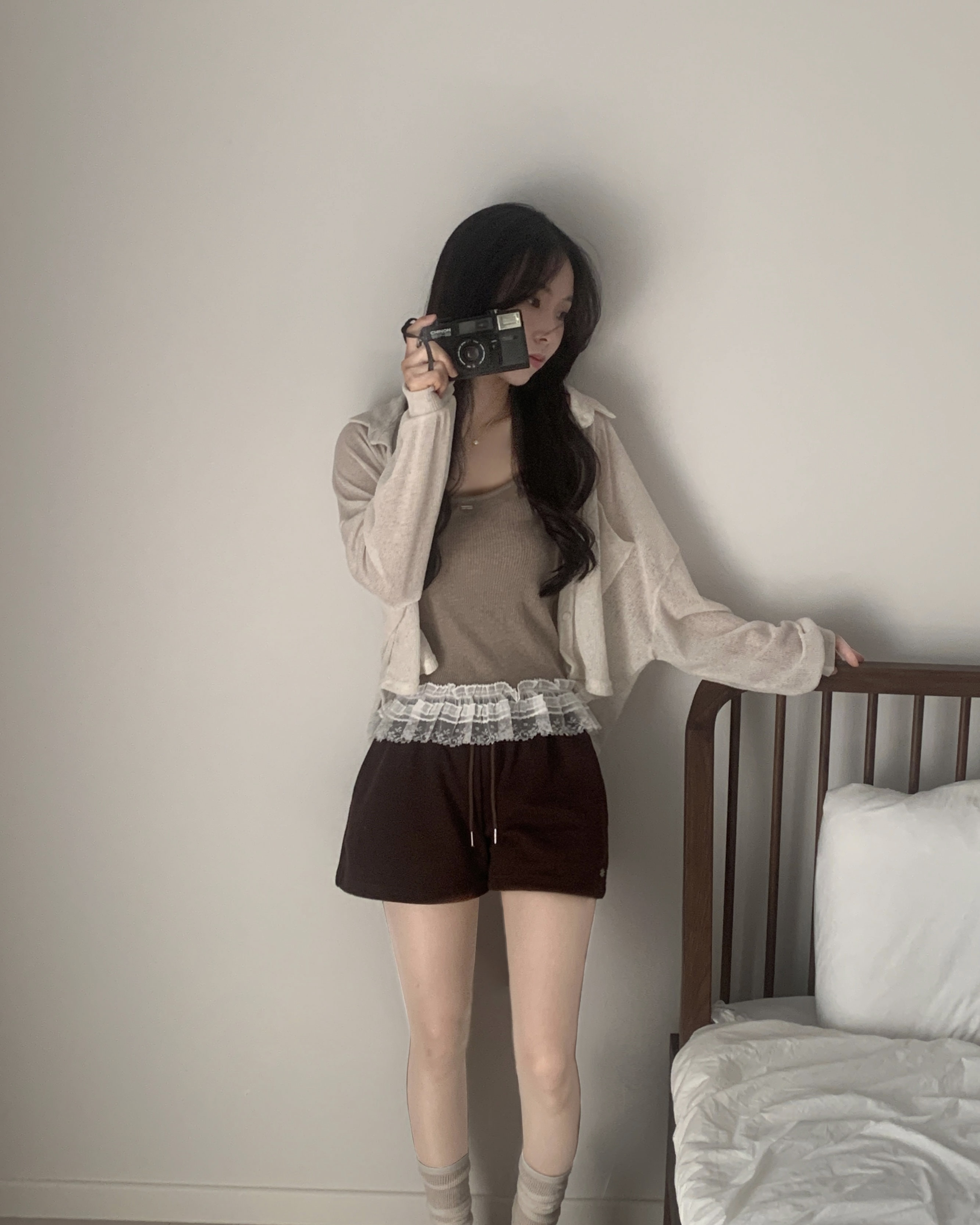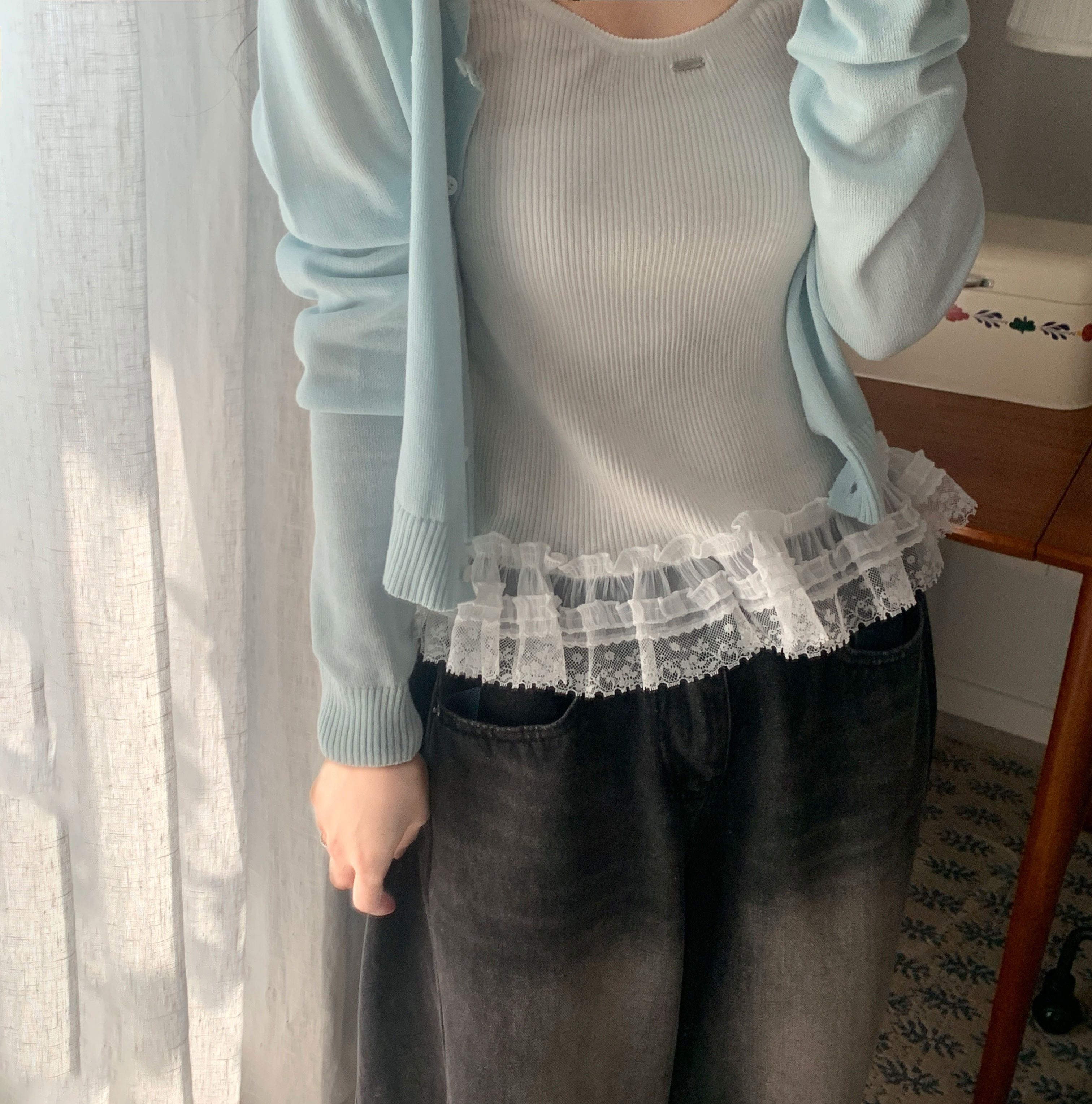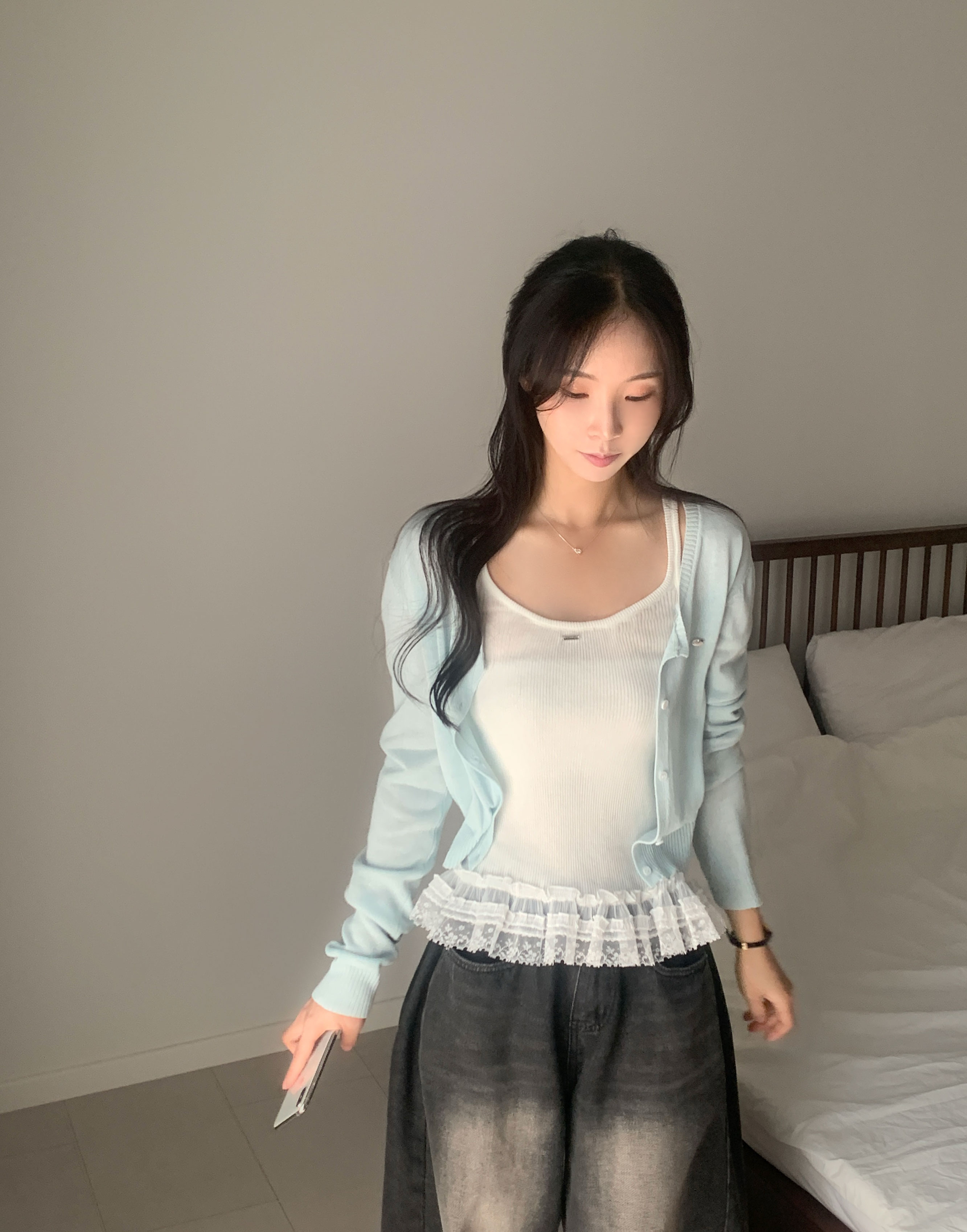 밑단에 레이스프릴 디테일이 있어서 러블리한 아웃핏이 연출되며
