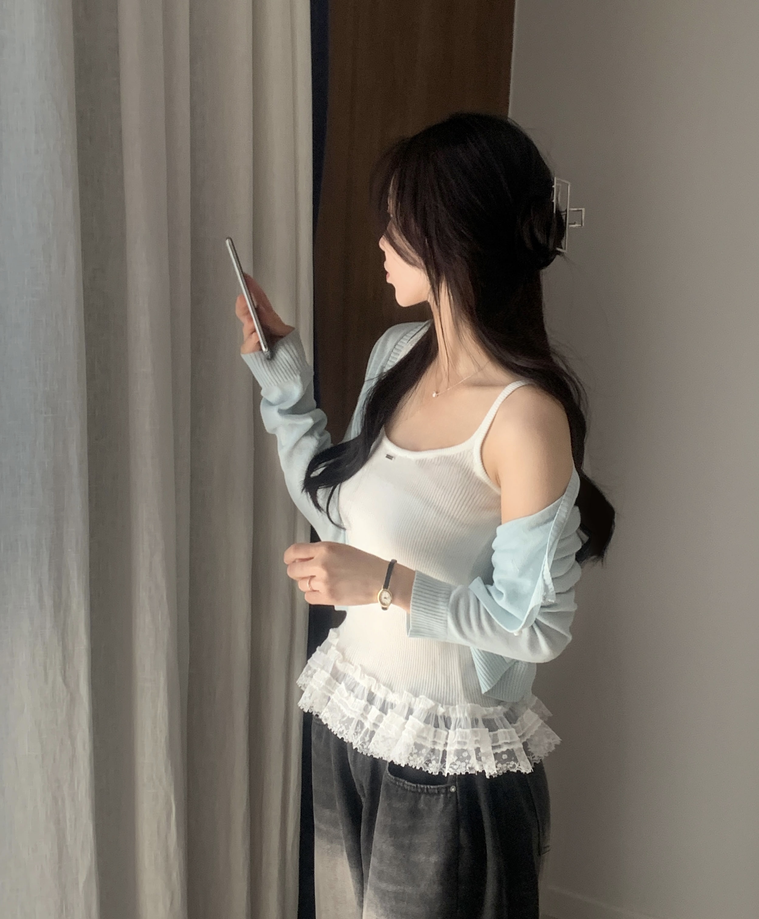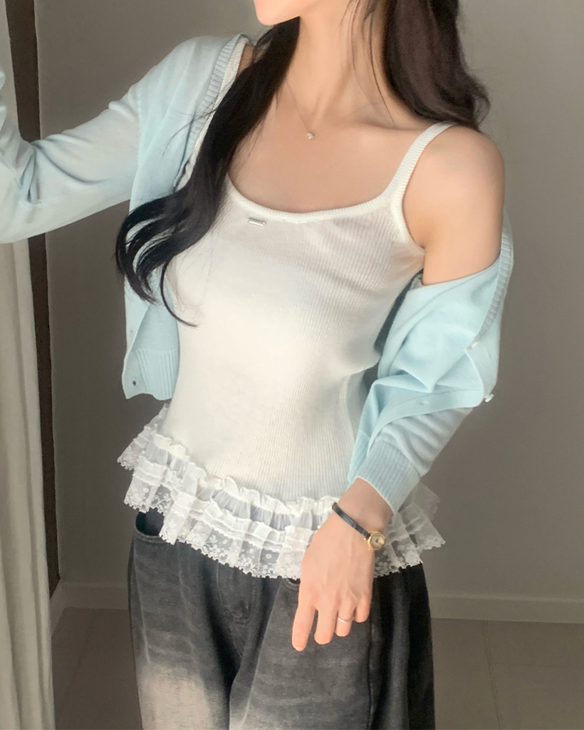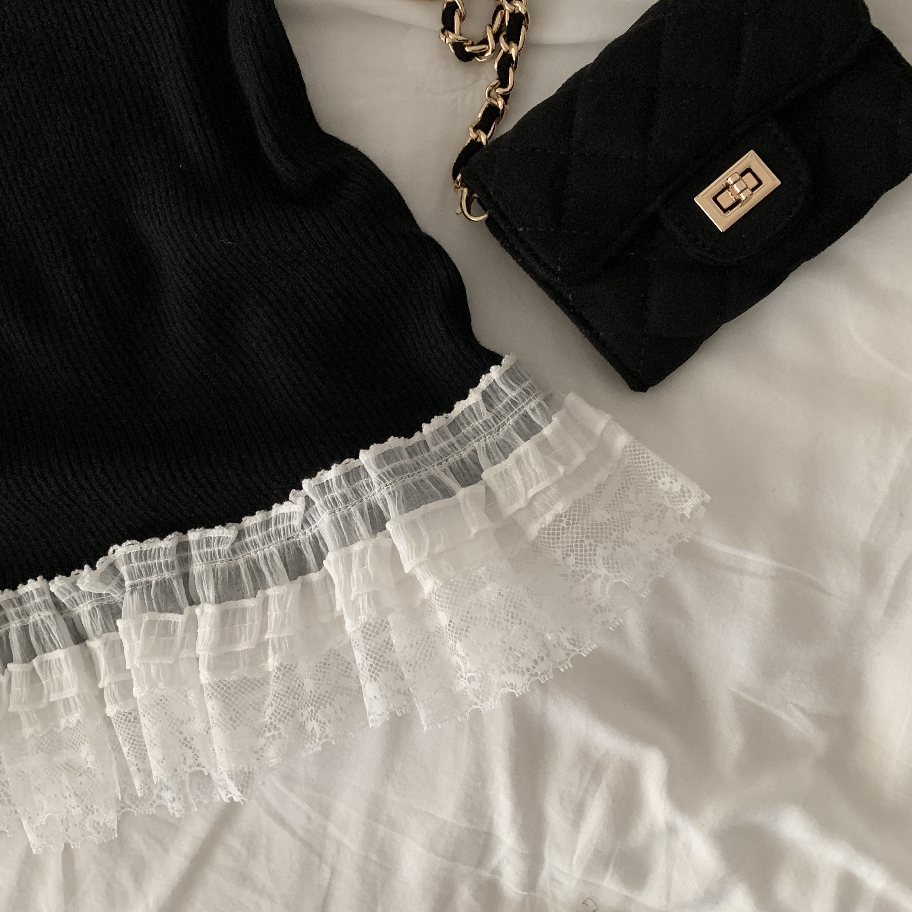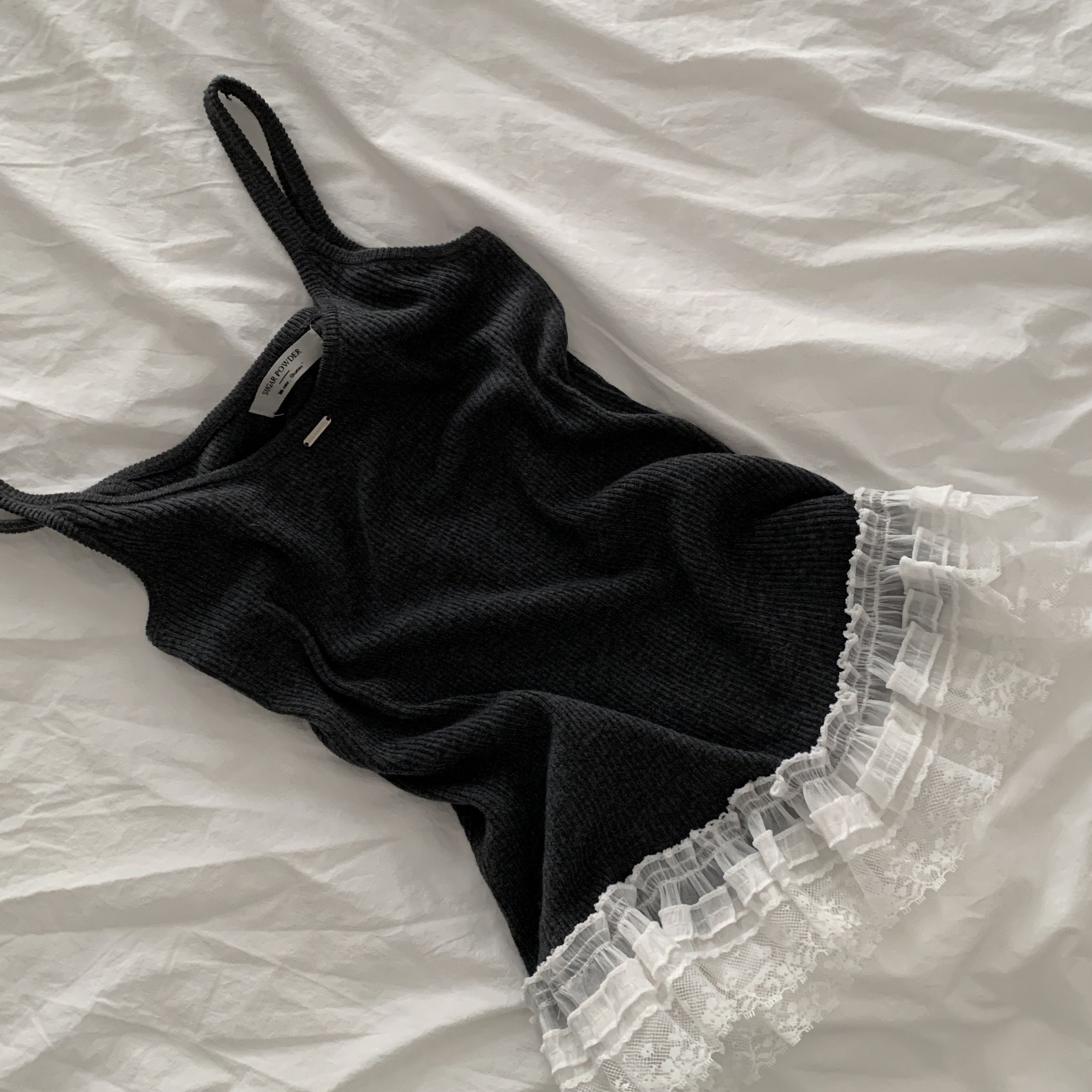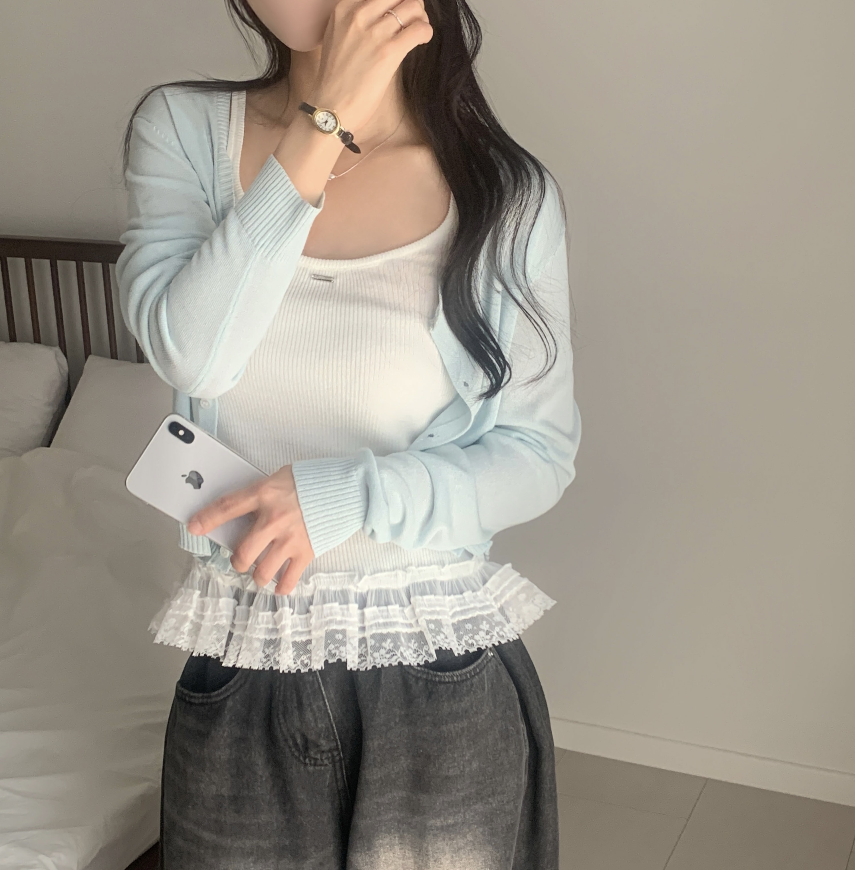 밑단에 레이스프릴 디테일이 있어서 러블리한 아웃핏이 연출되며