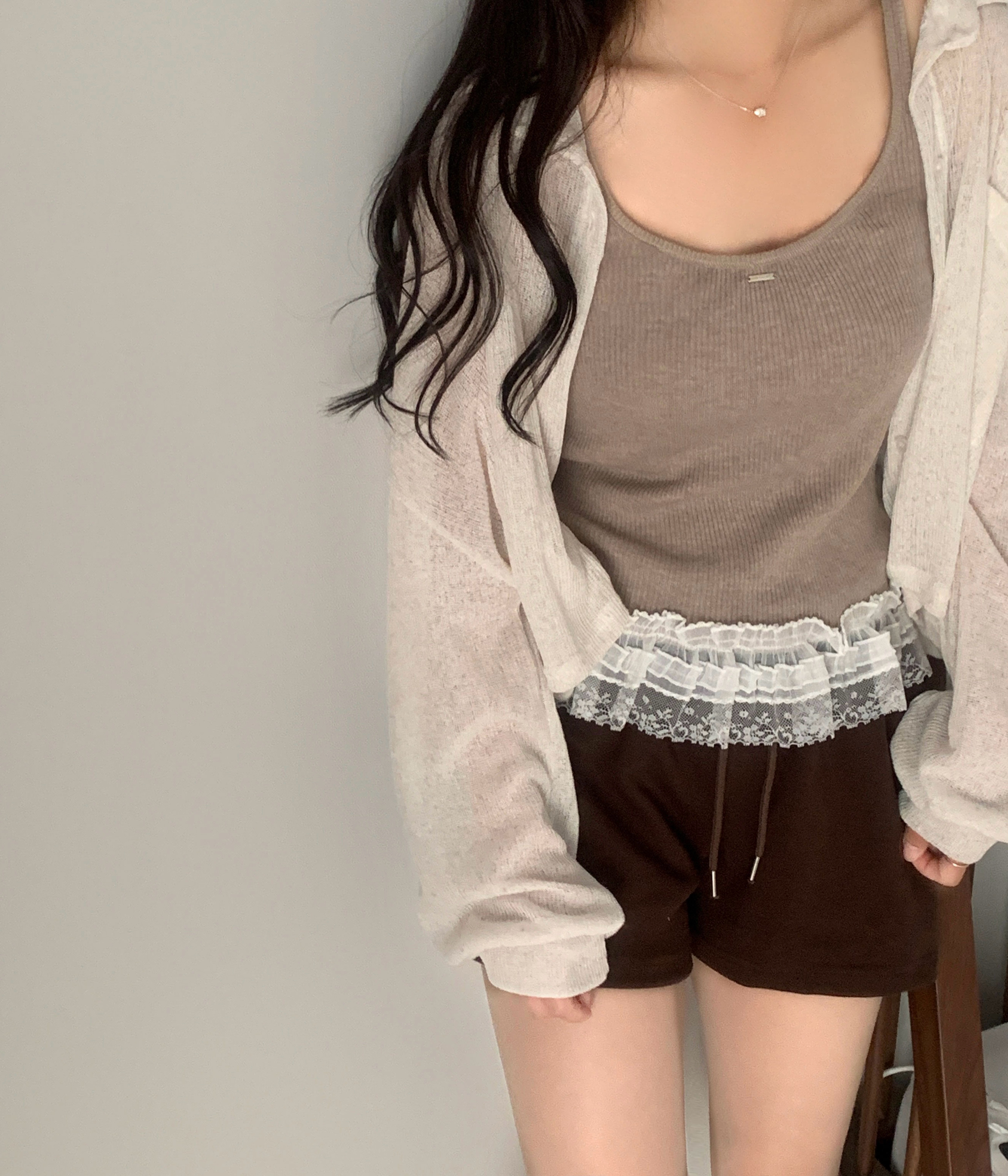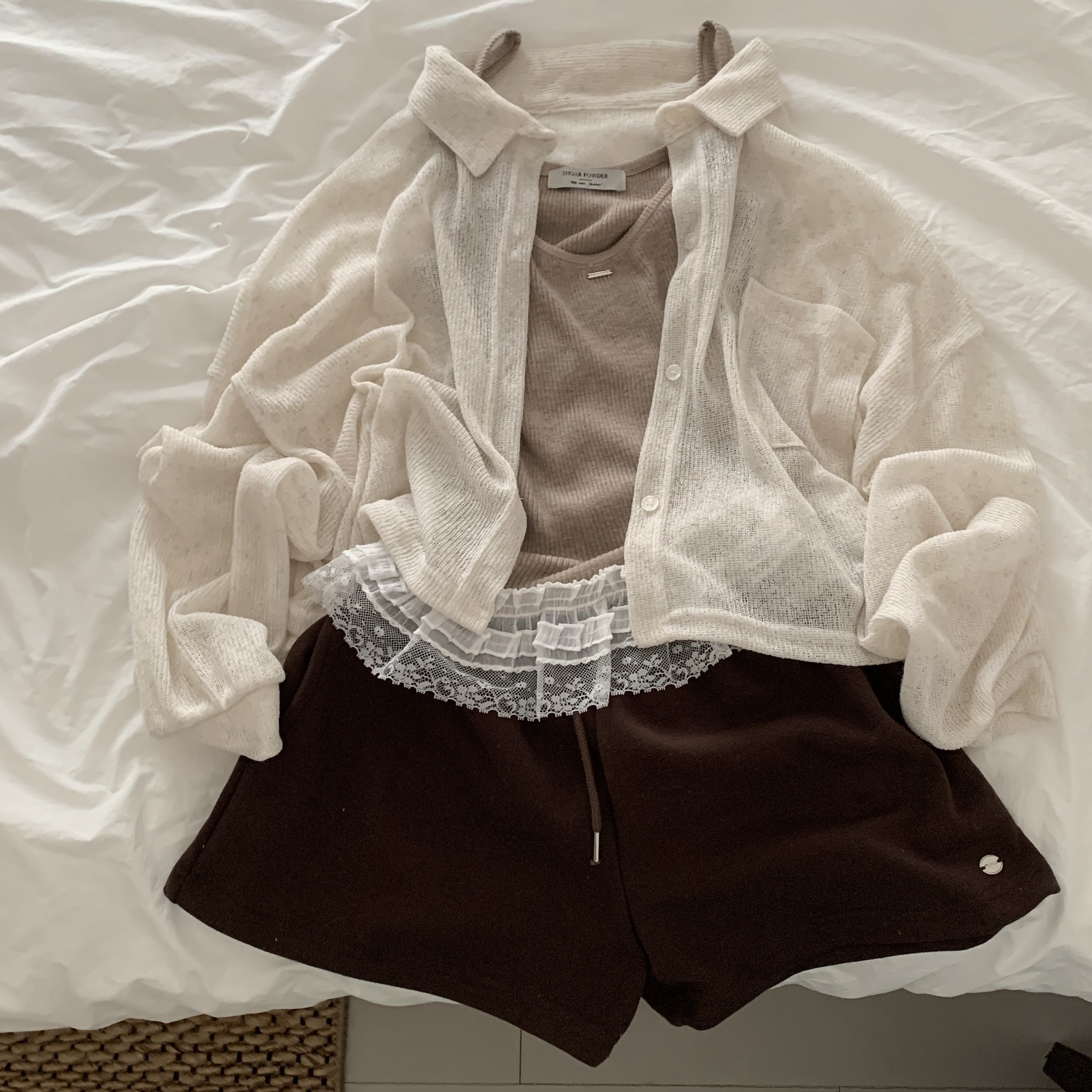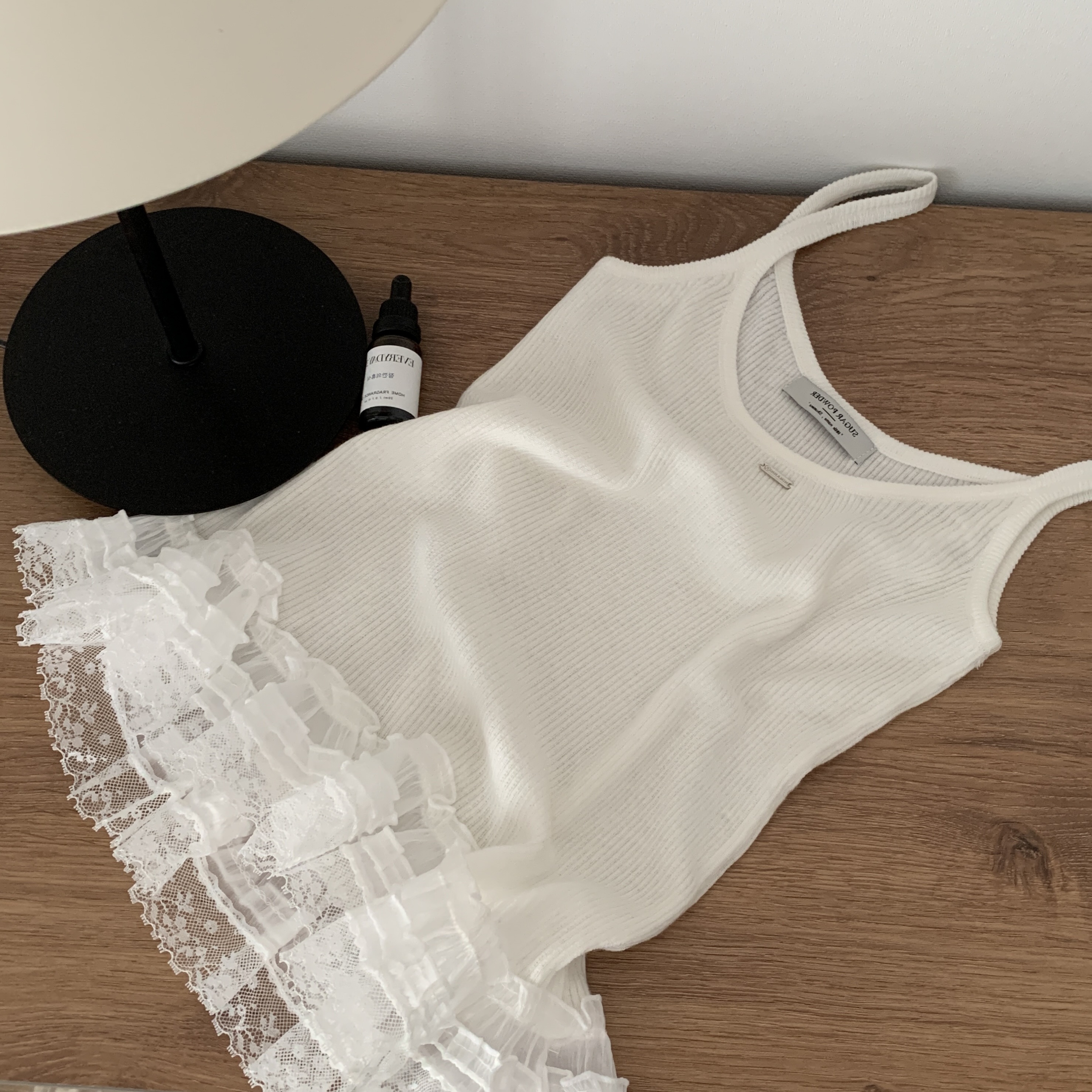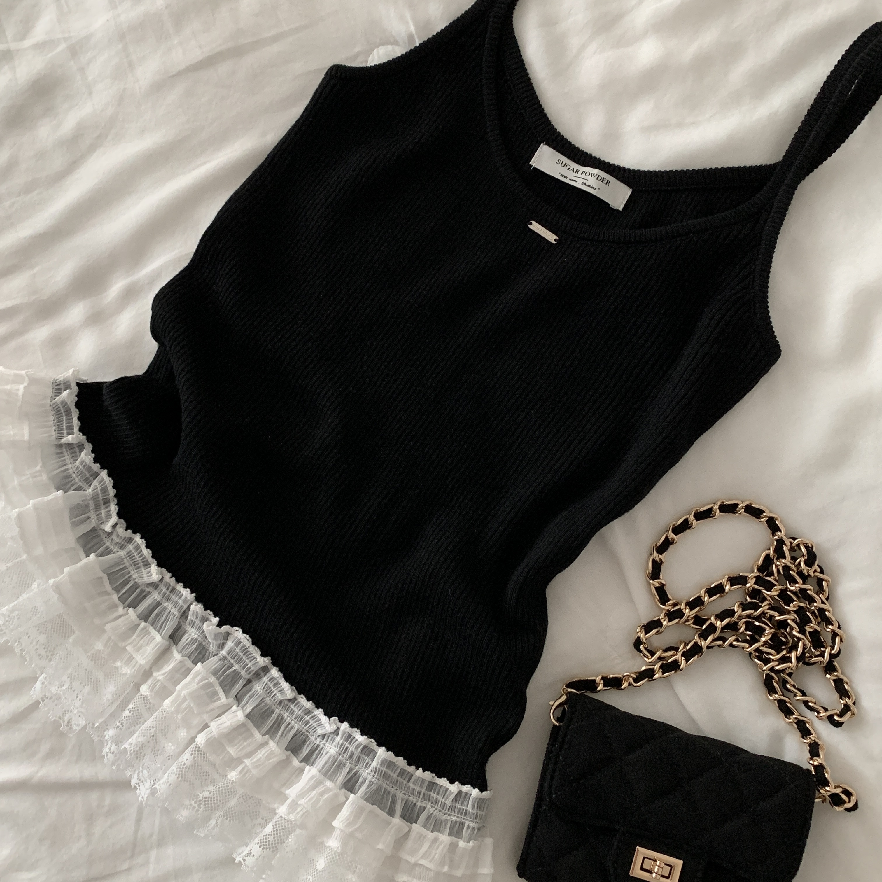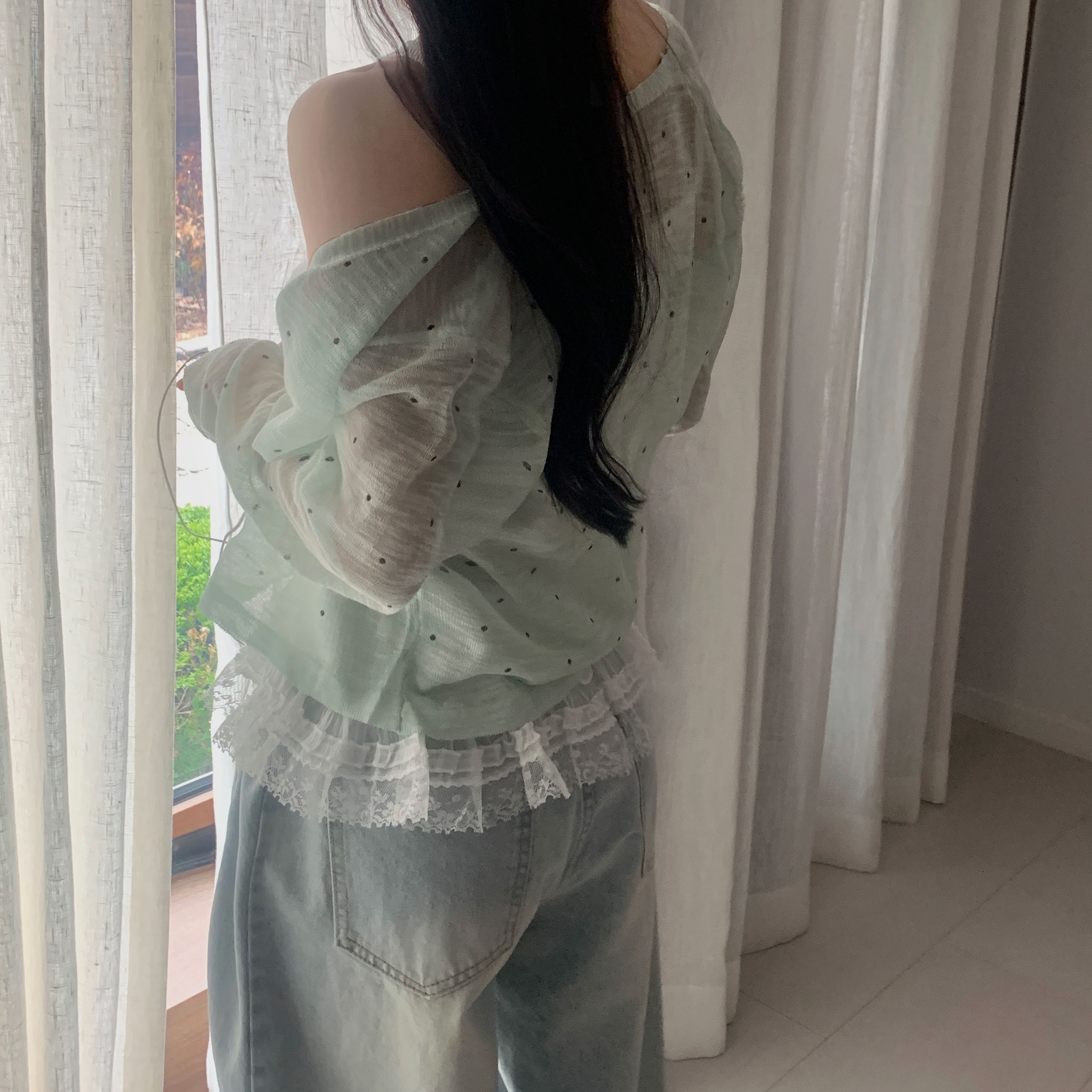 밑단에 레이스프릴 디테일이 있어서 러블리한 아웃핏이 연출되며