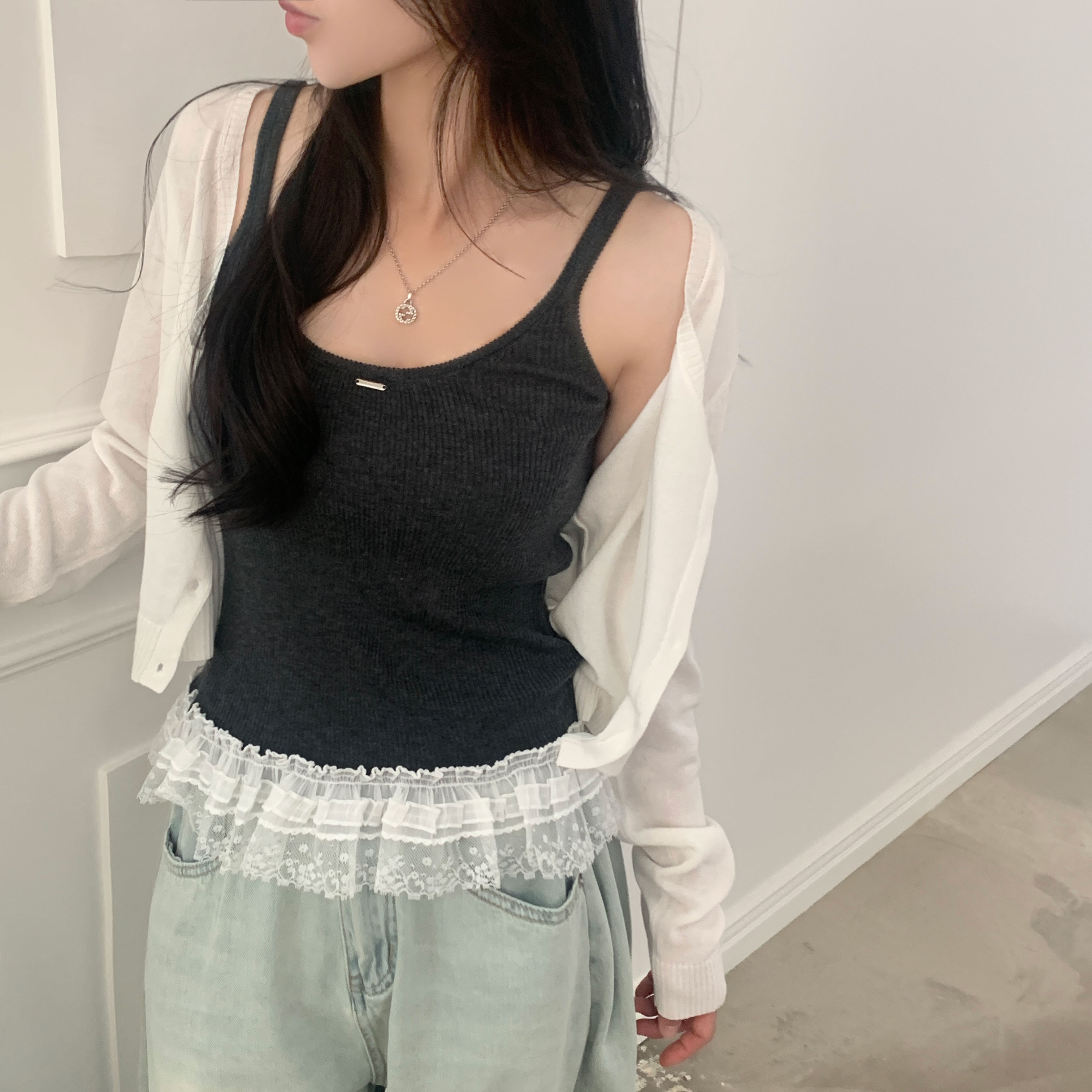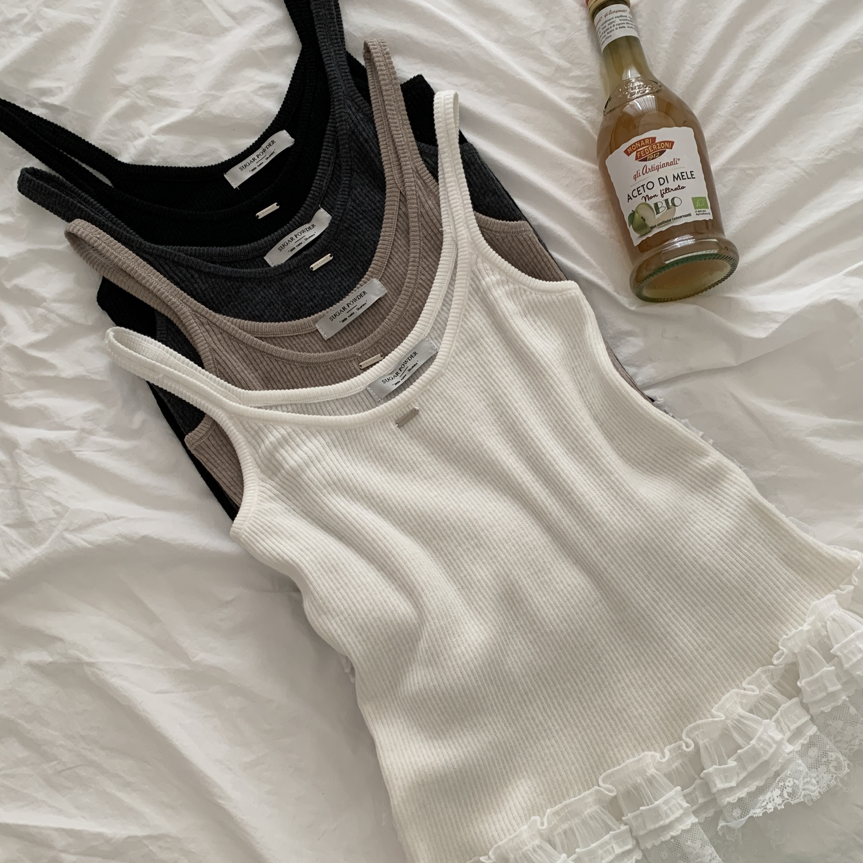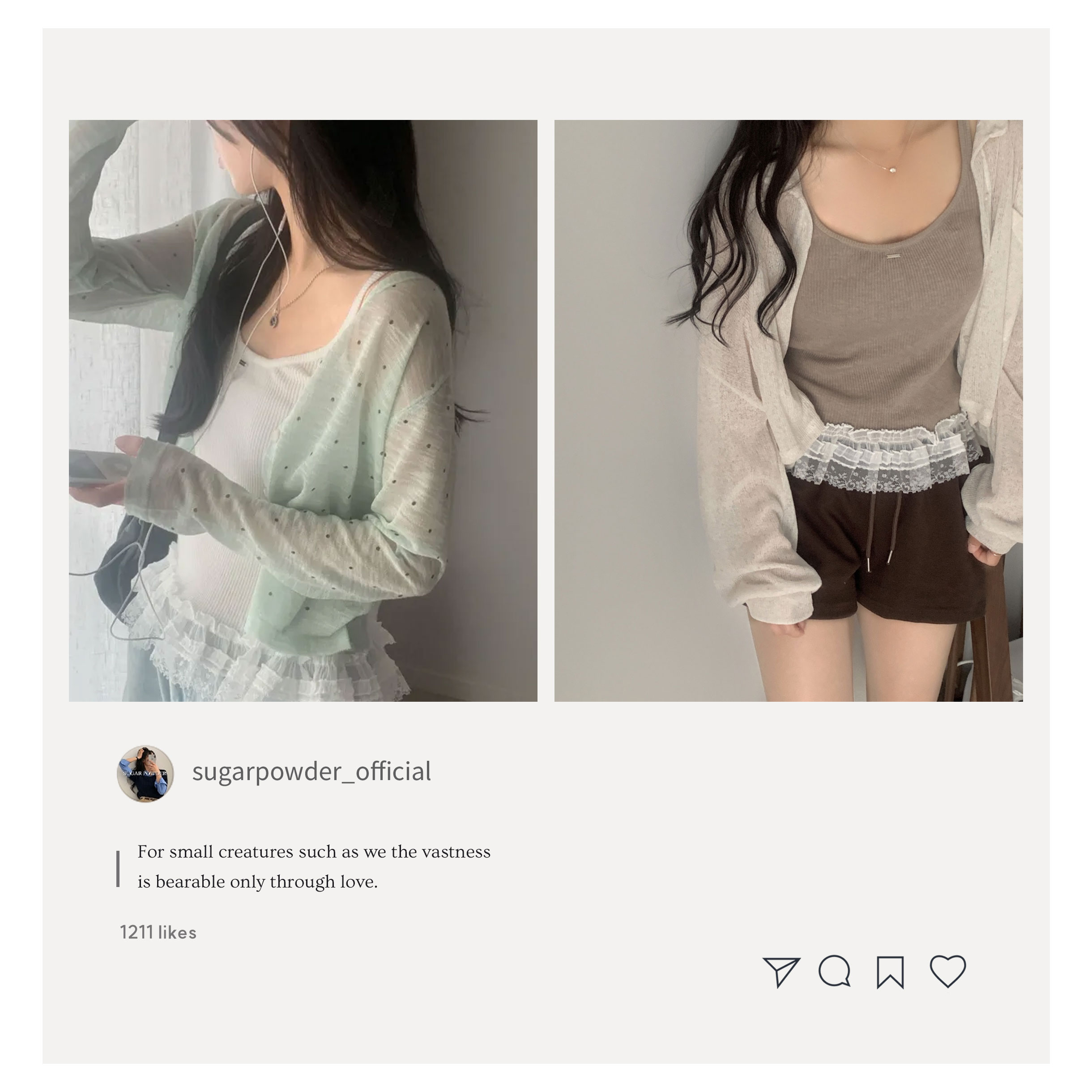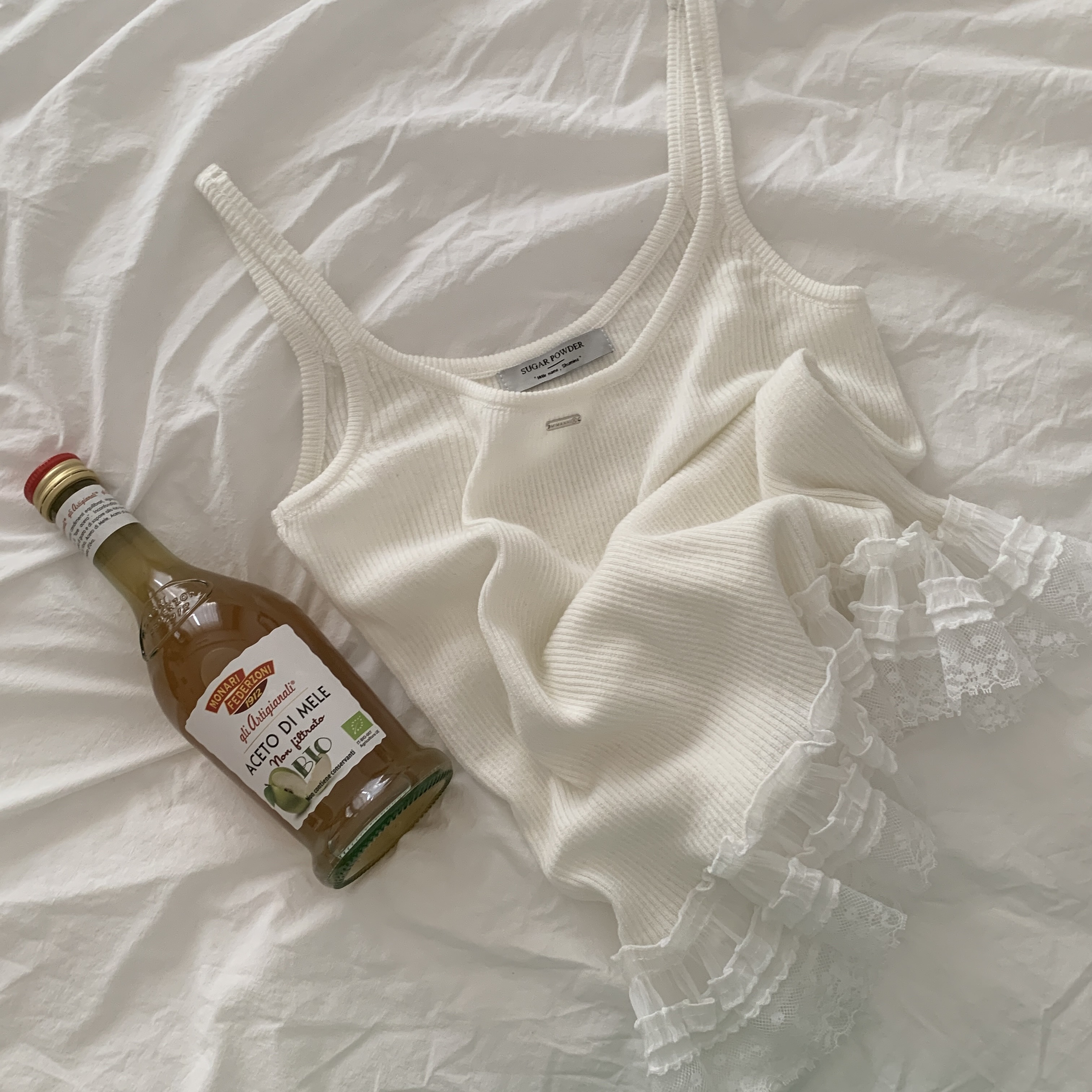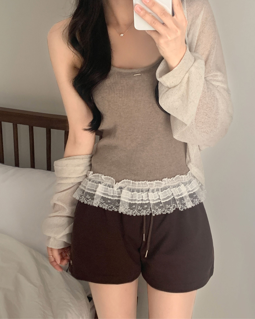 밑단에 레이스프릴 디테일이 있어서 러블리한 아웃핏이 연출되며