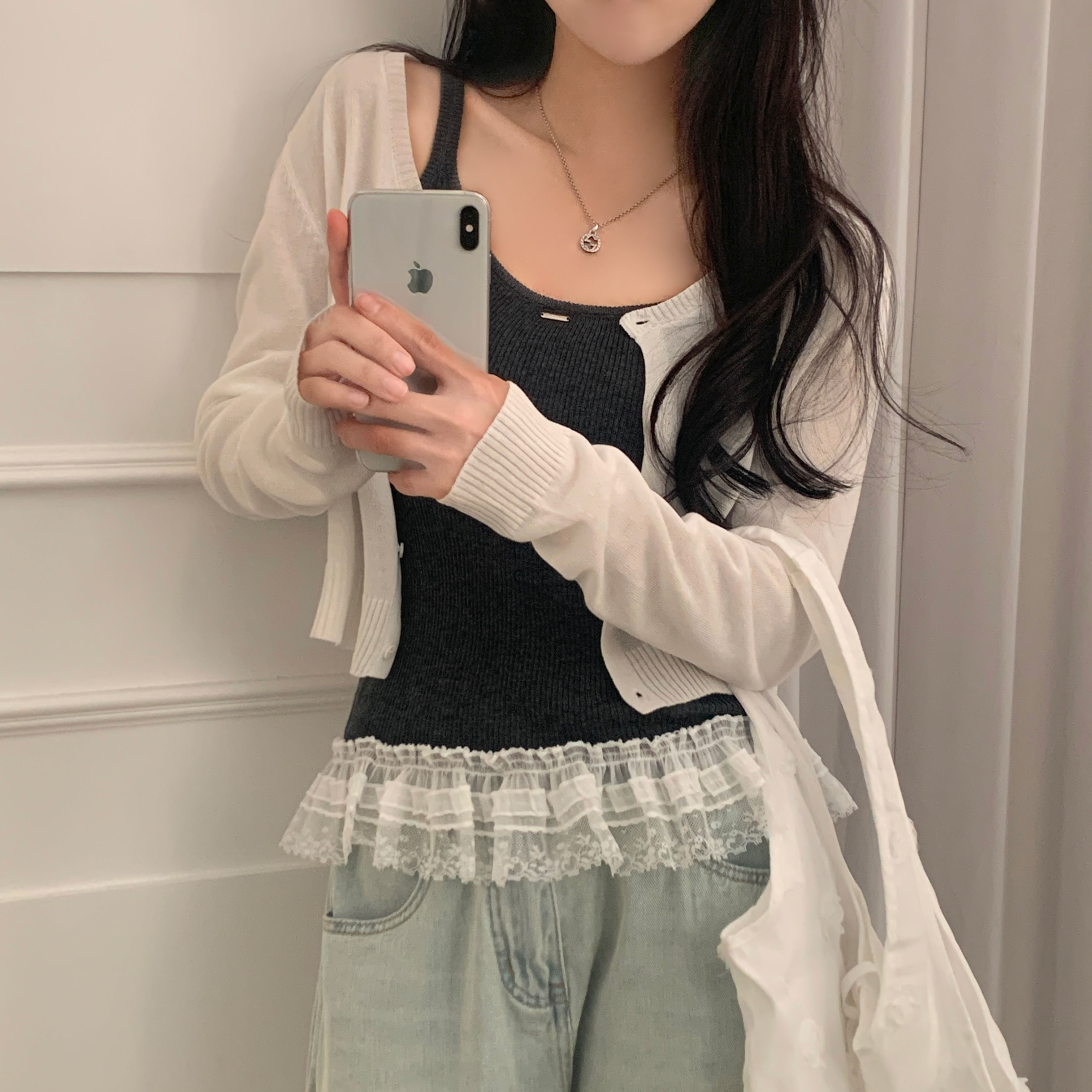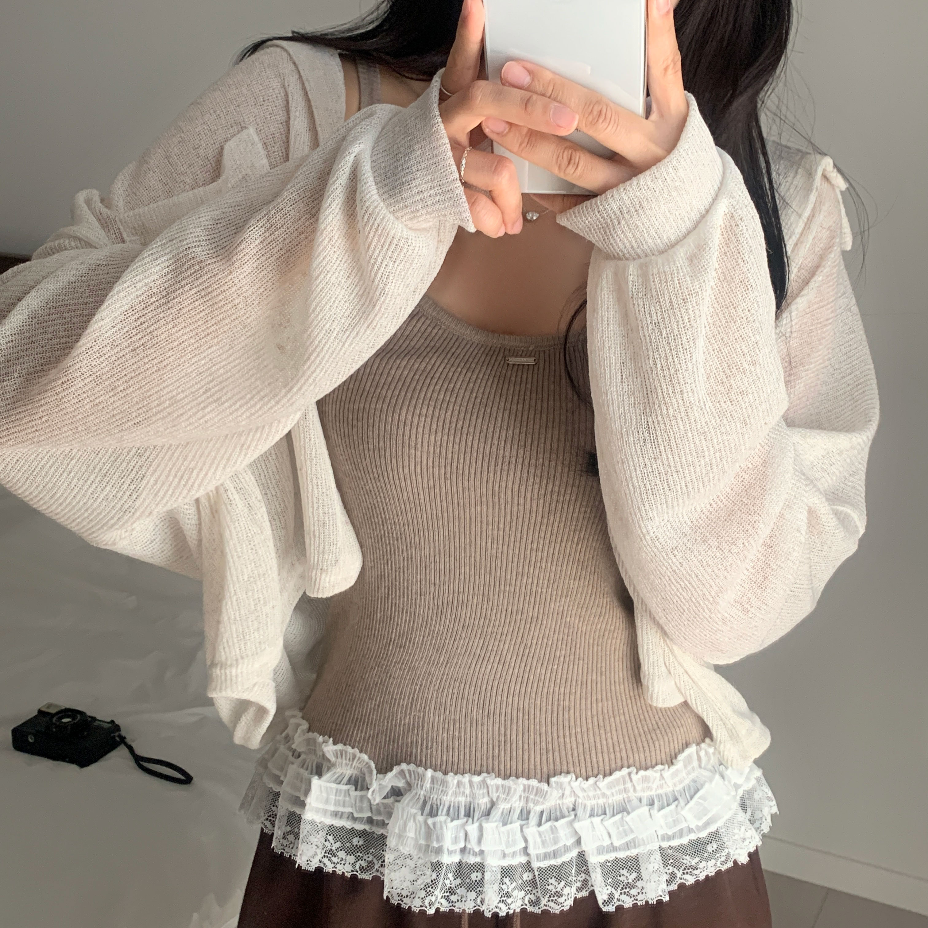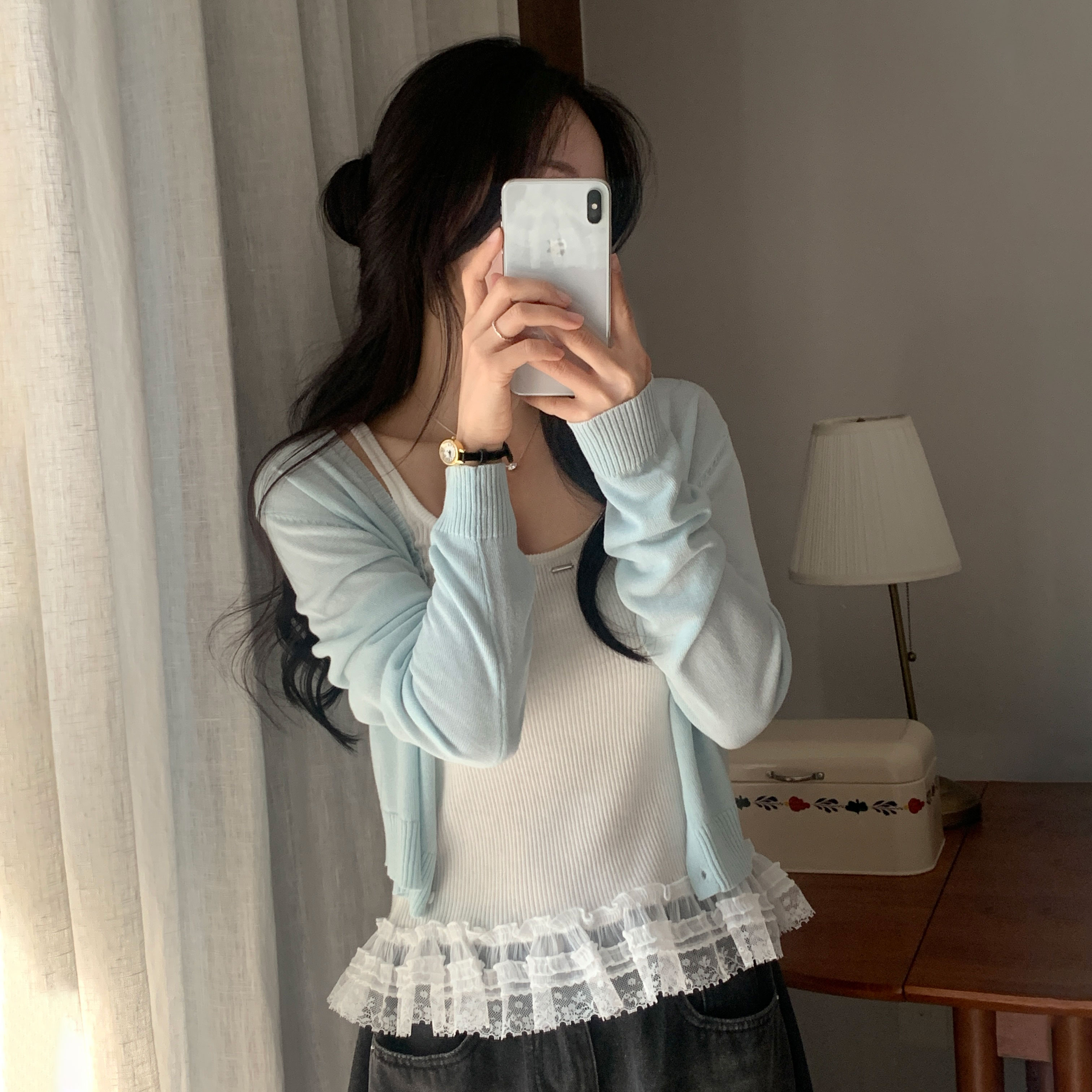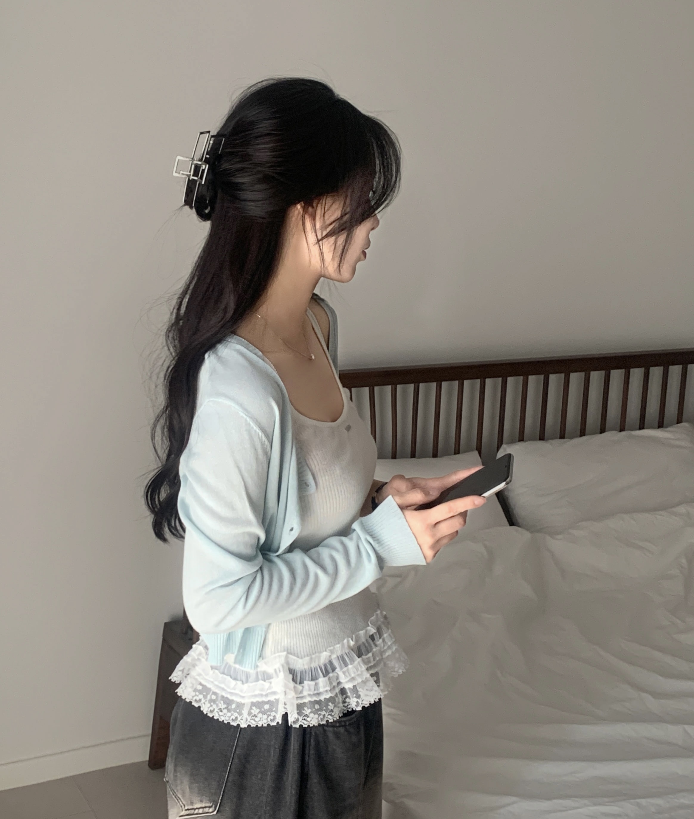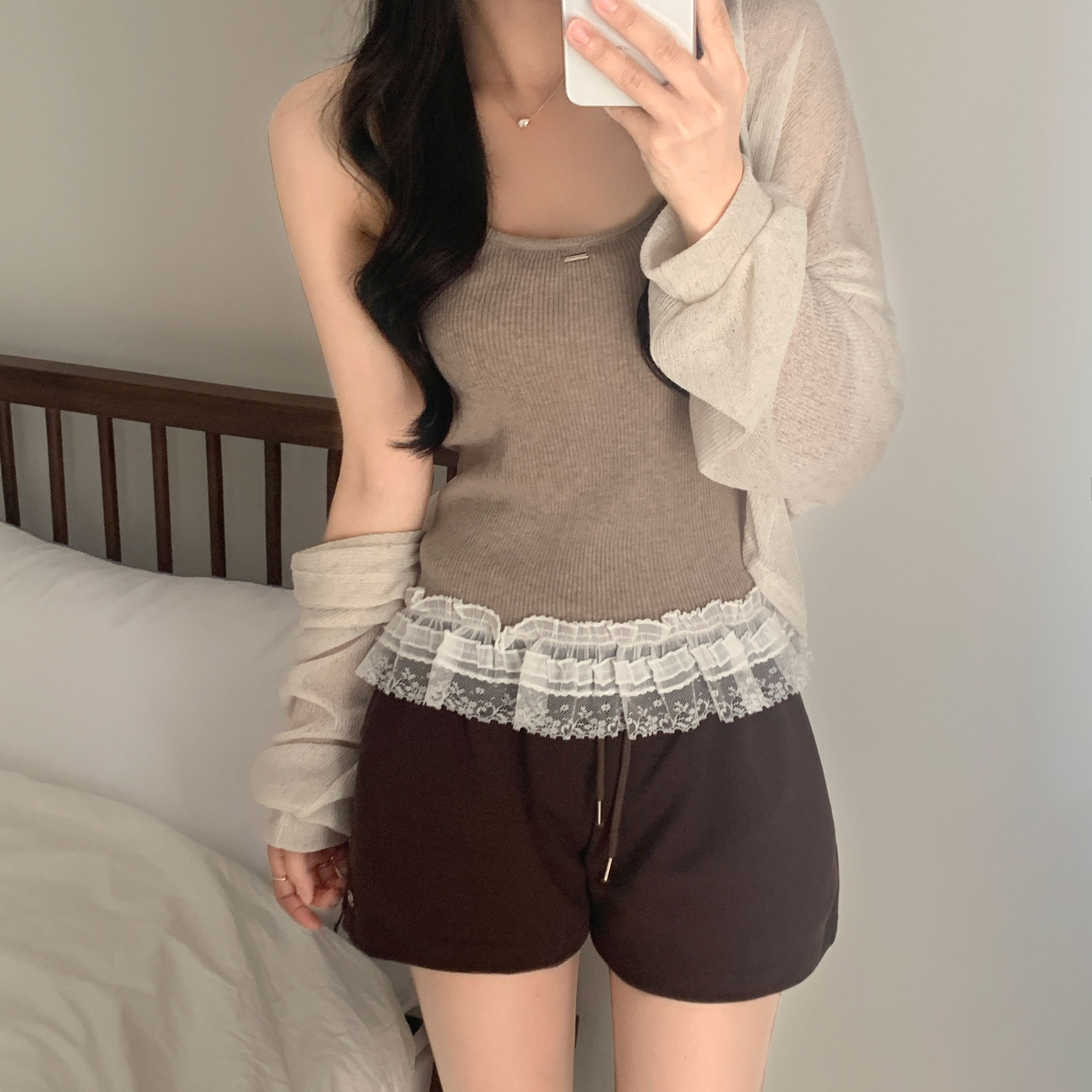 밑단에 레이스프릴 디테일이 있어서 러블리한 아웃핏이 연출되며