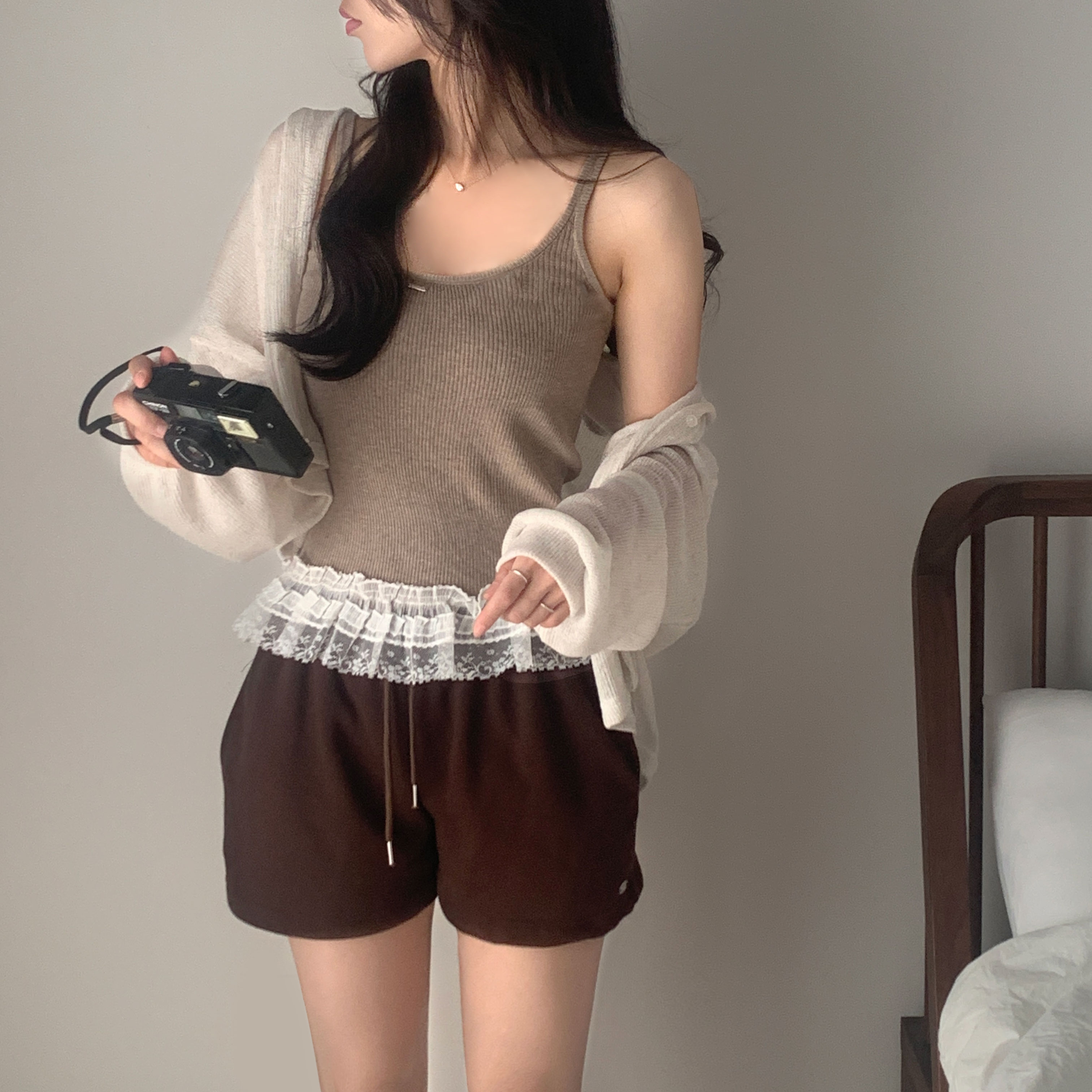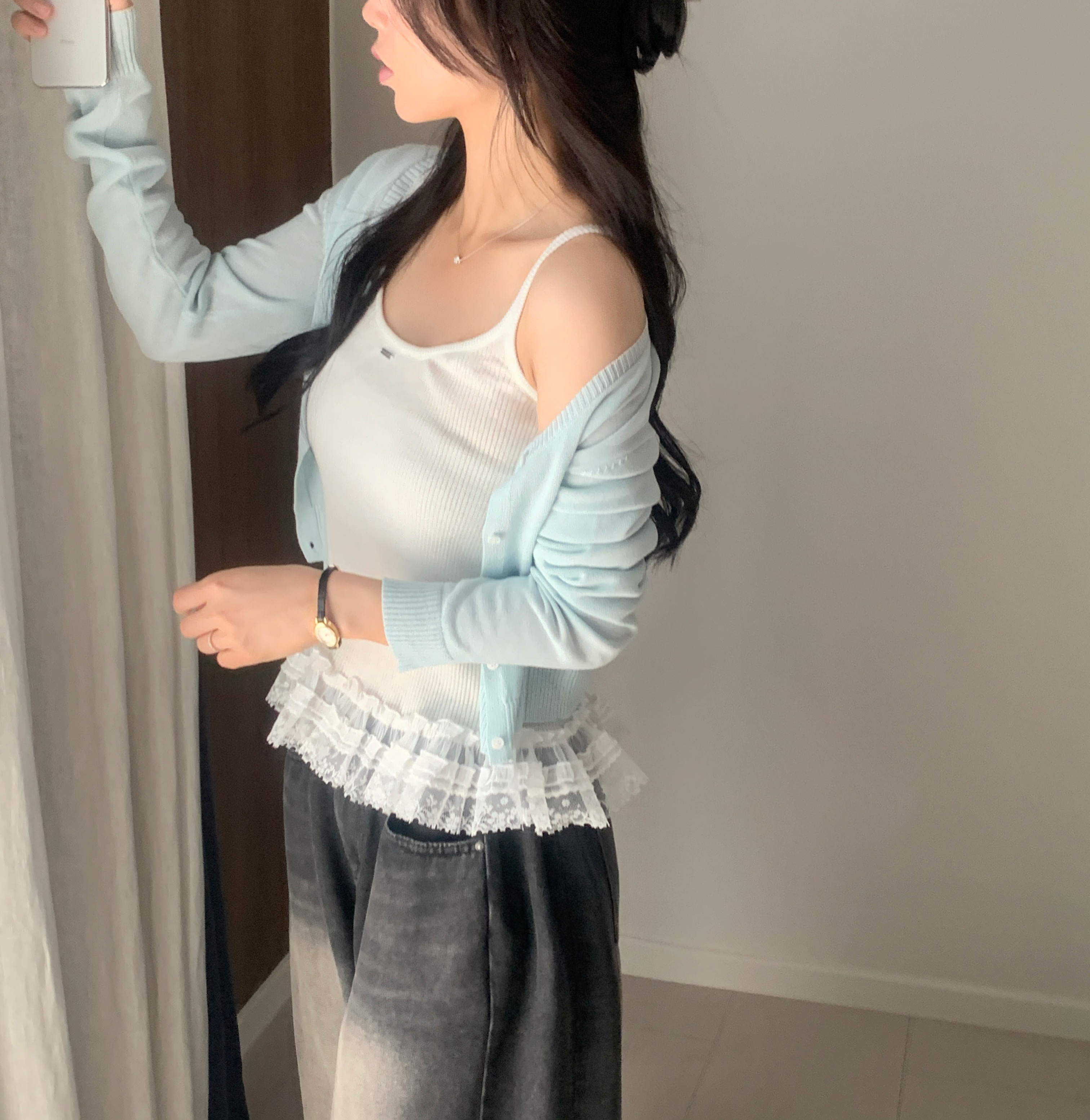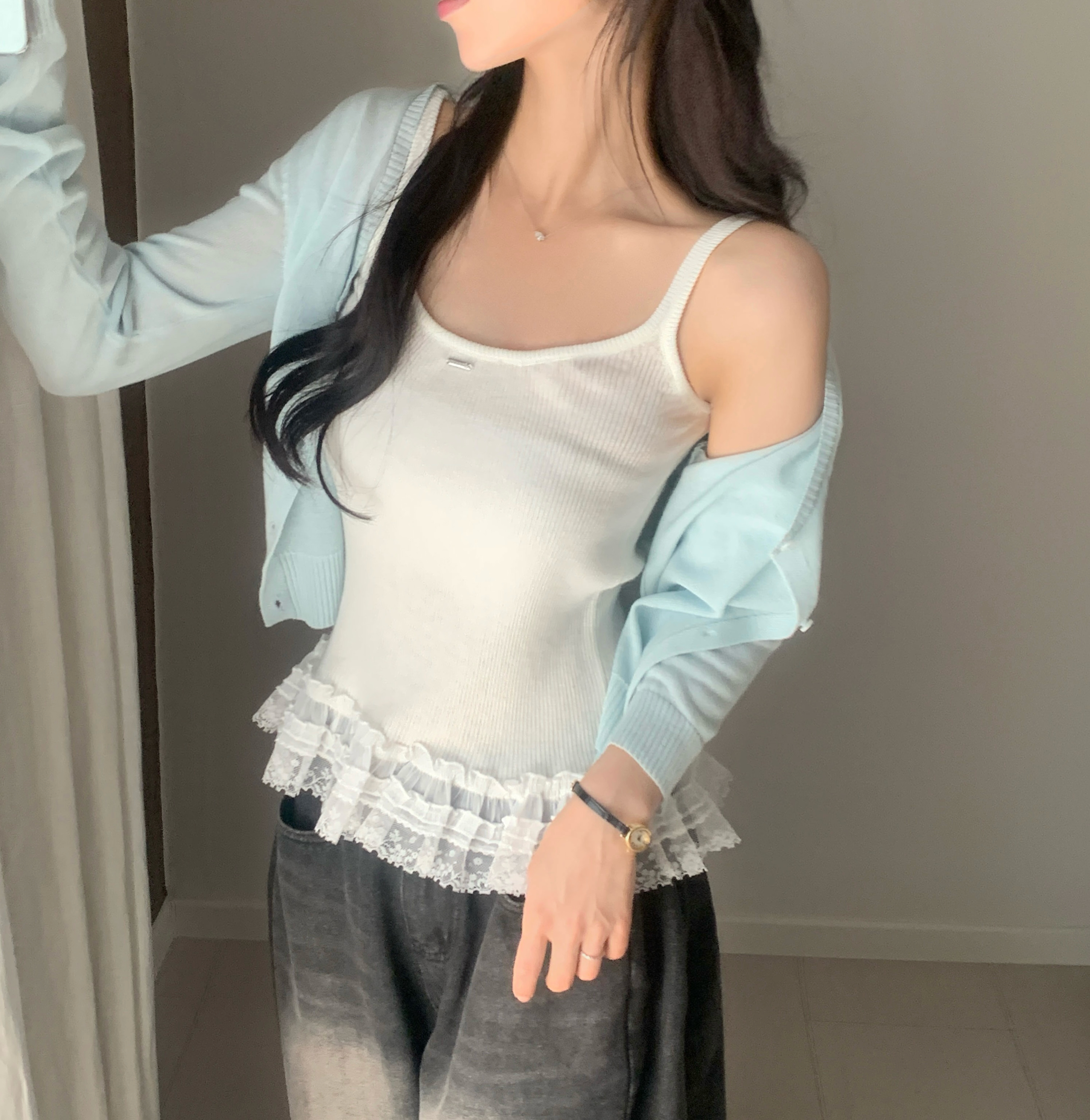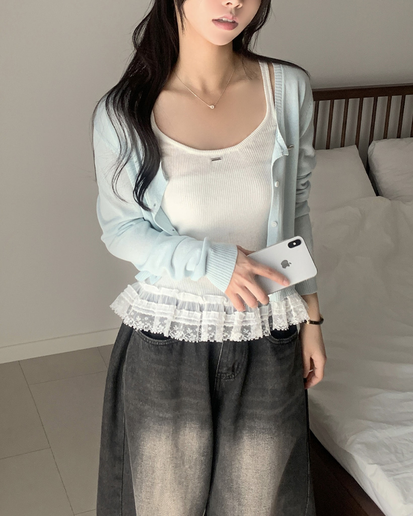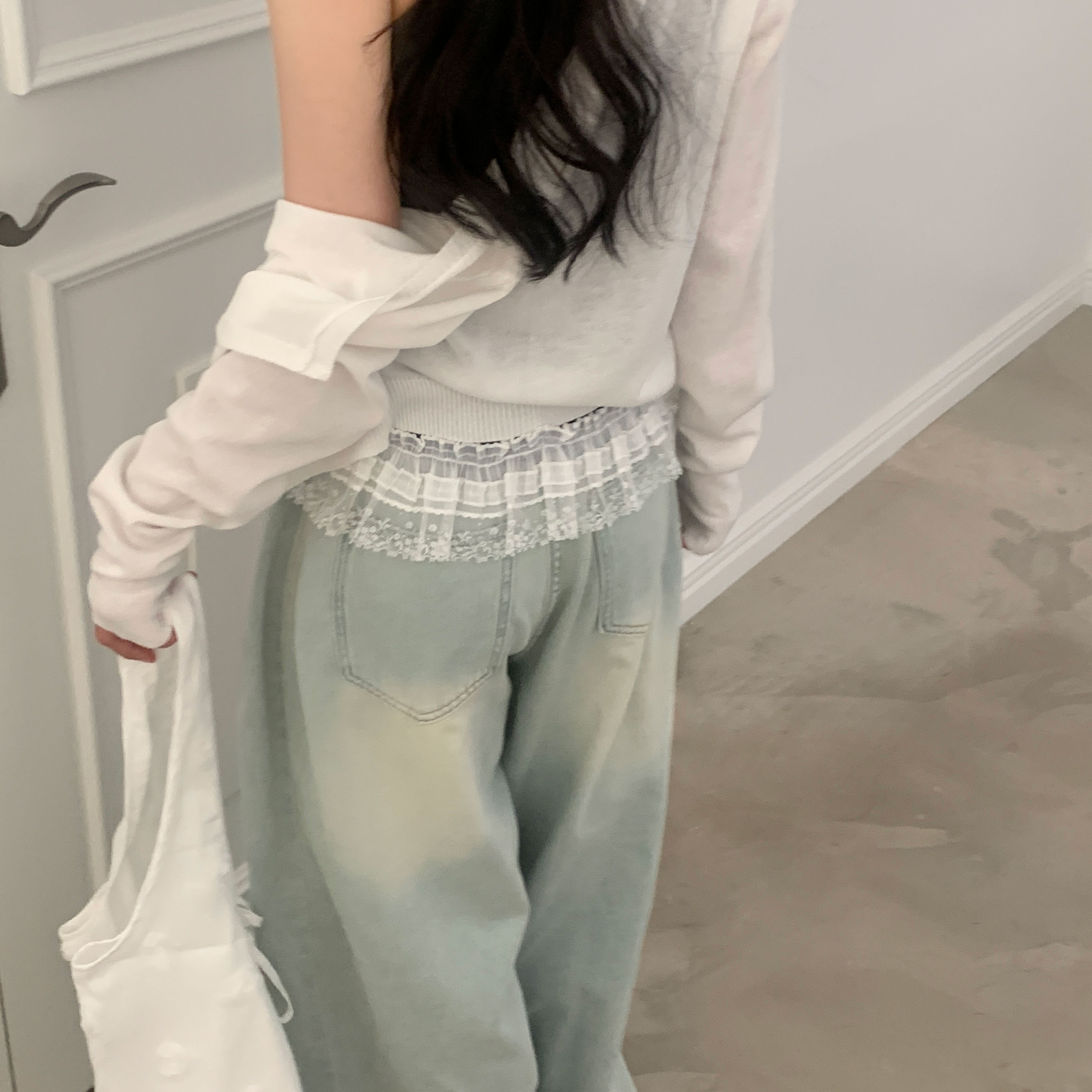 밑단에 레이스프릴 디테일이 있어서 러블리한 아웃핏이 연출되며