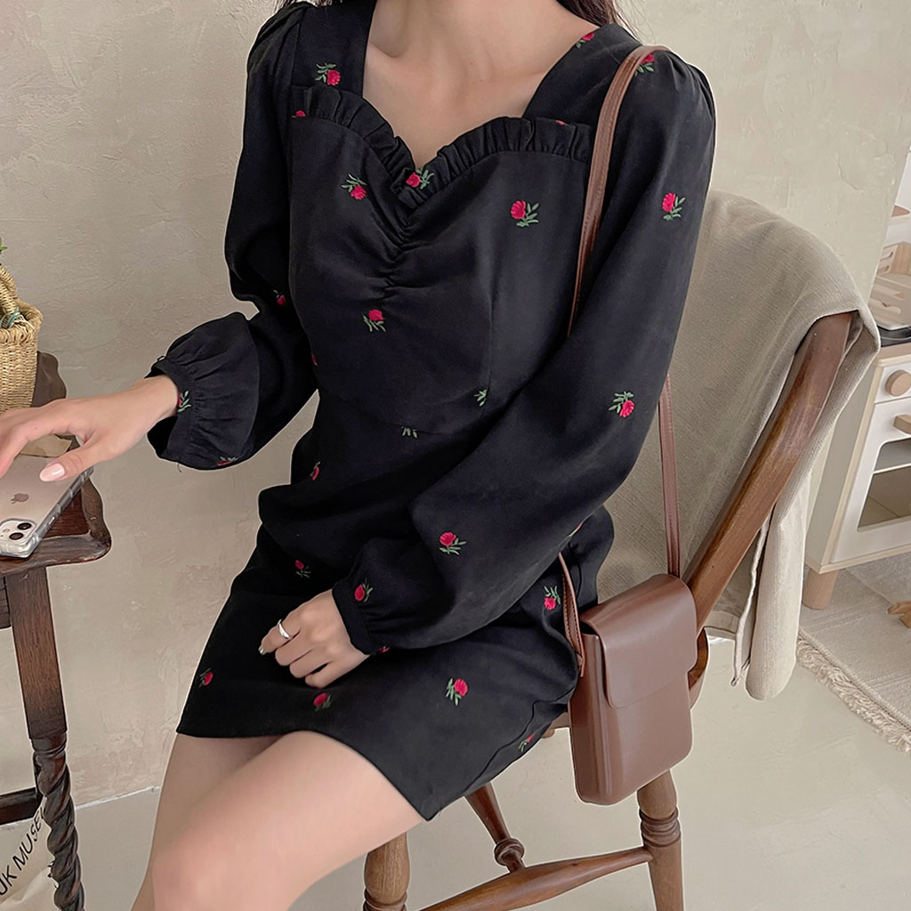 シックなブラックに赤いフラワー刺繍をあしらって