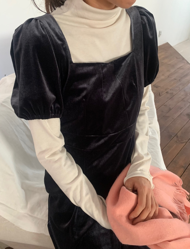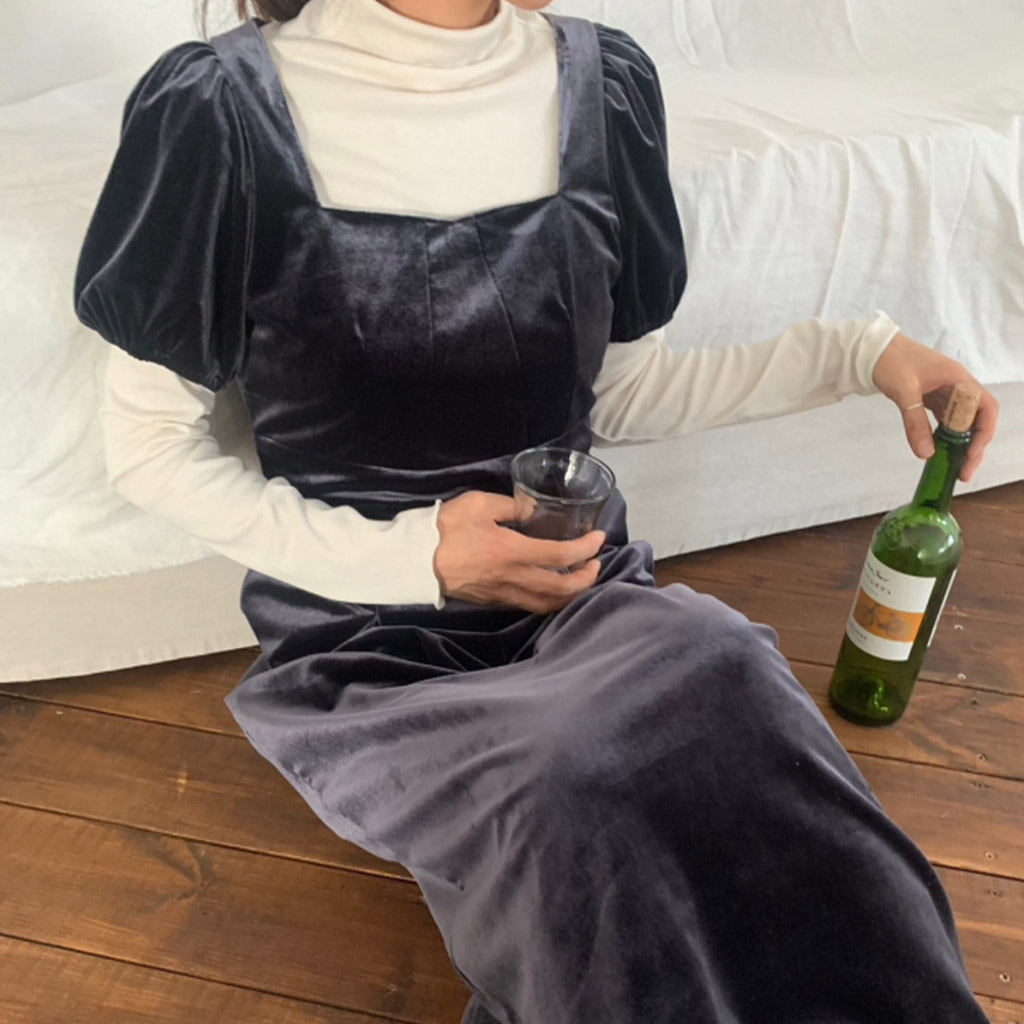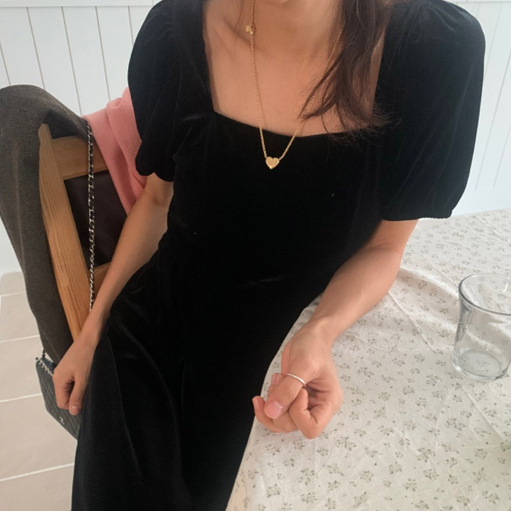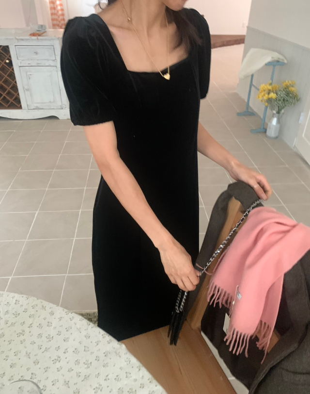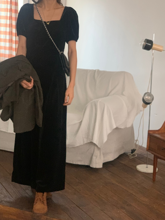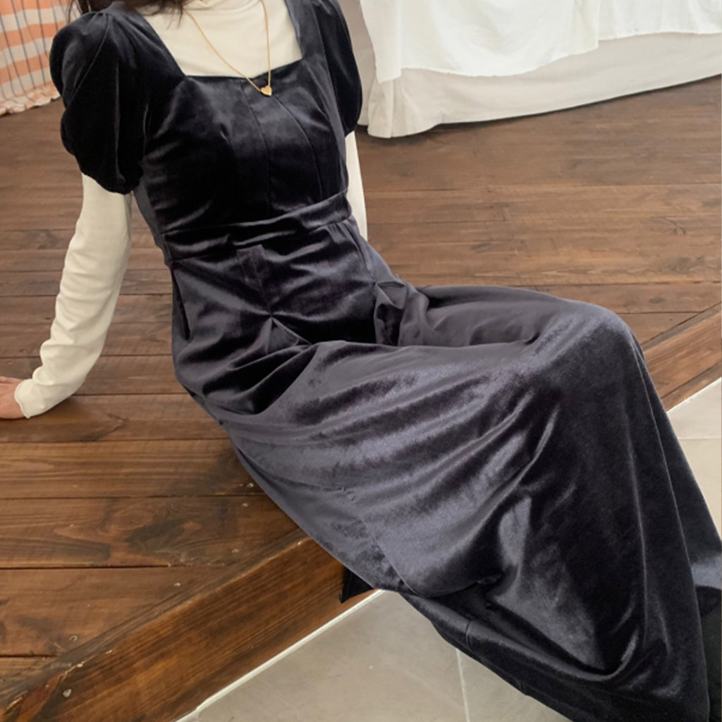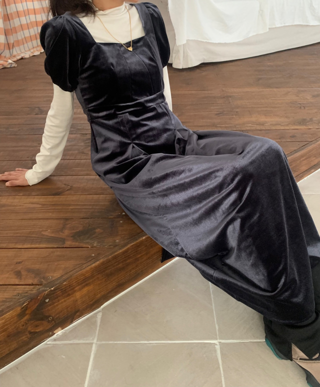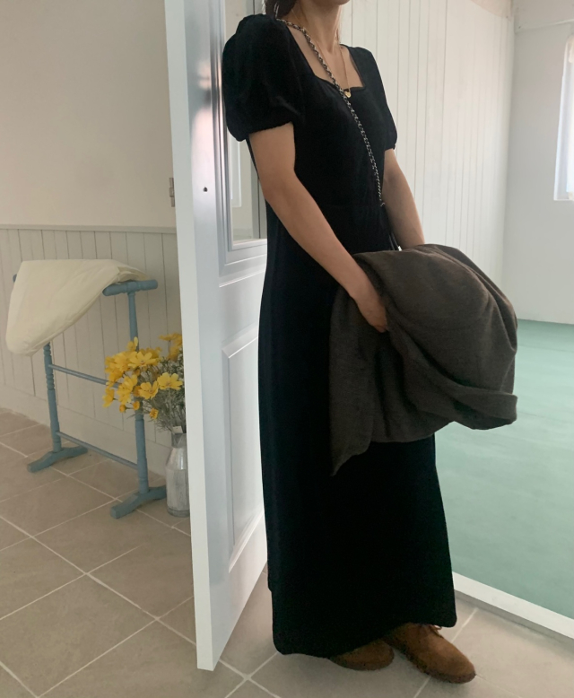 LadyベルベットスクエアネックパフHラインロングワンピース (2c)