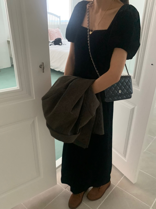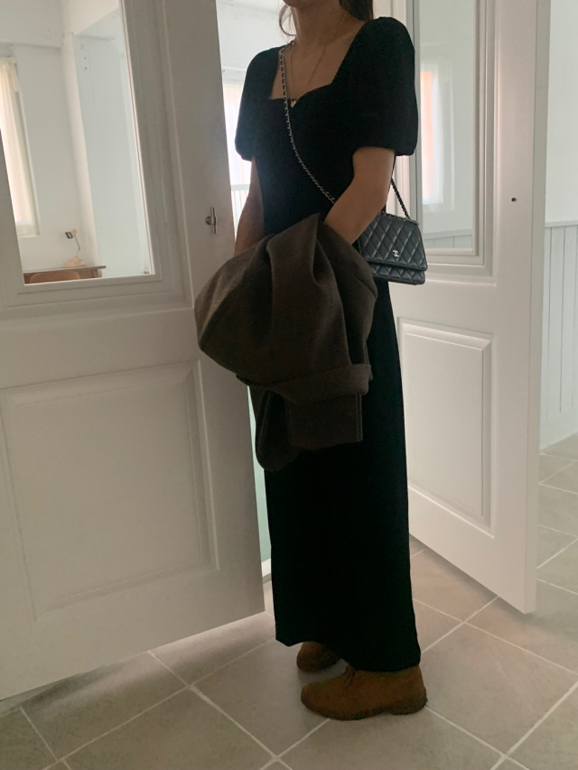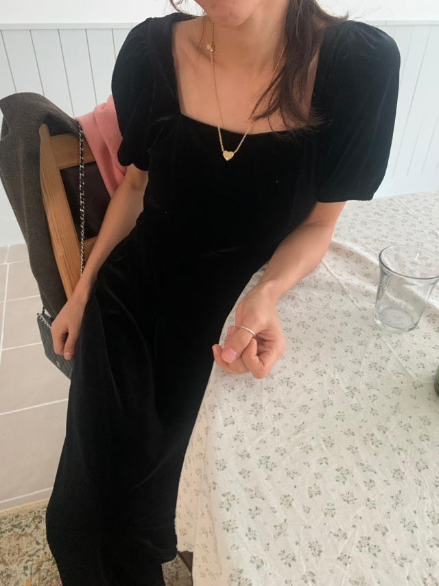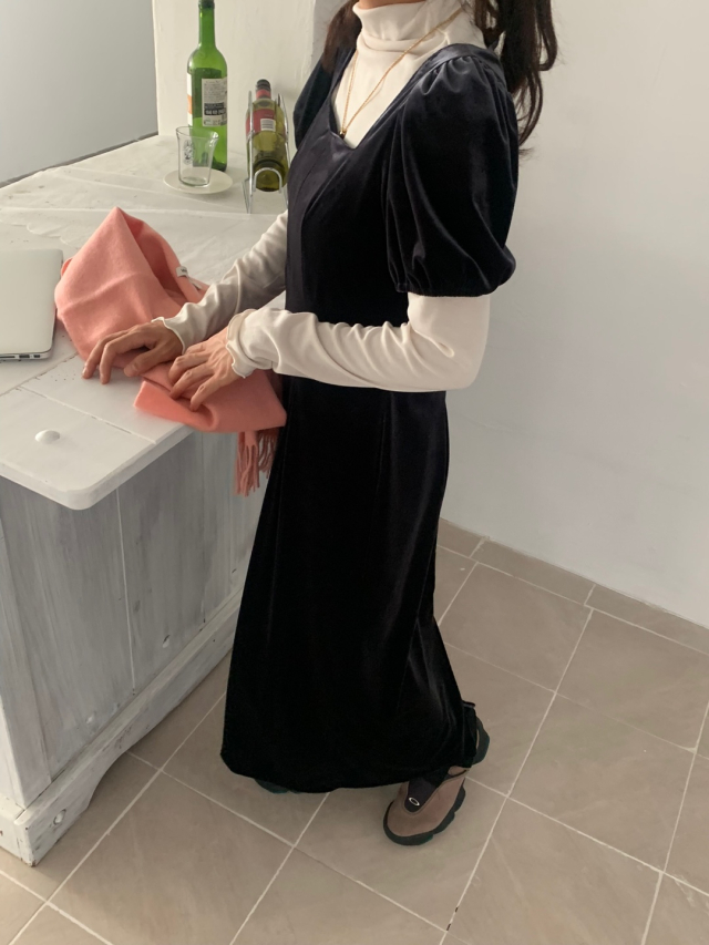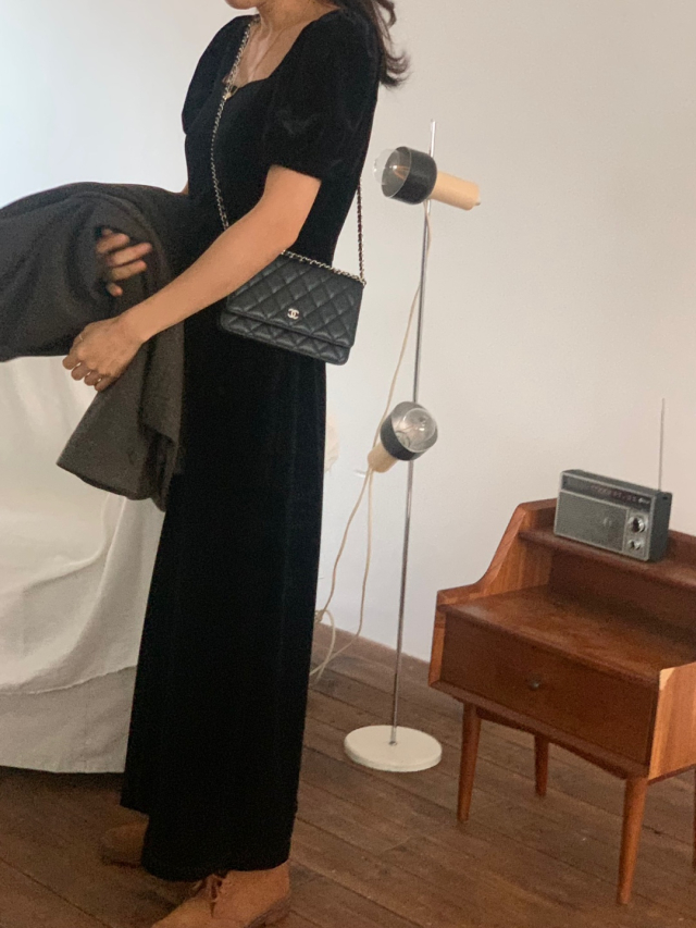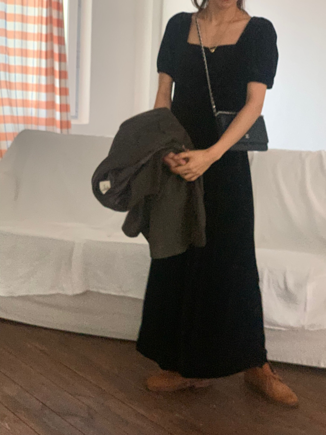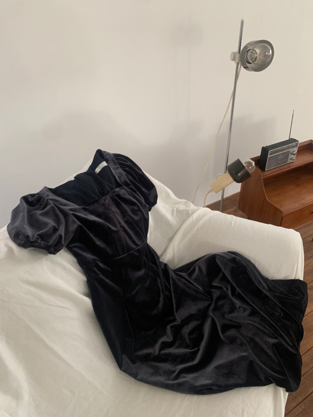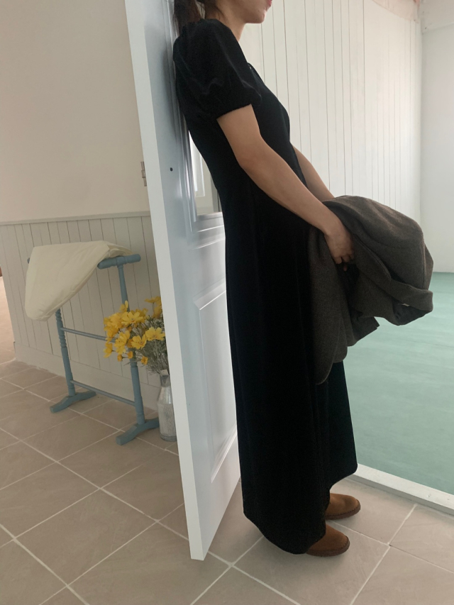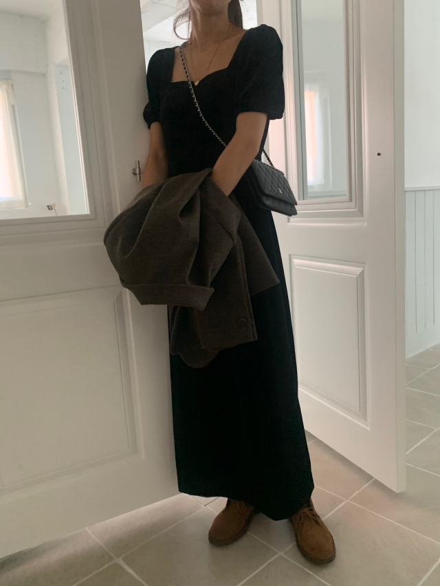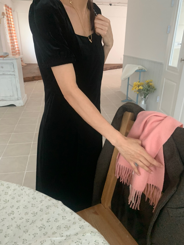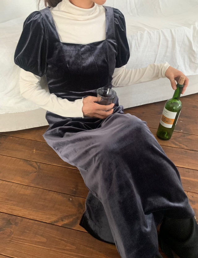 LadyベルベットスクエアネックパフHラインロングワンピース (2c)