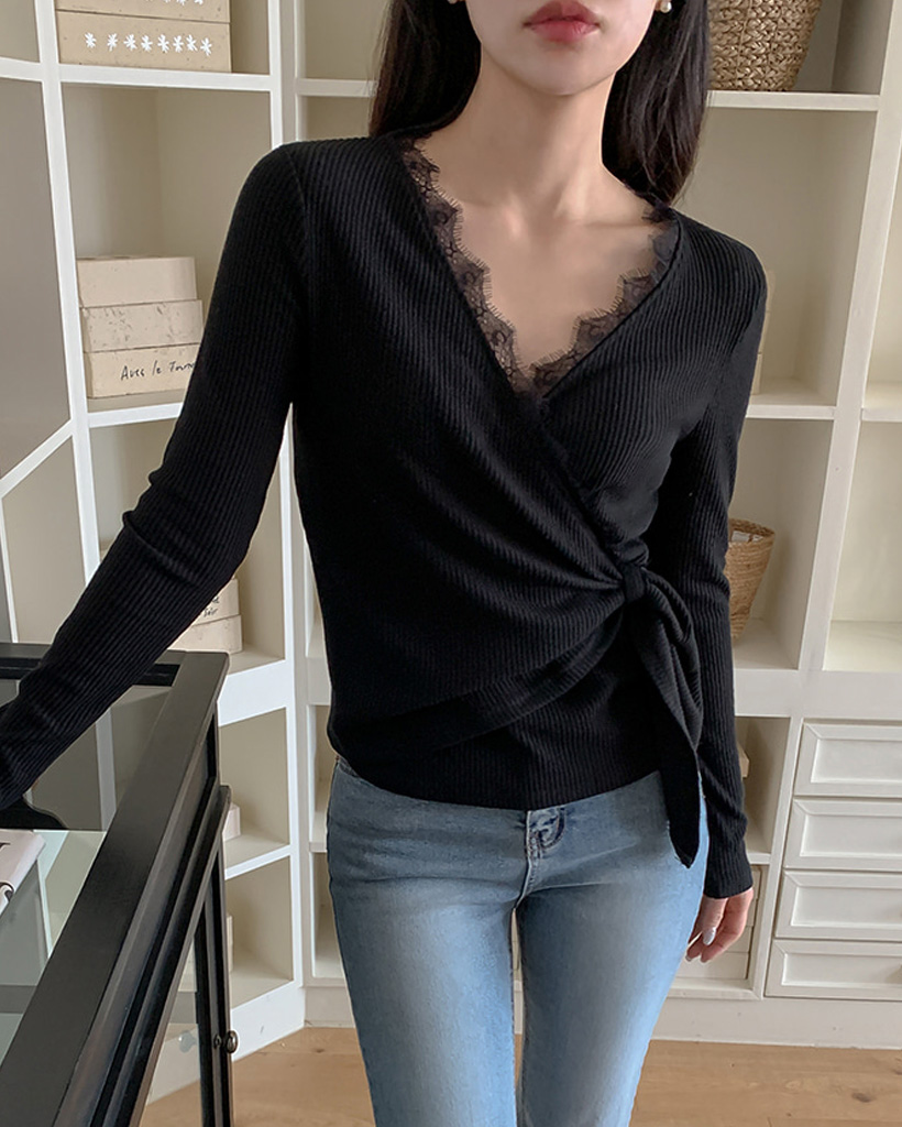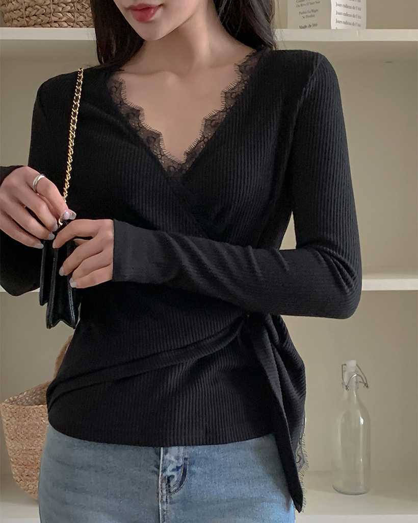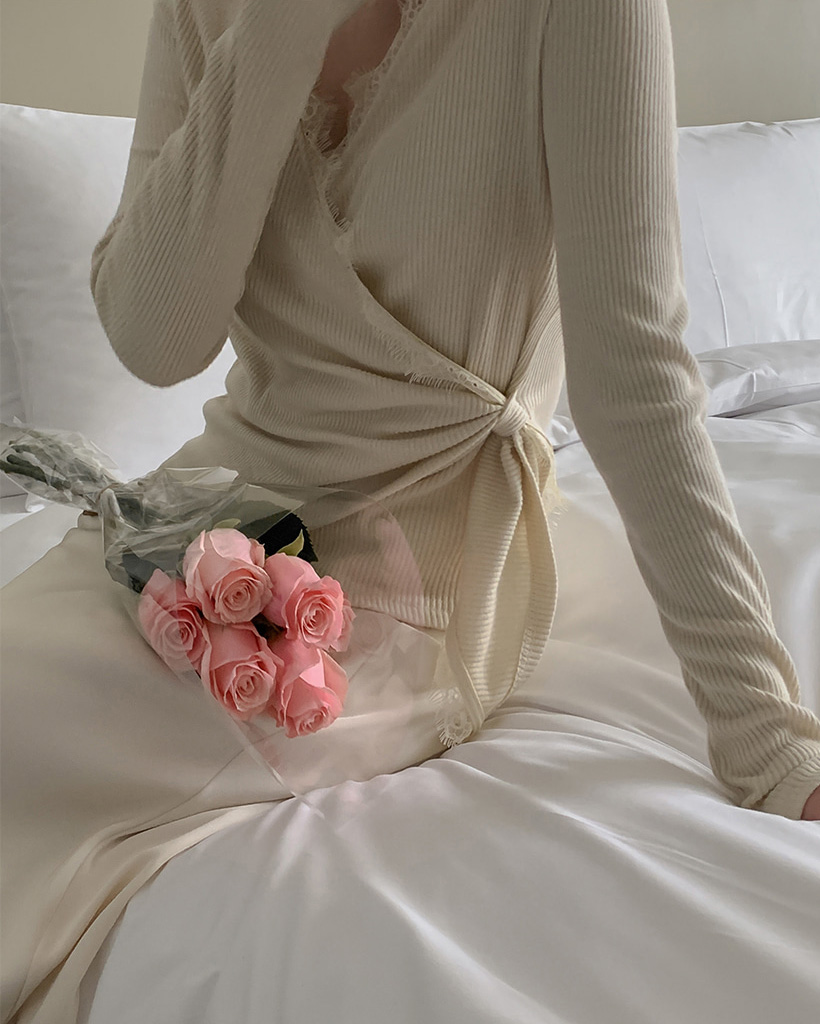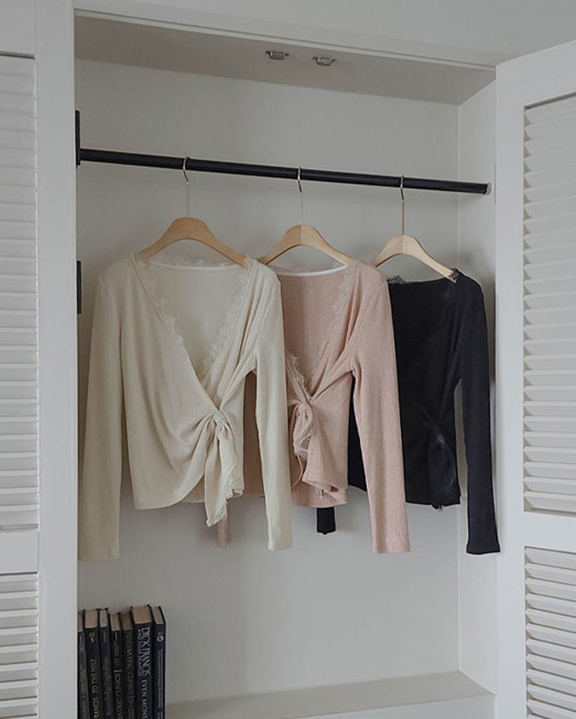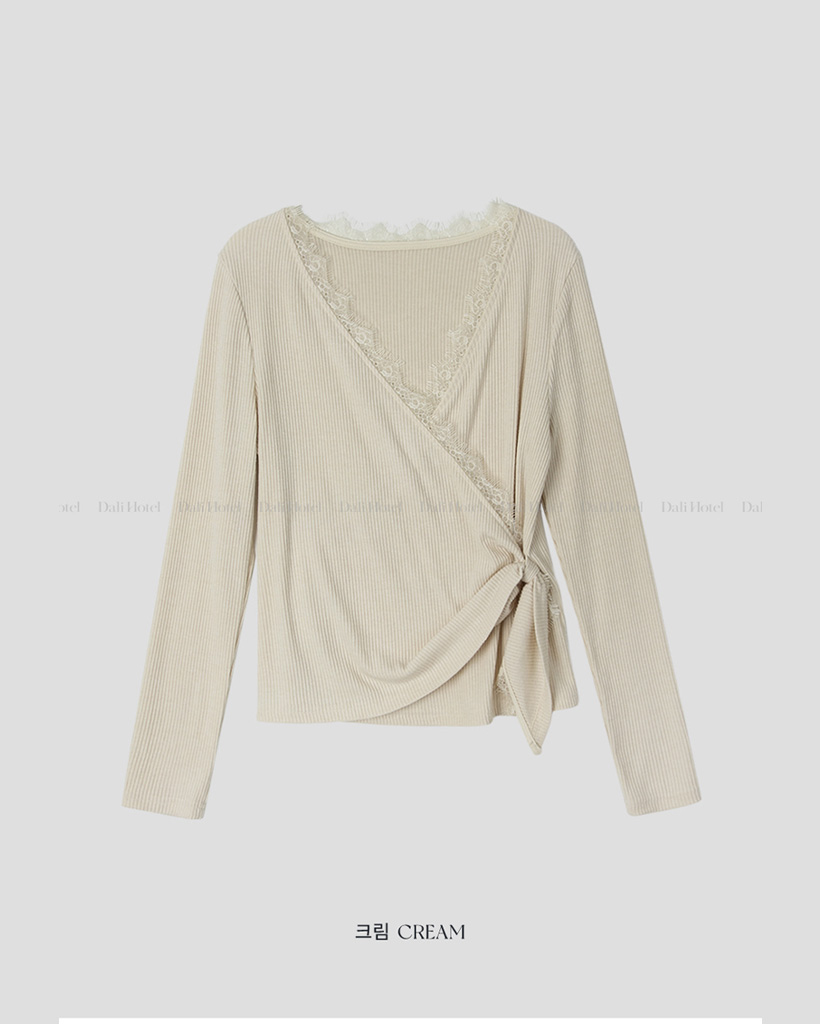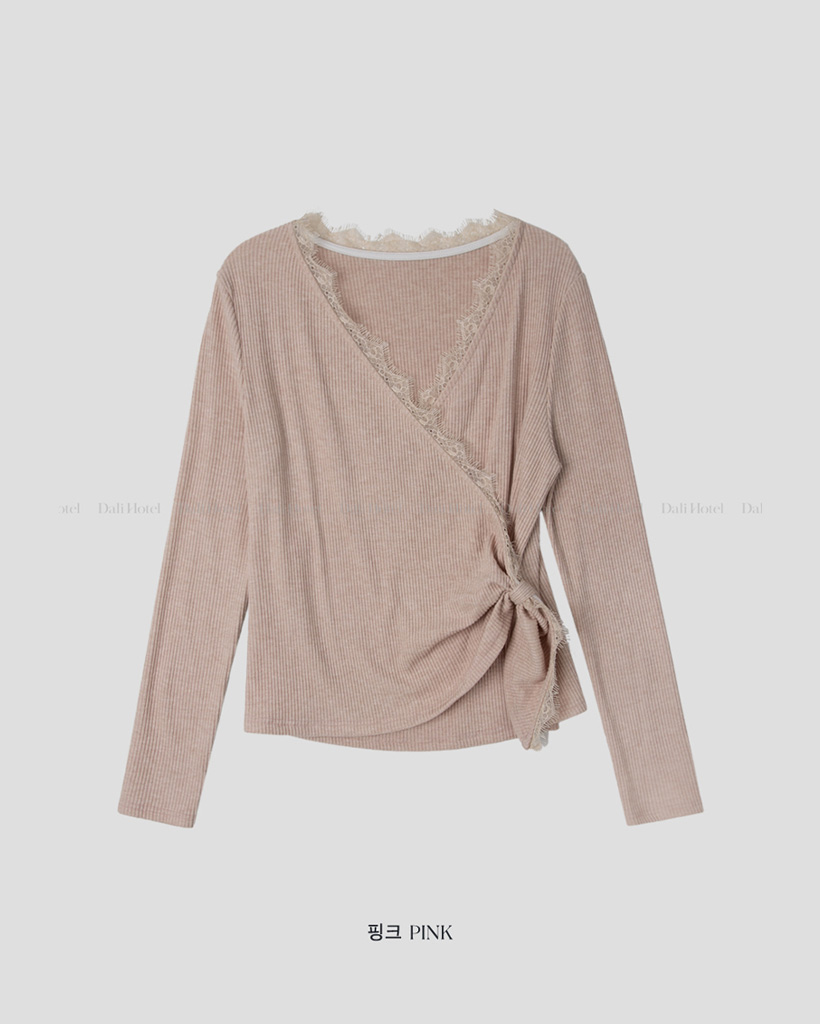 (3color) レース ウエストリボン ラップ リブニット トップス