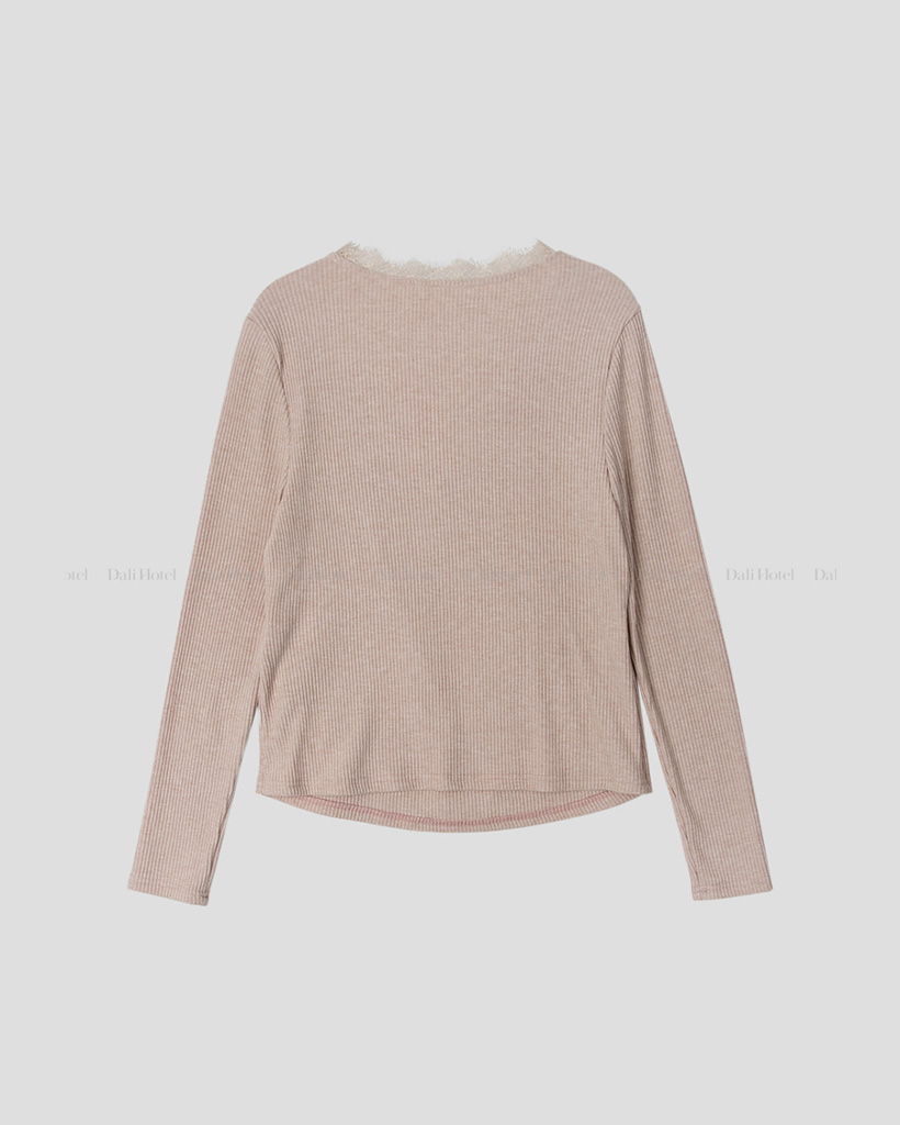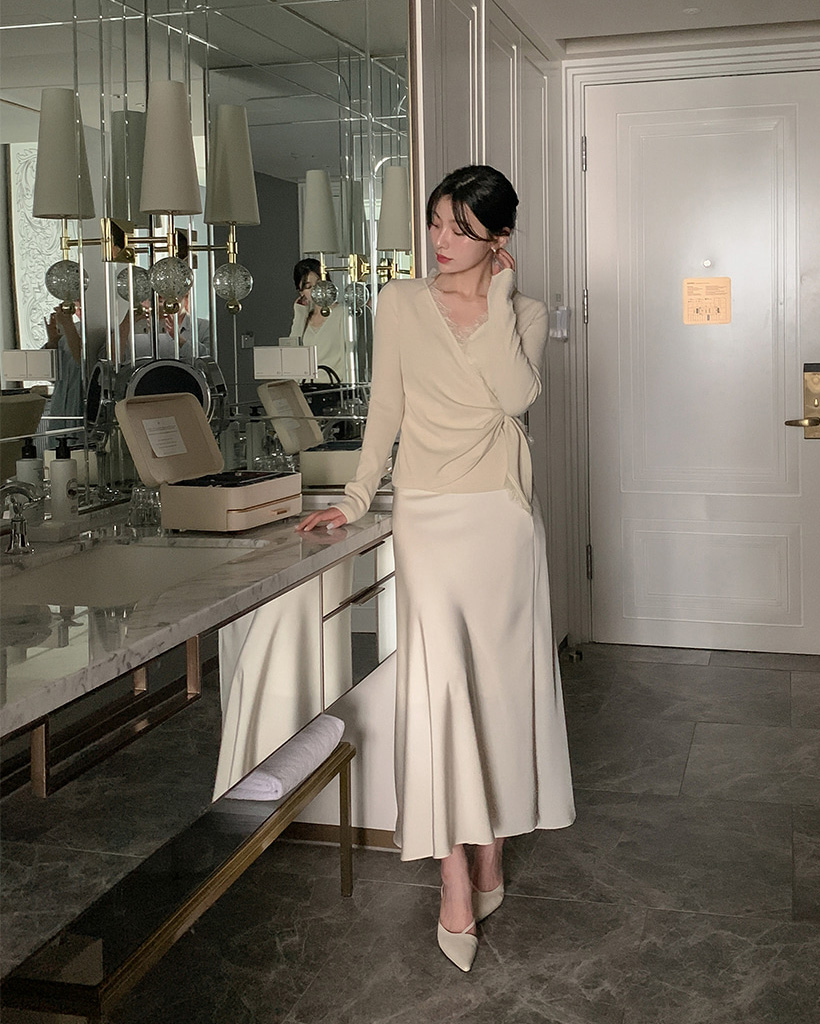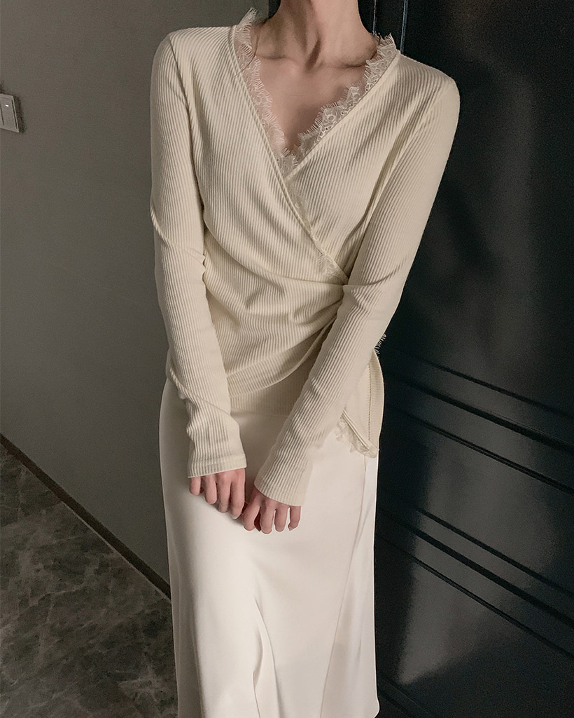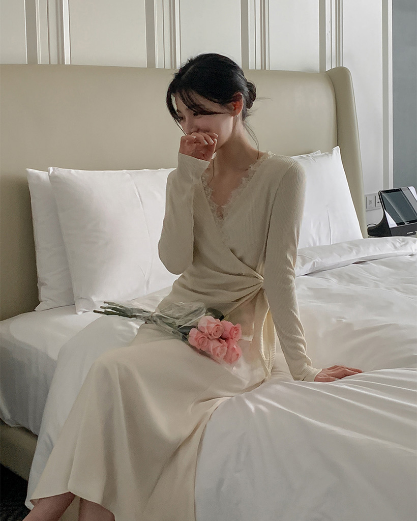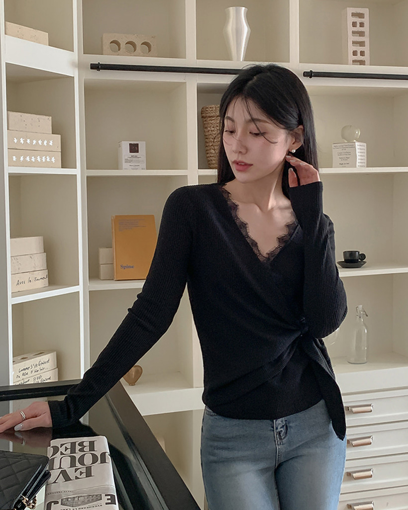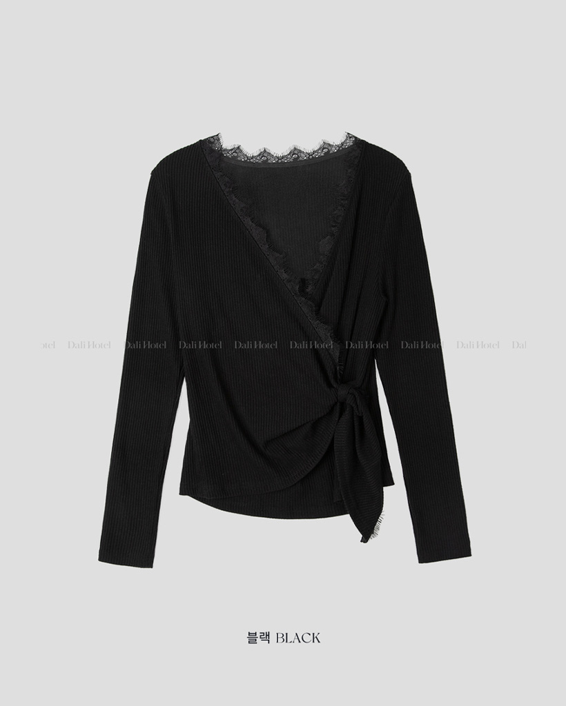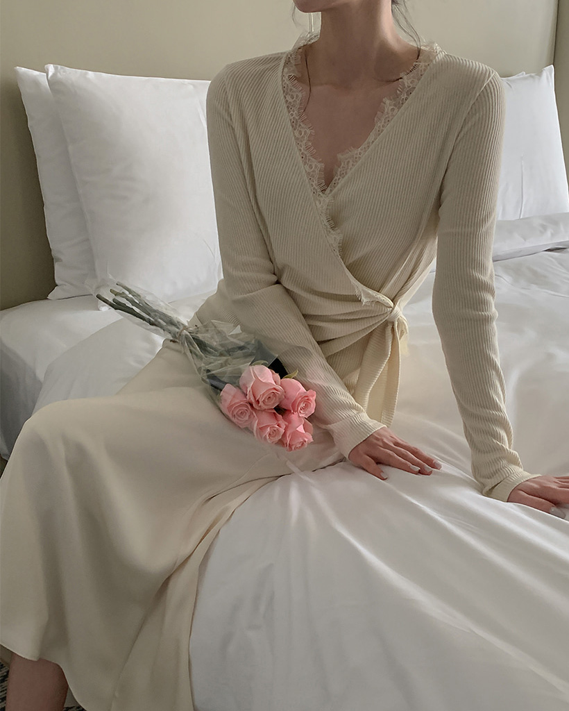 (3color) レース ウエストリボン ラップ リブニット トップス