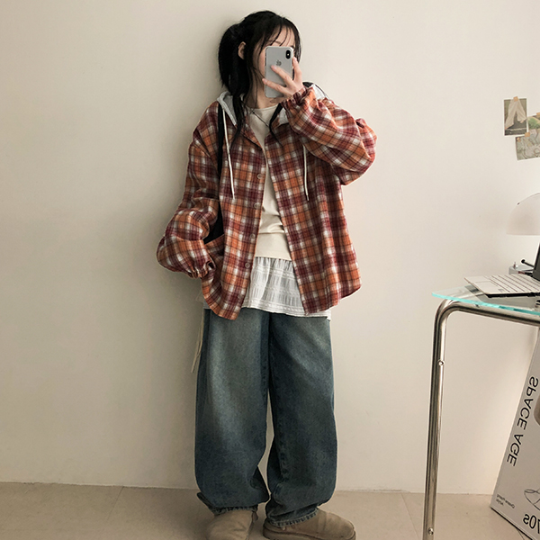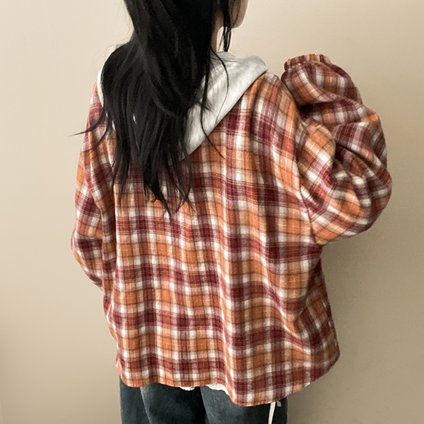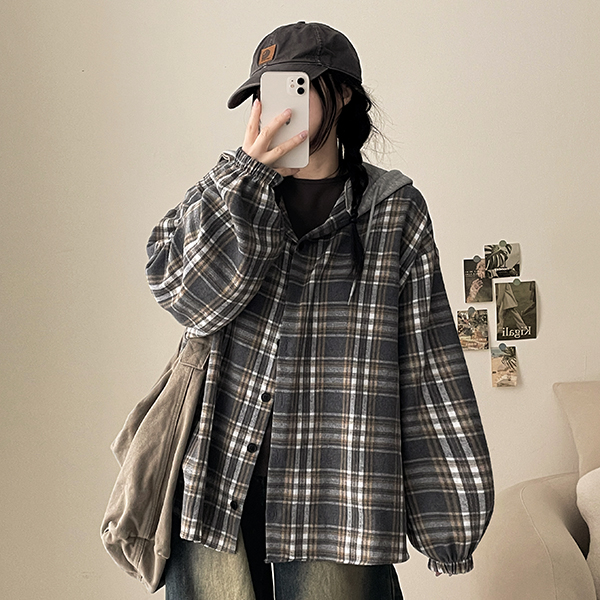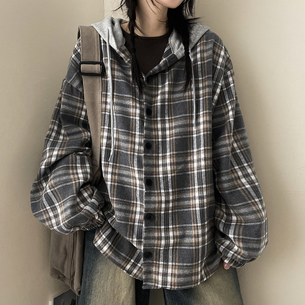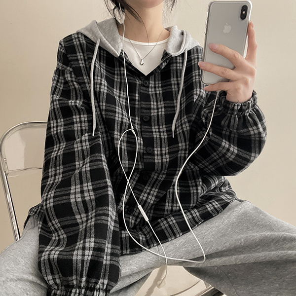 レイヤードフード付きチェックシャツ