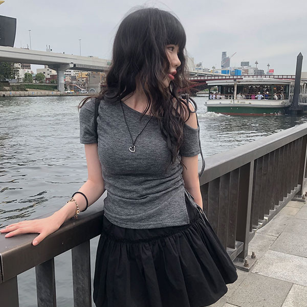 ワンショルダーオープンリボン半袖Tシャツ (3color)