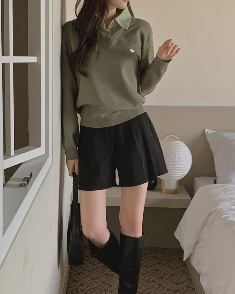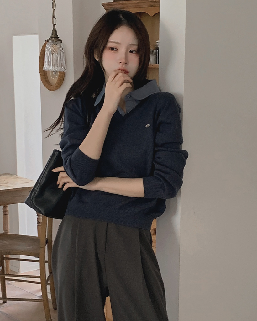 配色シャツレイヤードペンダントニット
