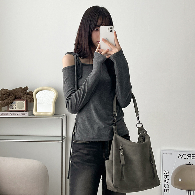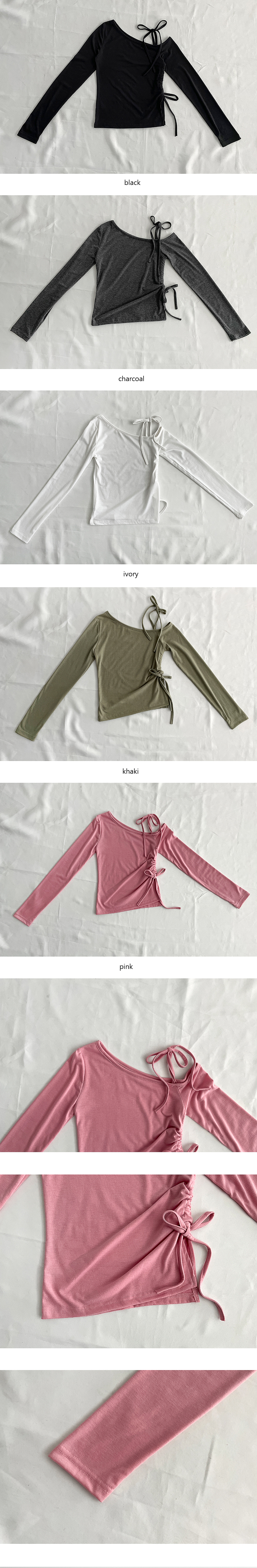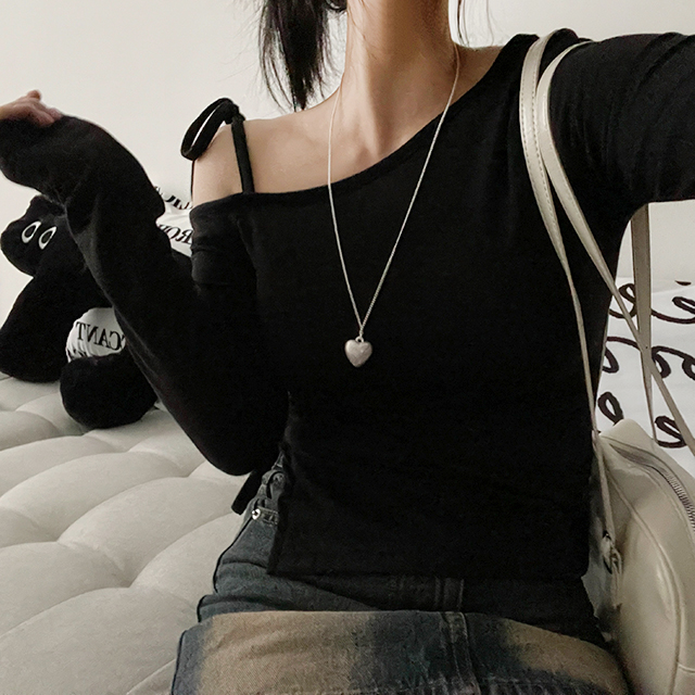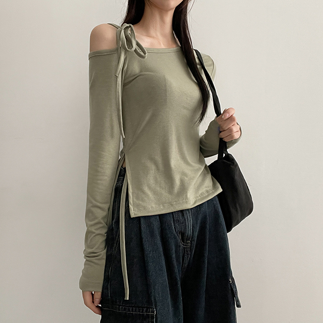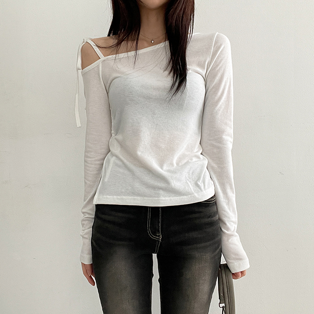 アンバランスショルダーリボン長袖Tシャツ(5color)