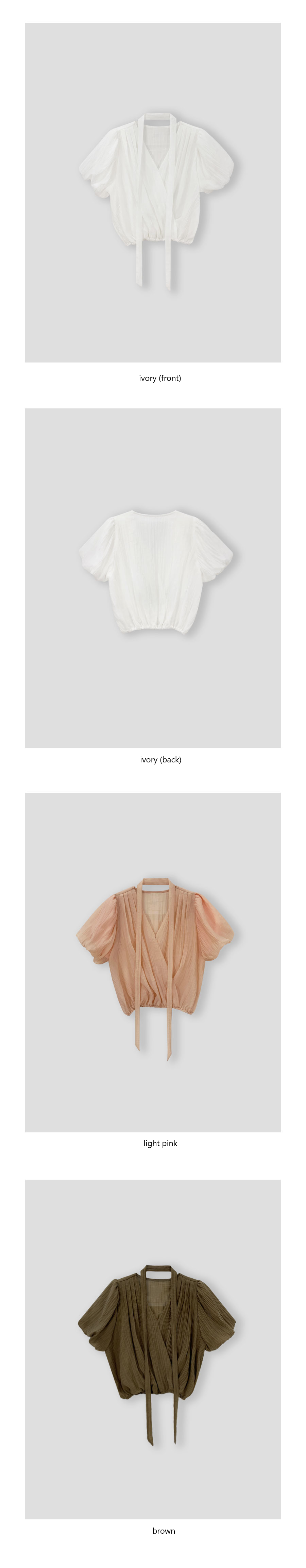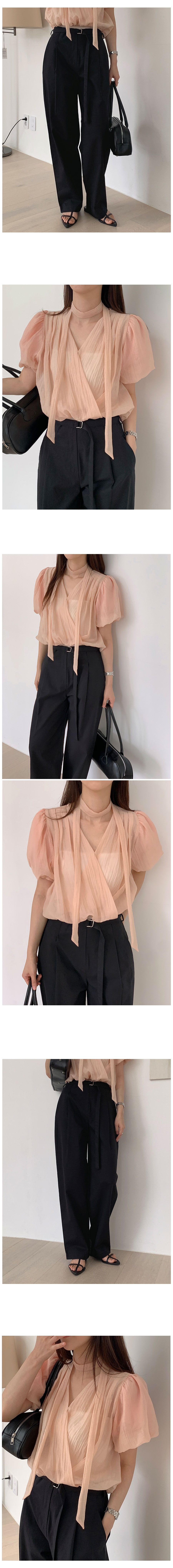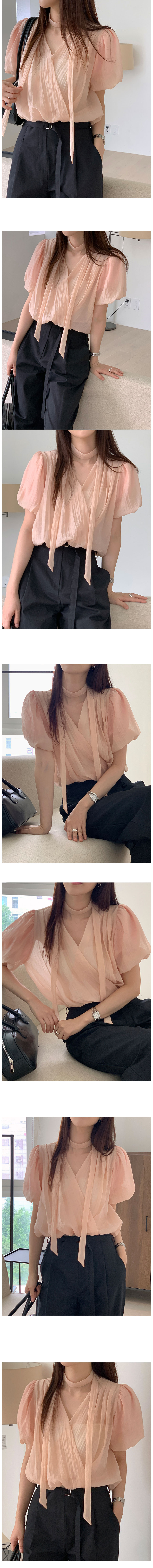 シースルーシャーリングバルーンタイ夏半袖ラップブラウス3color