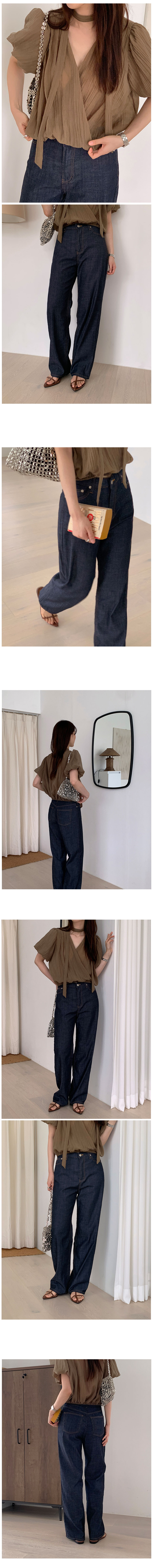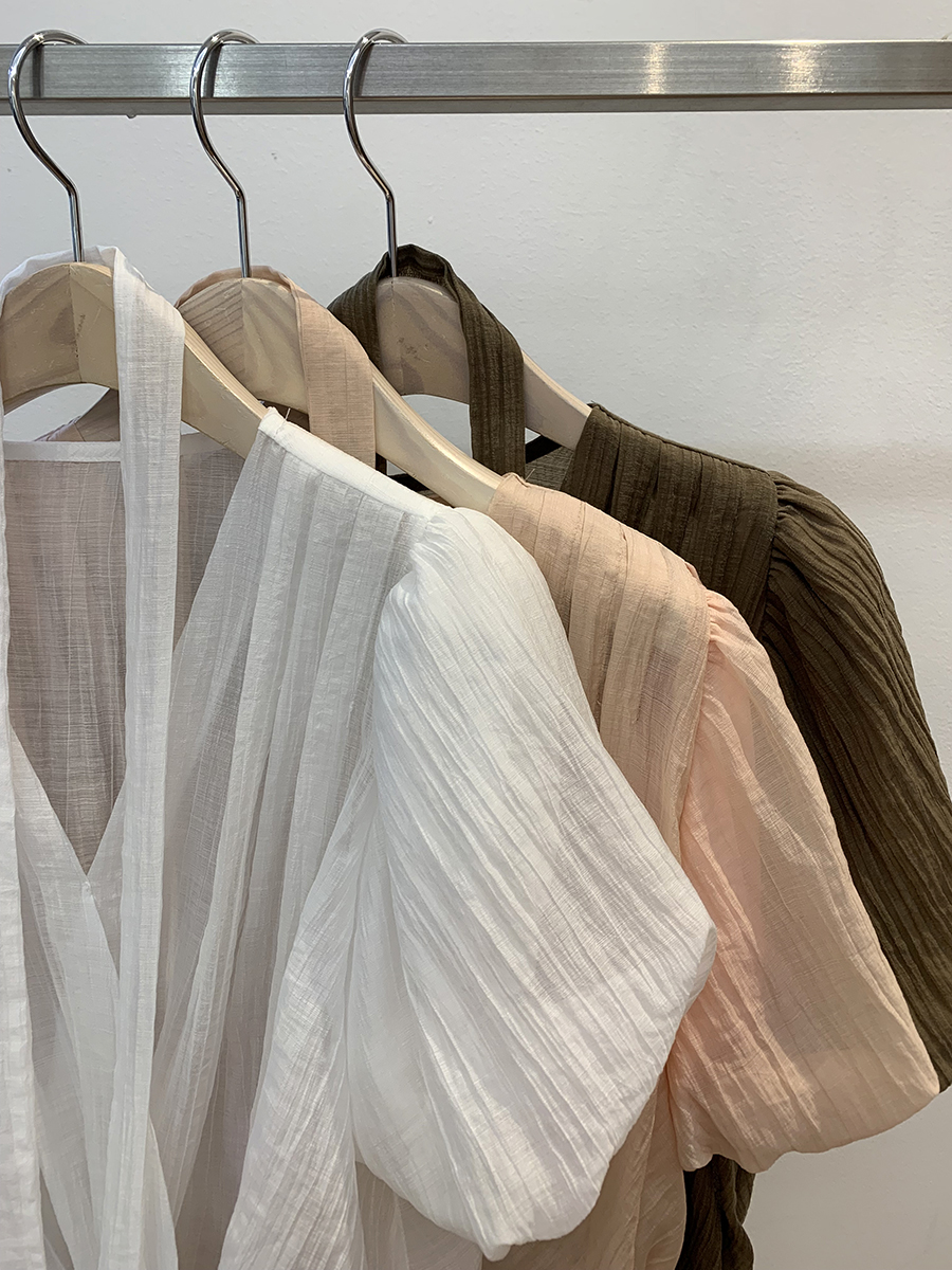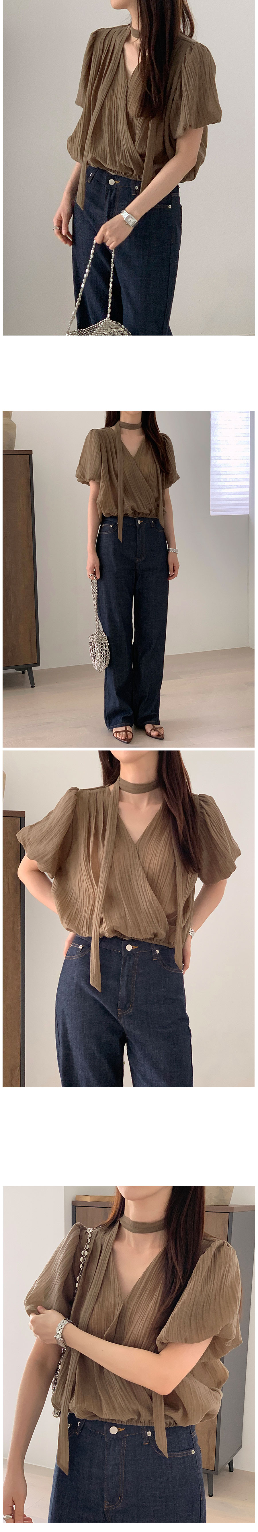 シースルーシャーリングバルーンタイ夏半袖ラップブラウス3color