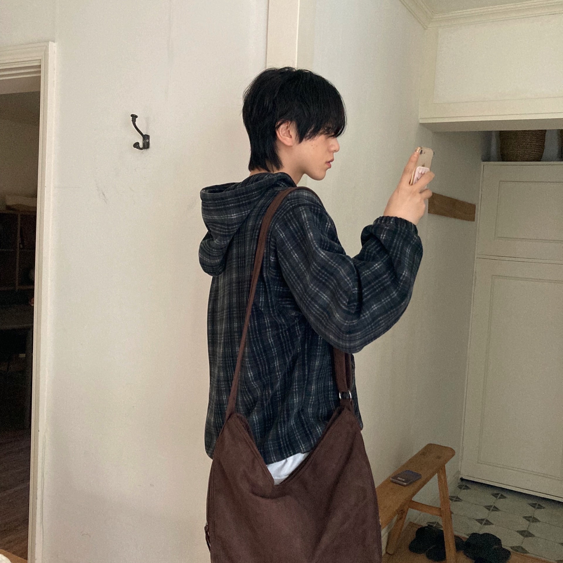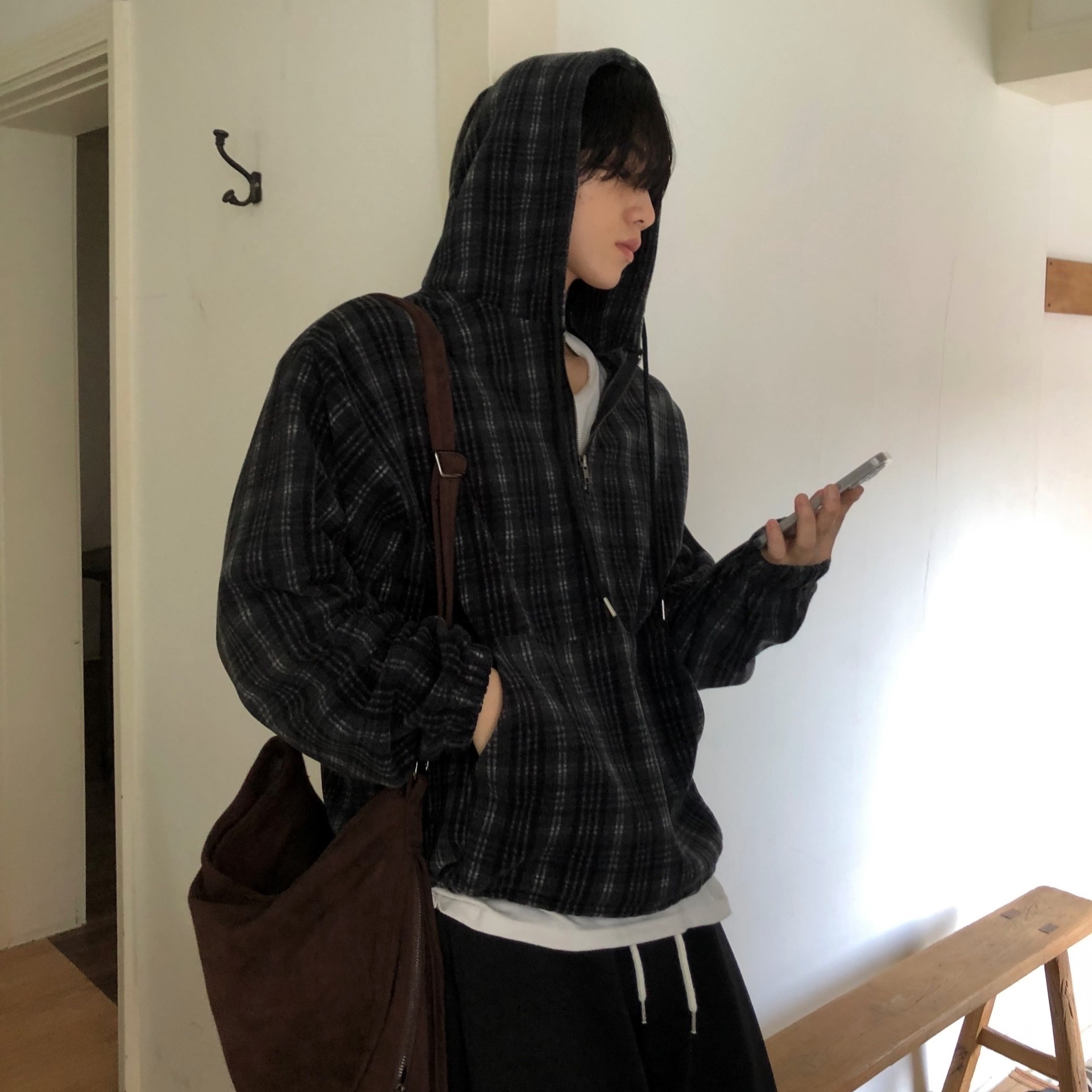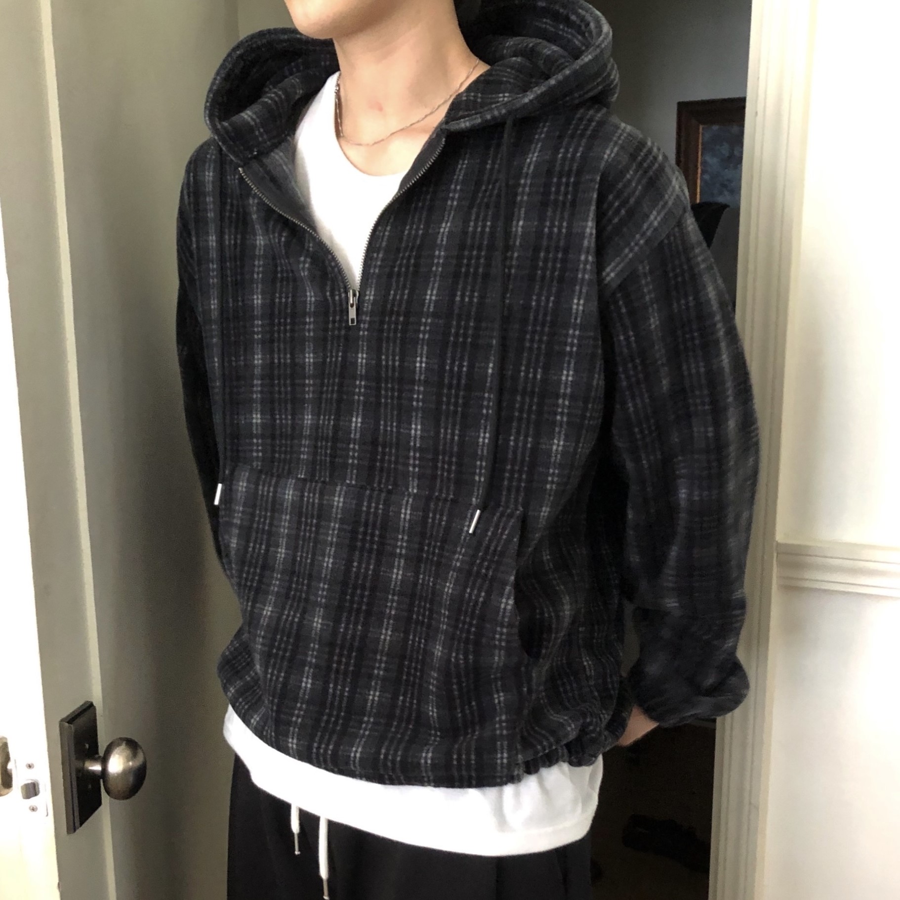 (2color)チェックフリースフード付きパーカー