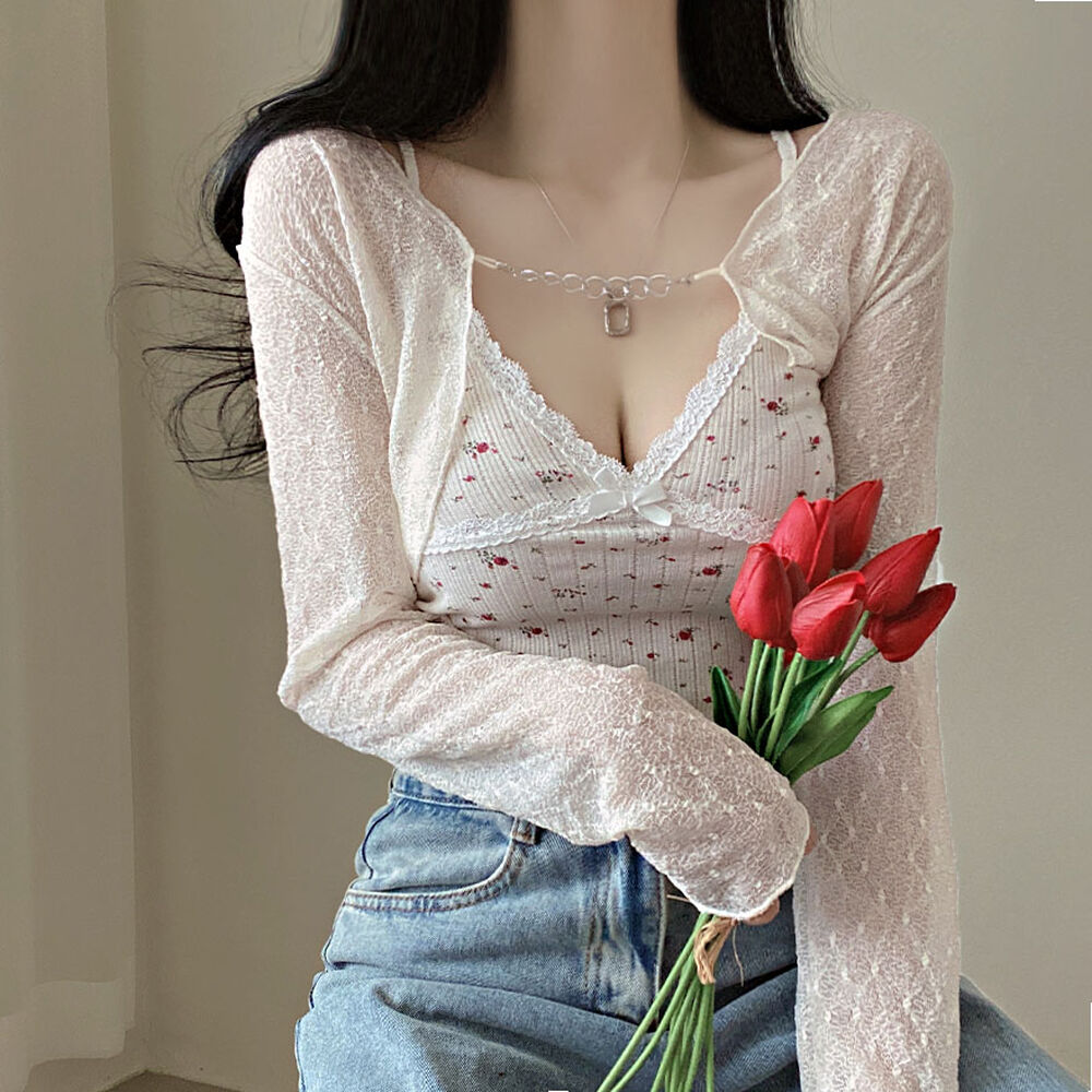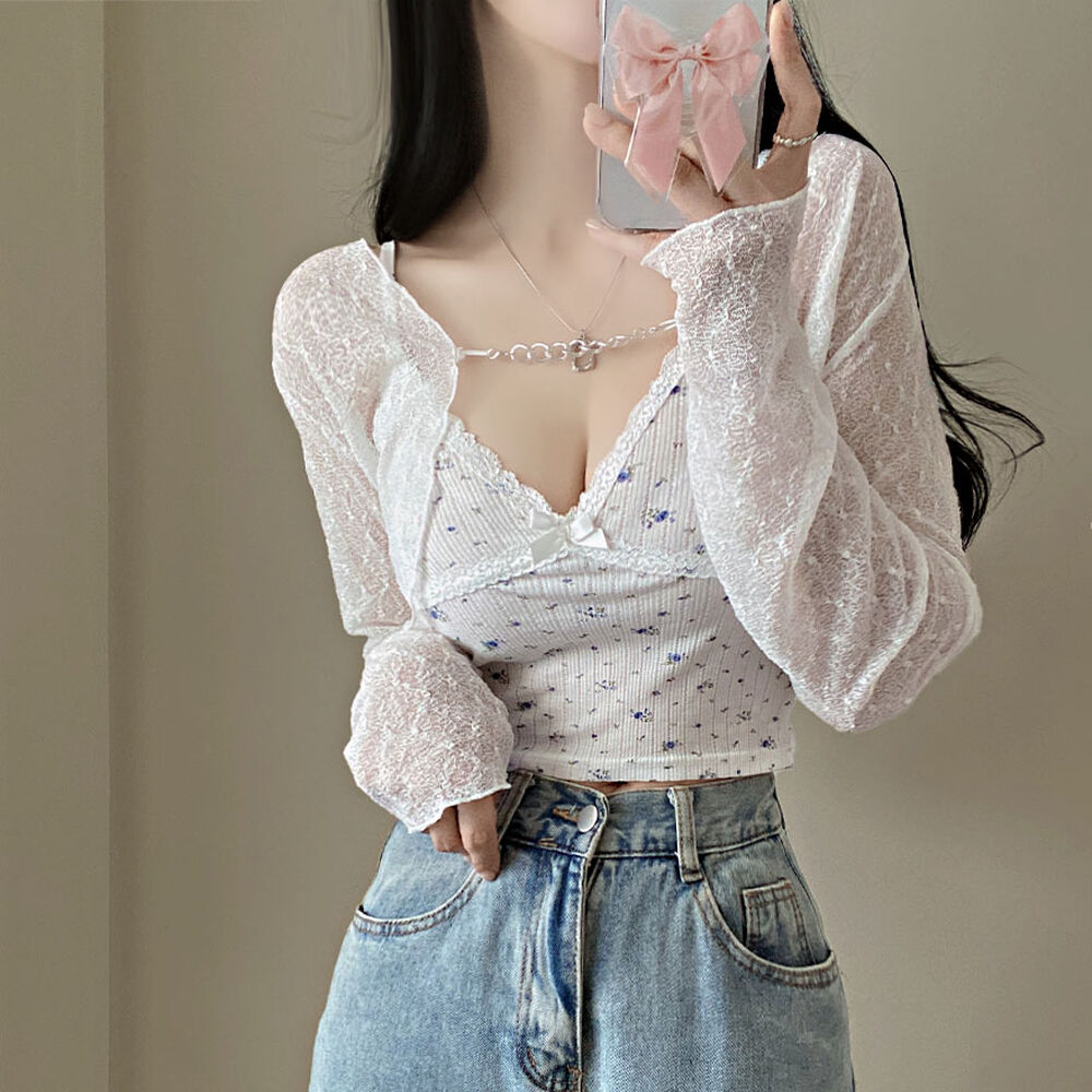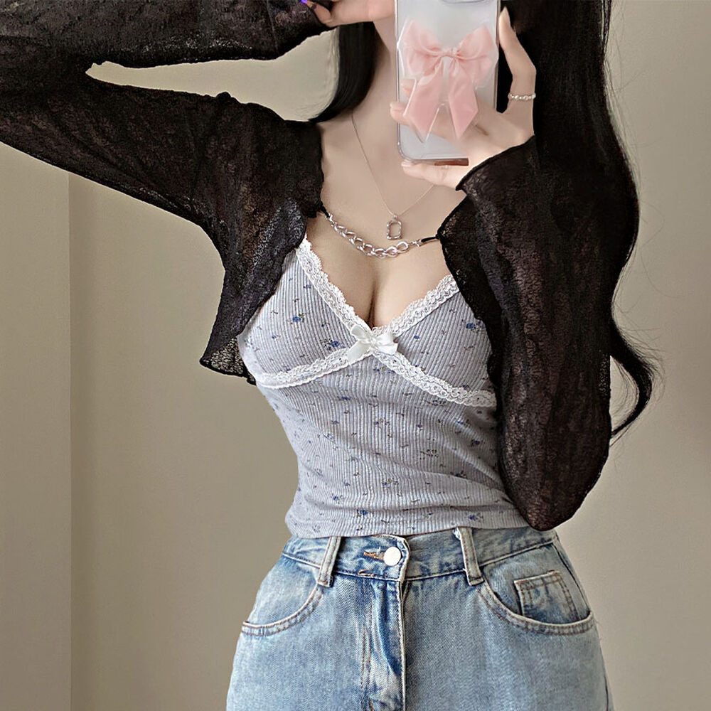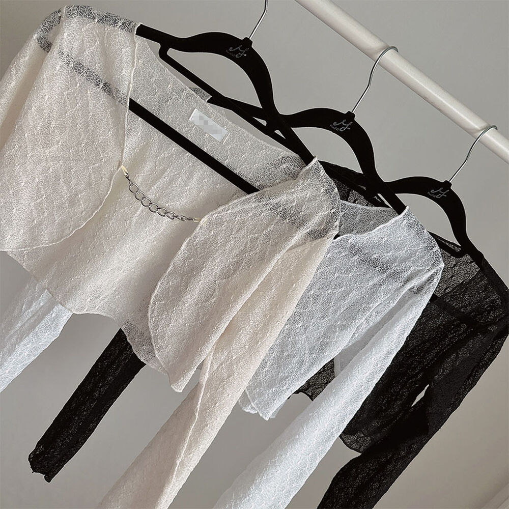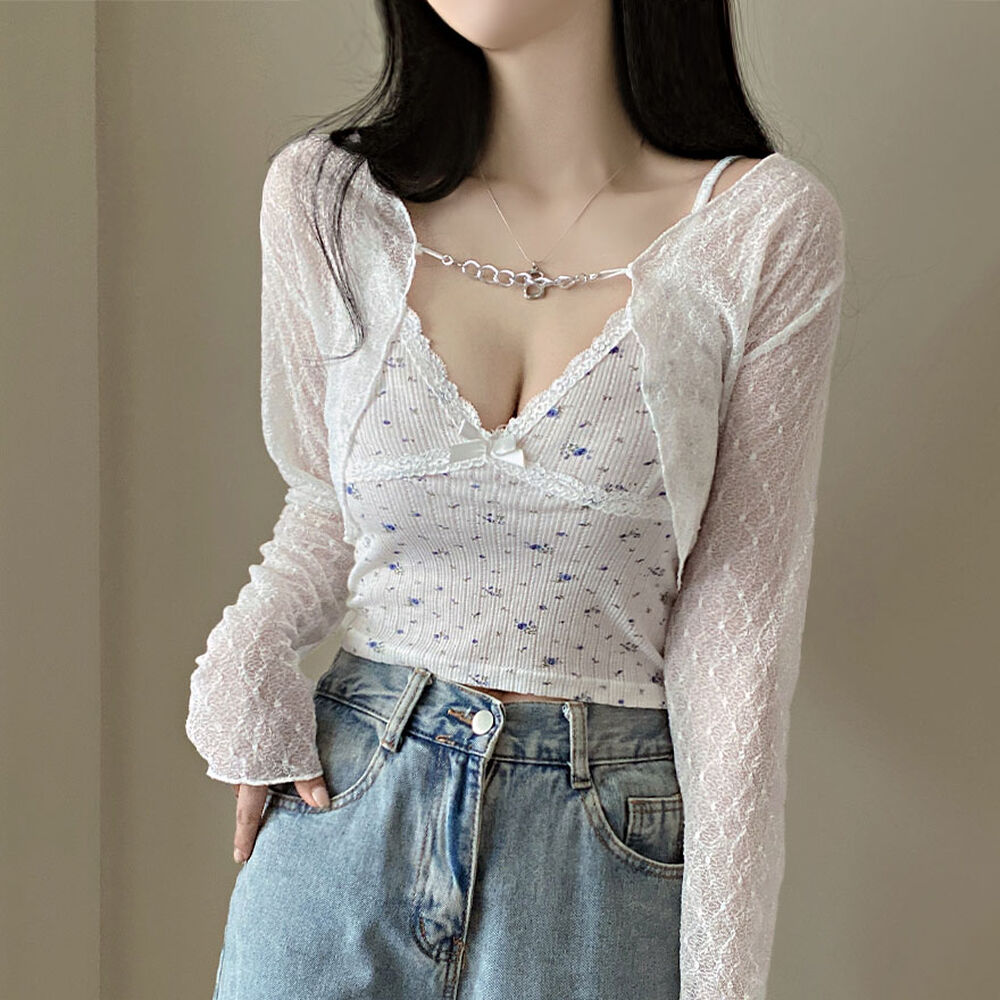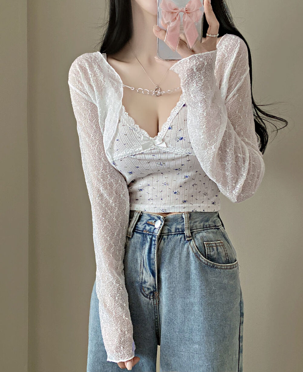 レースチェーンクロップドボレロ長袖シースルーカーディガン