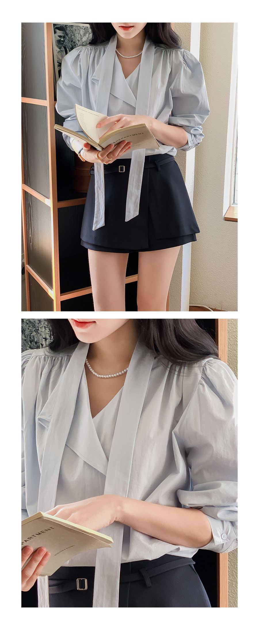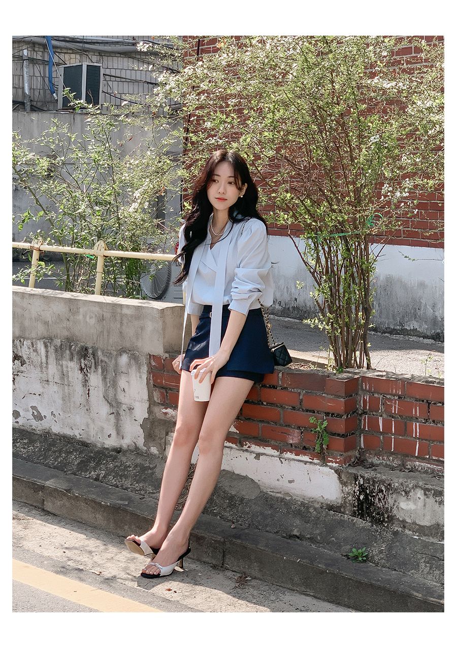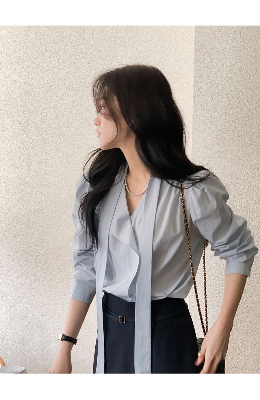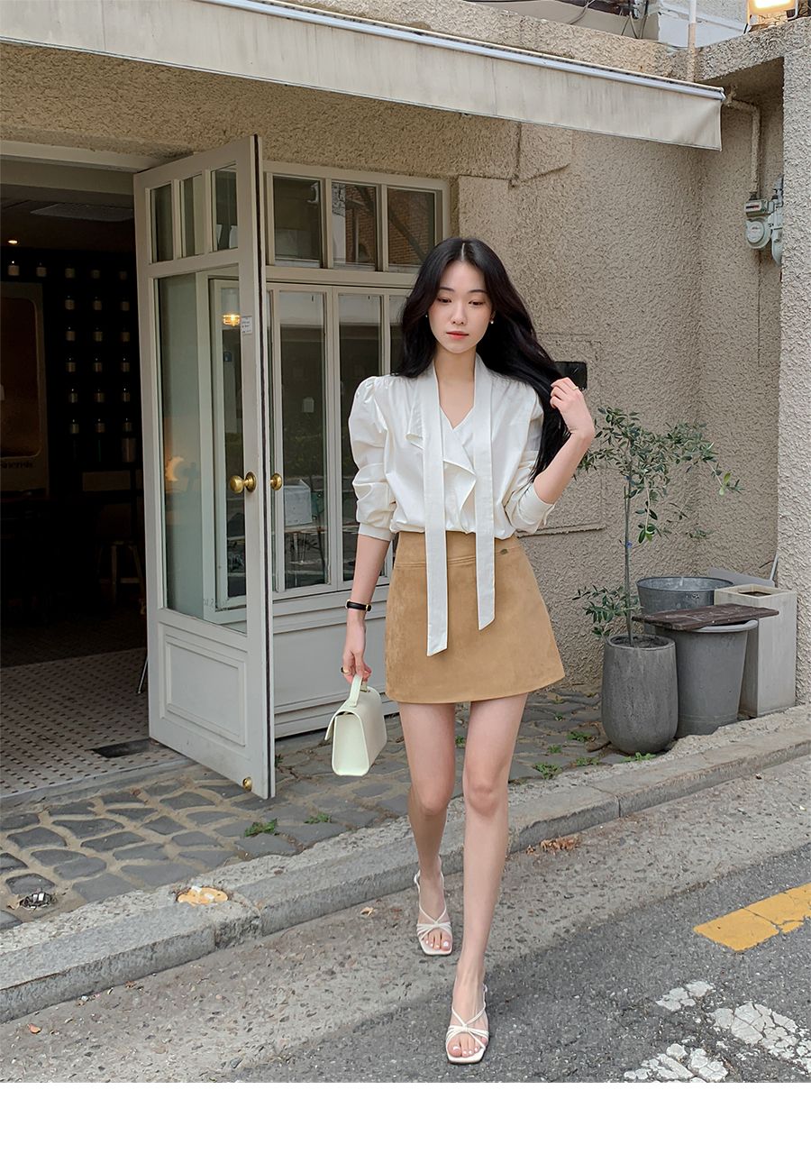 Vネックフリルストラップロングスリーブブラウス