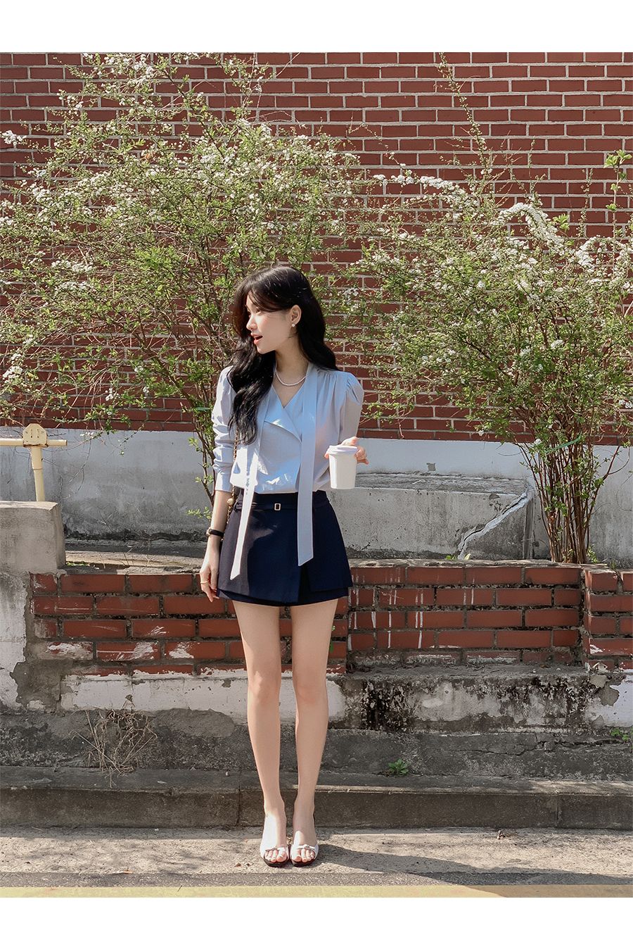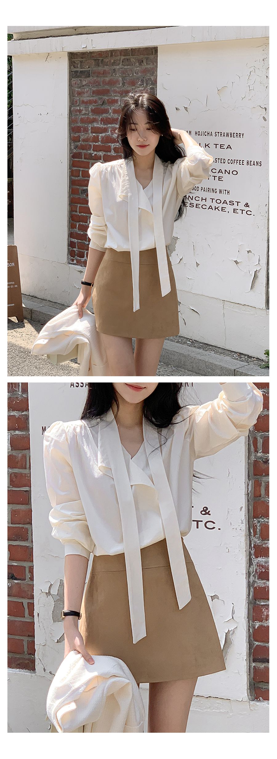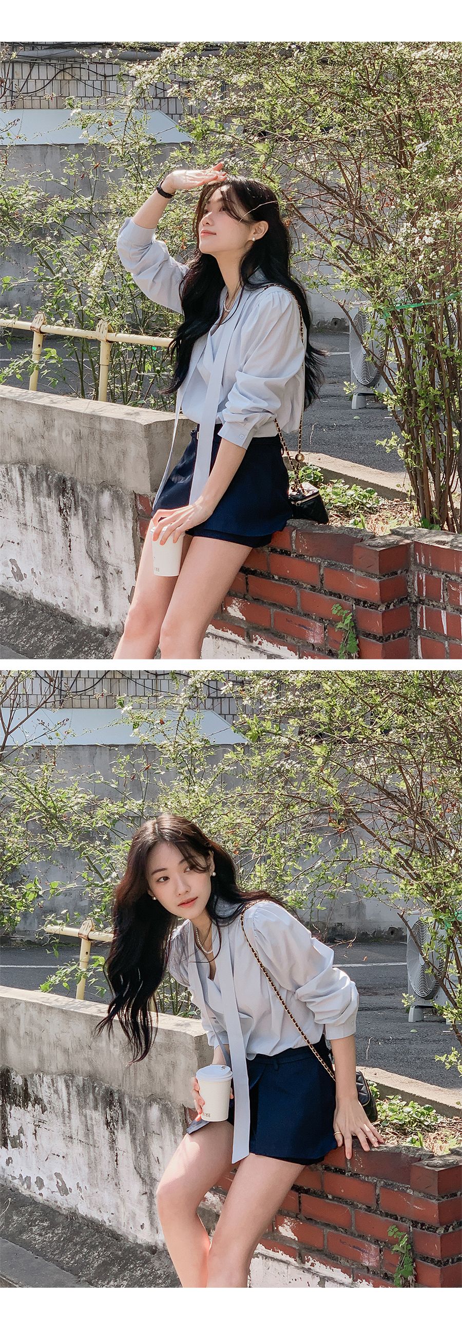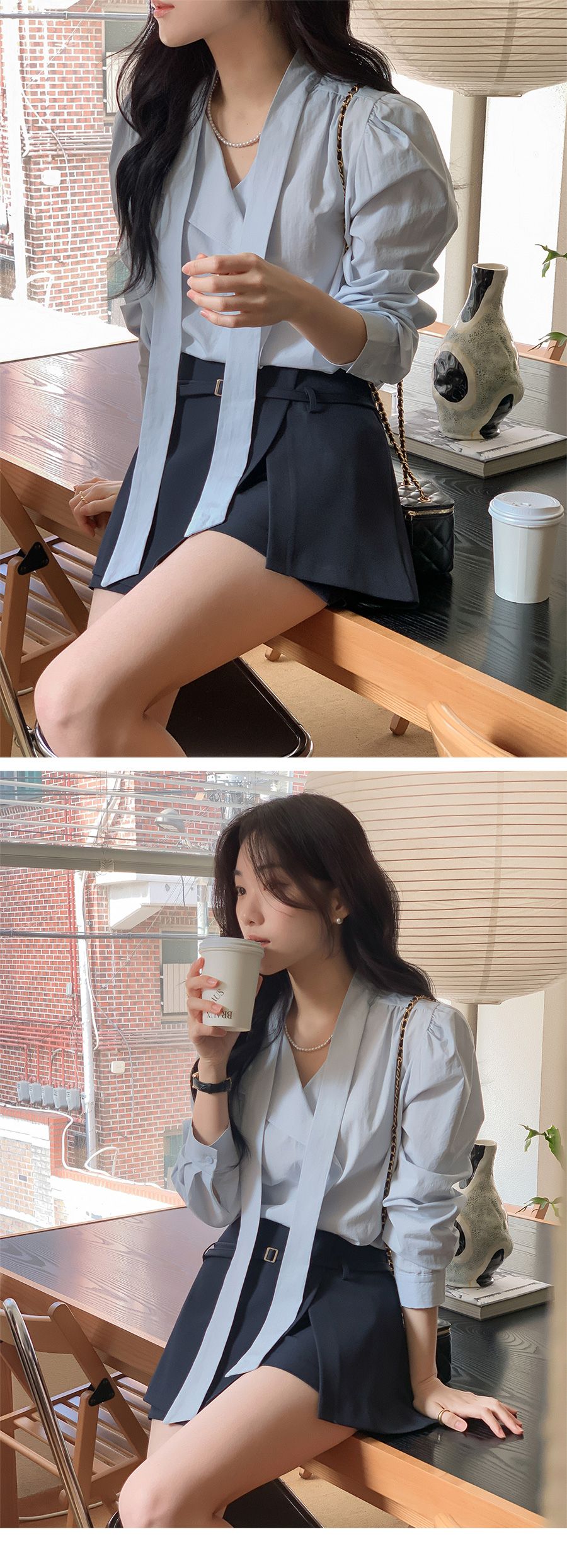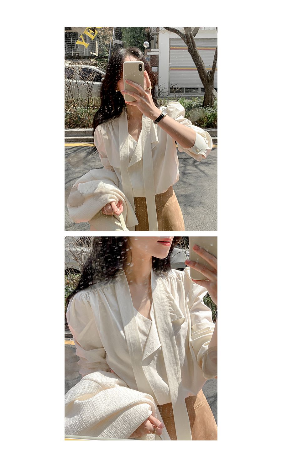 Vネックフリルストラップロングスリーブブラウス