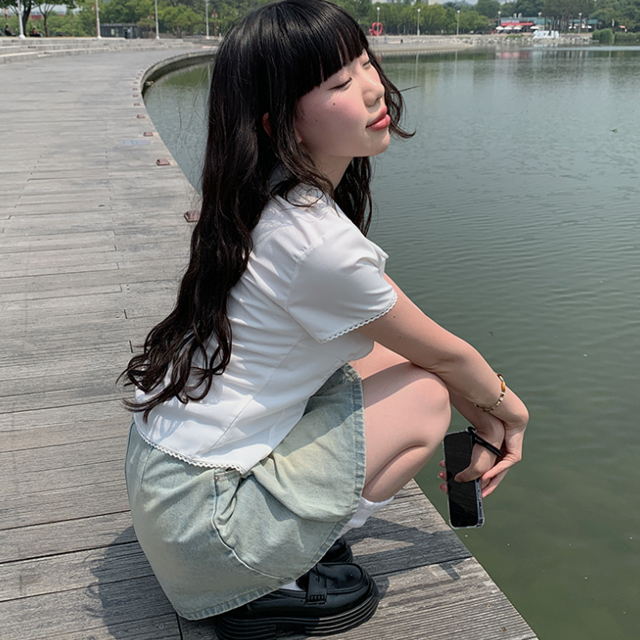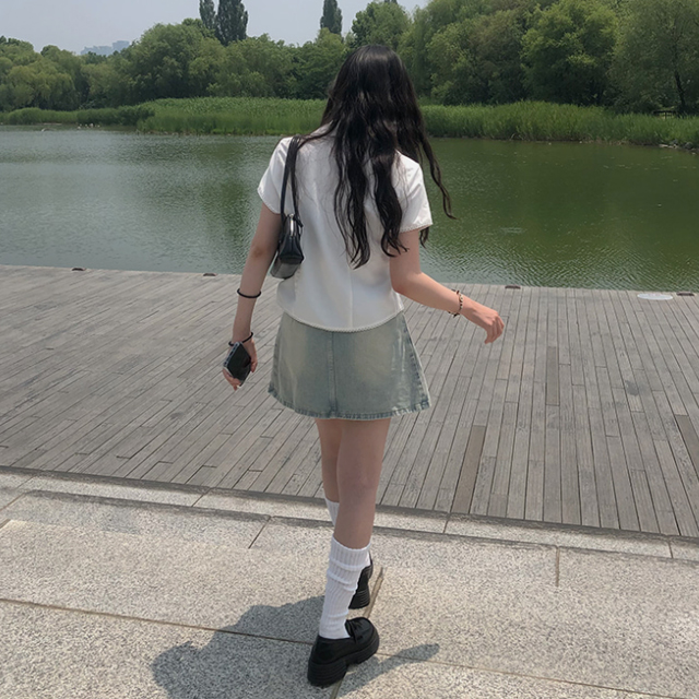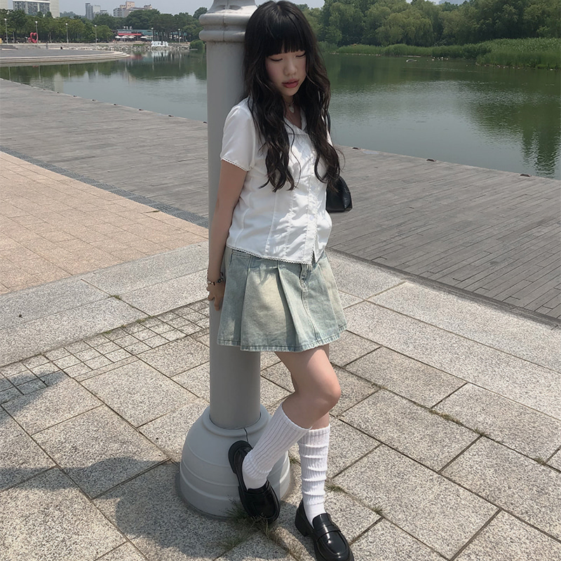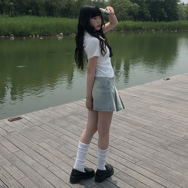 ベルト付きフロントワイドプリーツミニデニムスカート (2color)