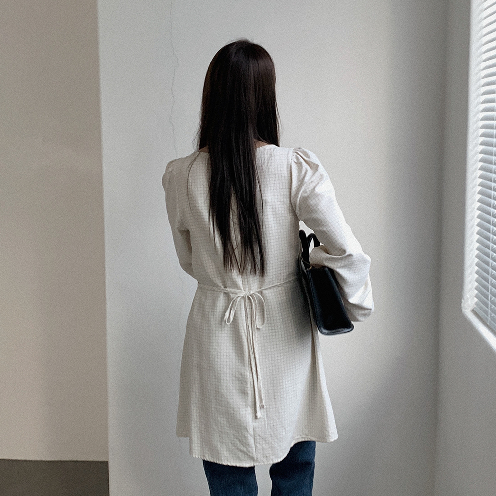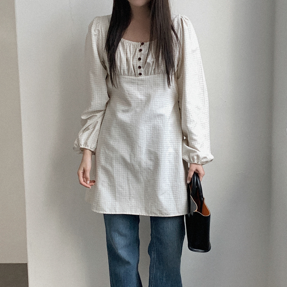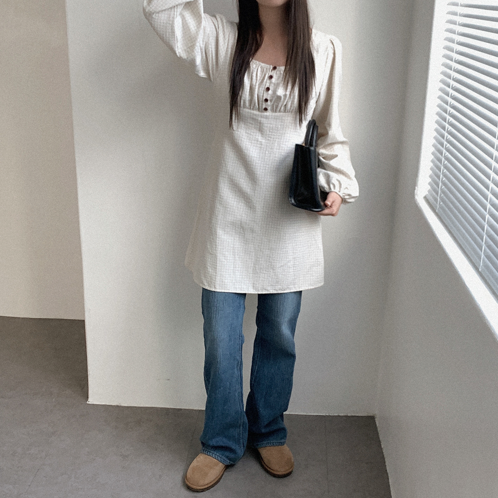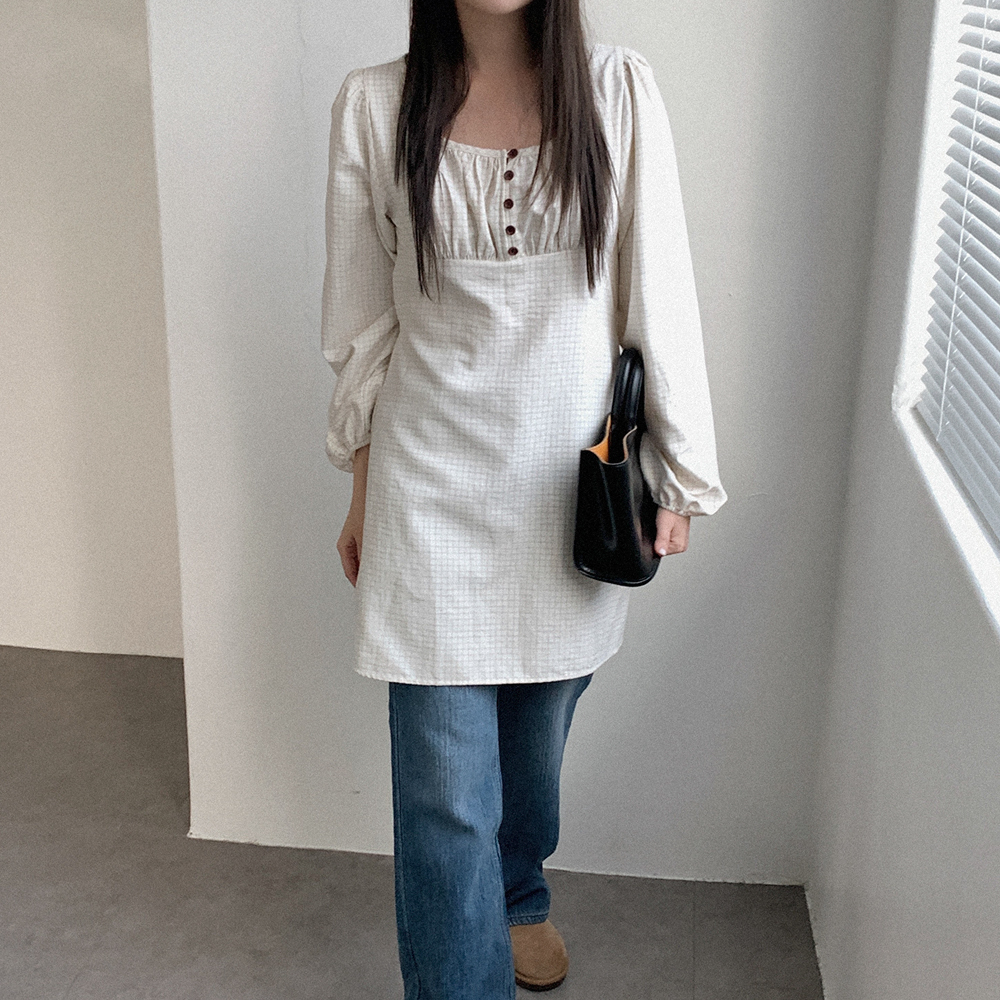 ボタン付き シャーリング ミニワンピース