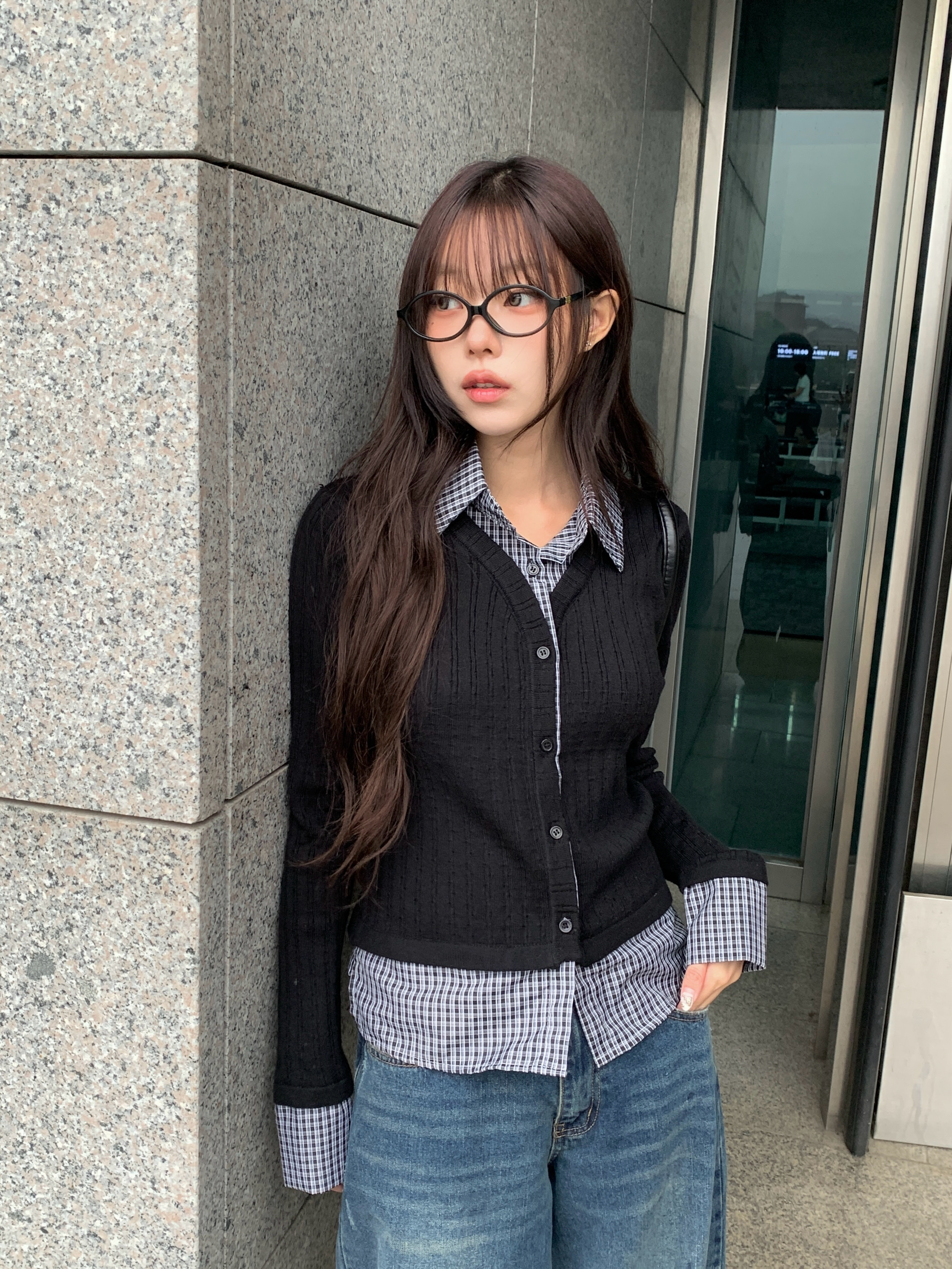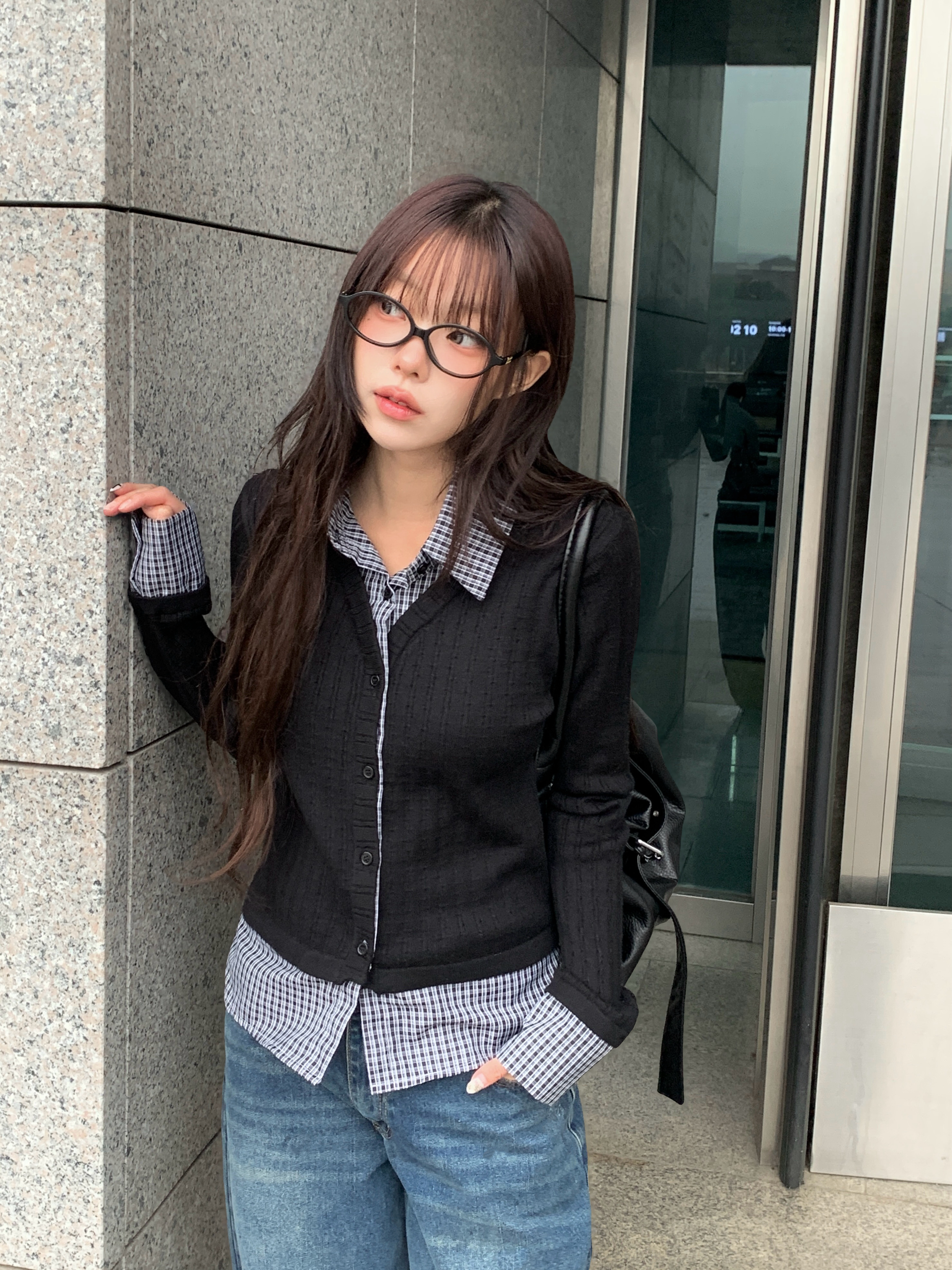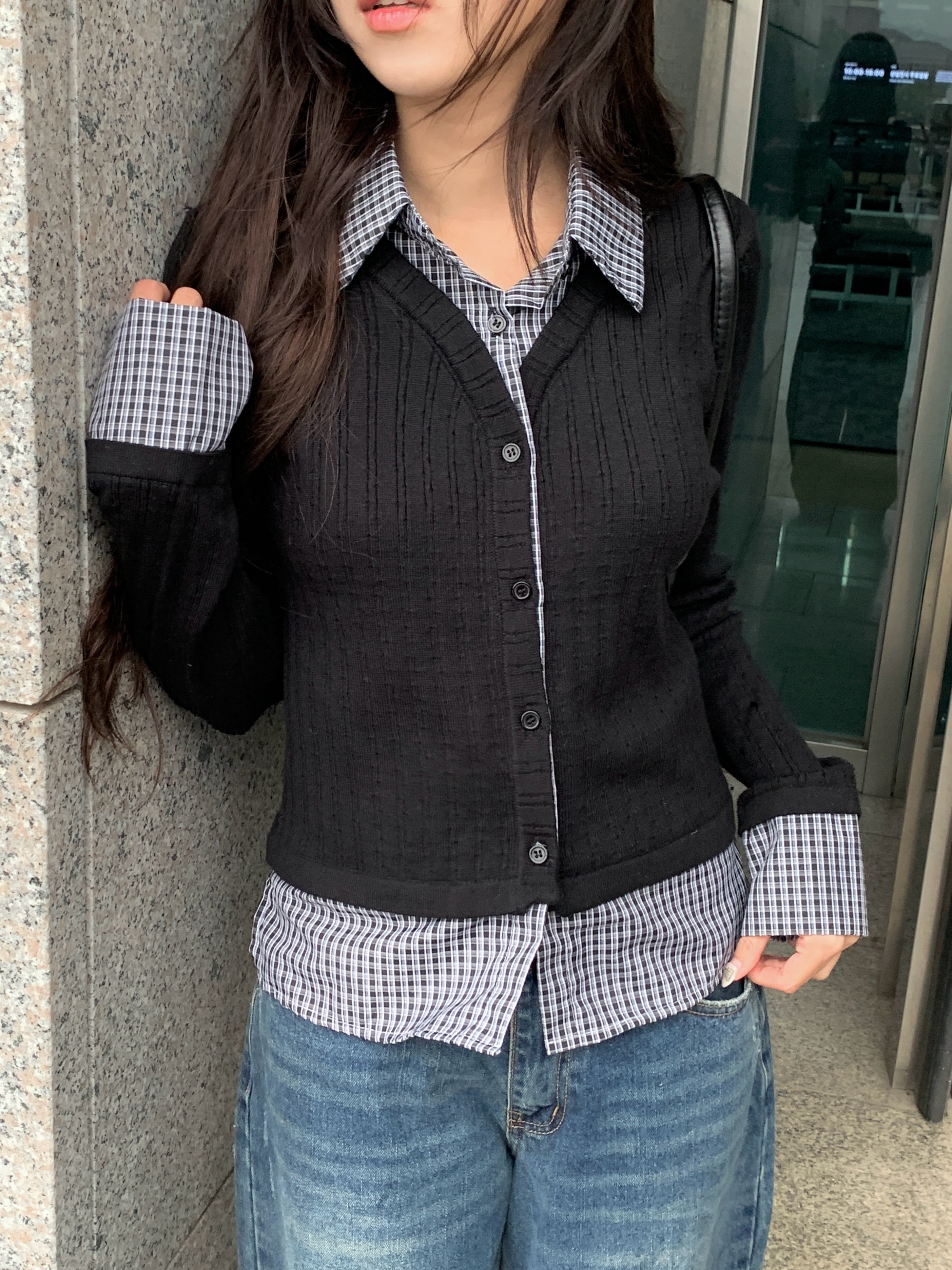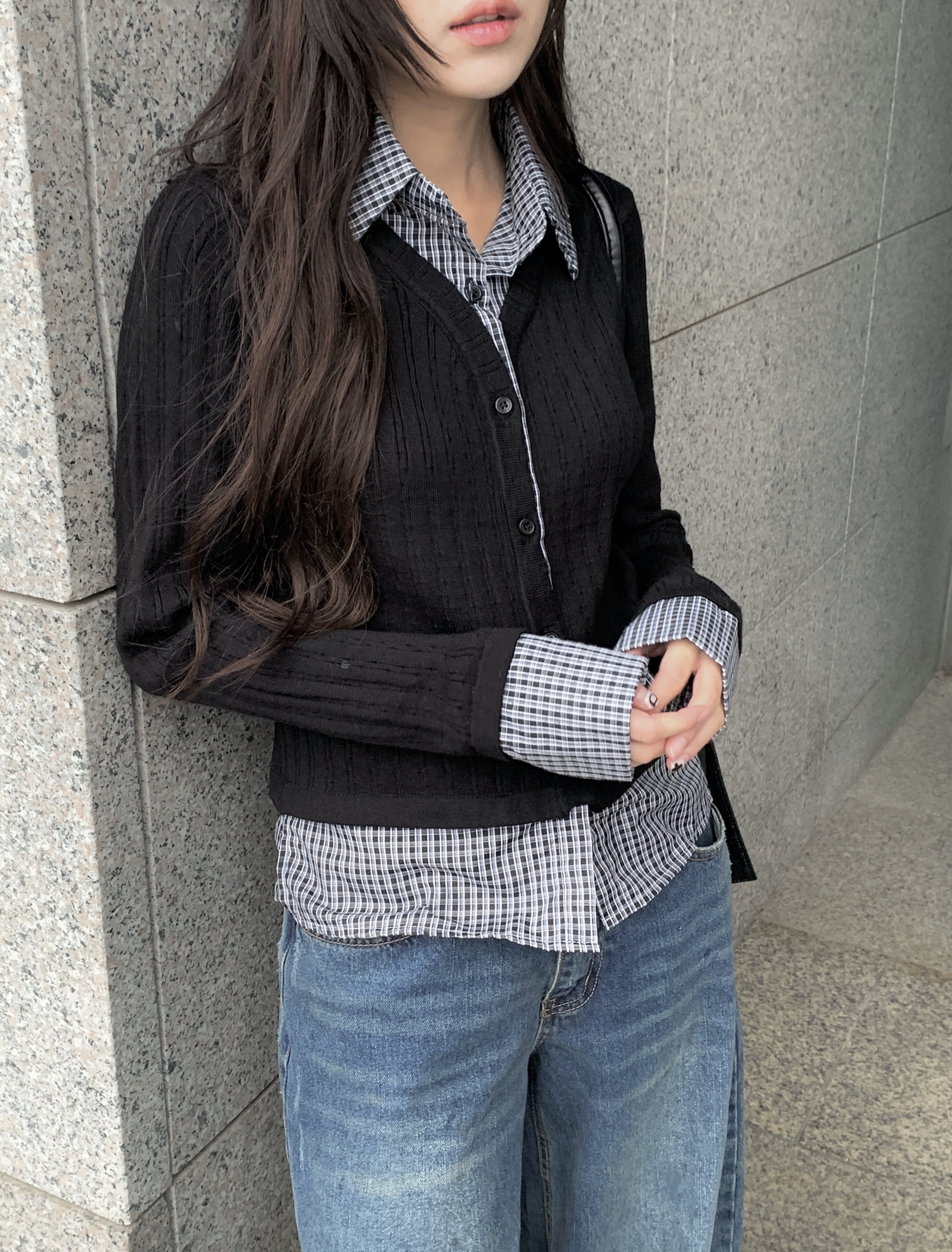 チェック柄シャツレイヤードニットリブカーディガン