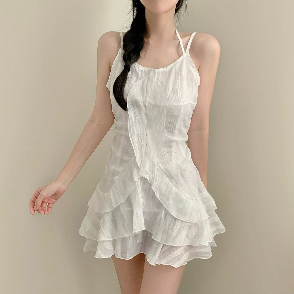 フリル紐ノースリーブティアードスカートミニワンピース(3color)