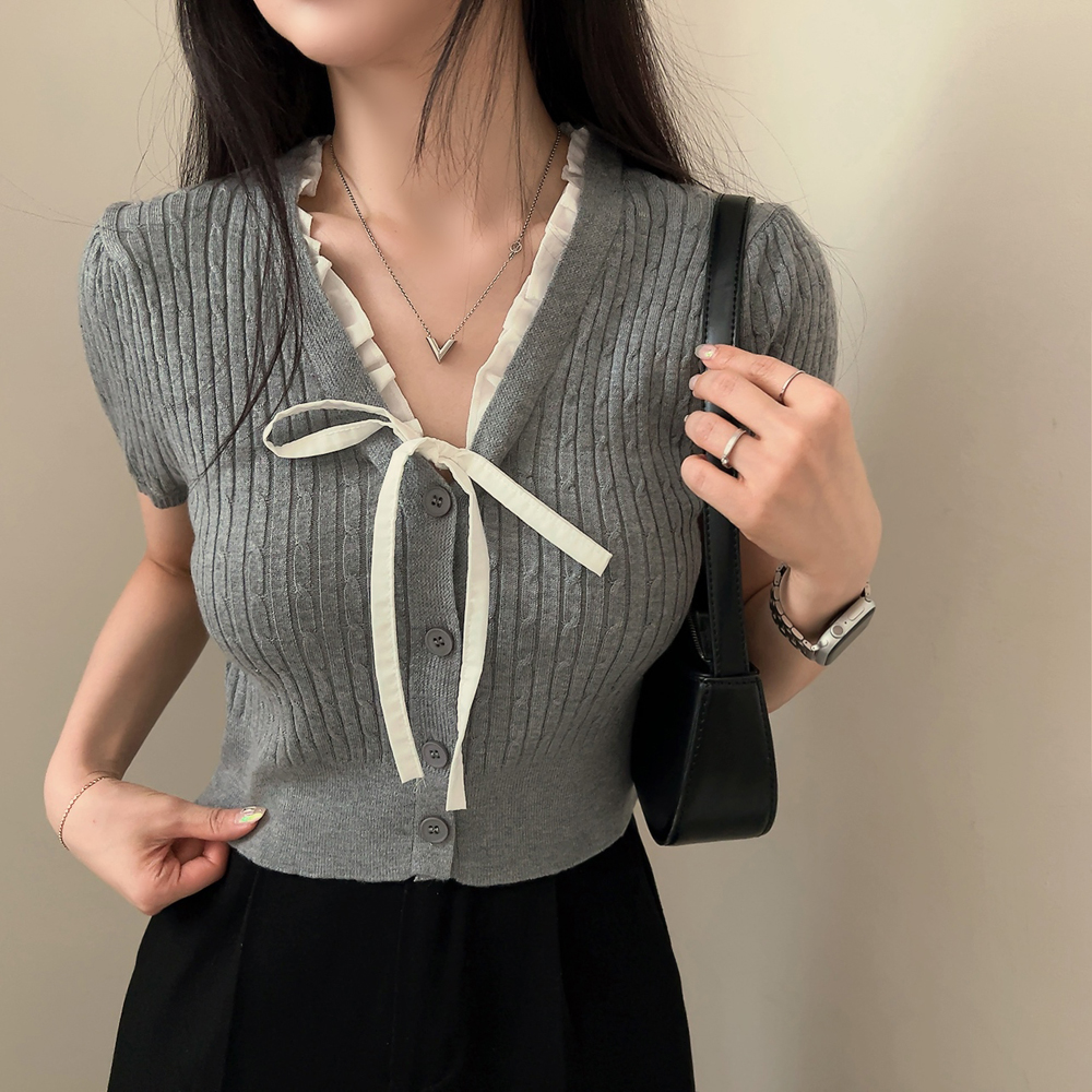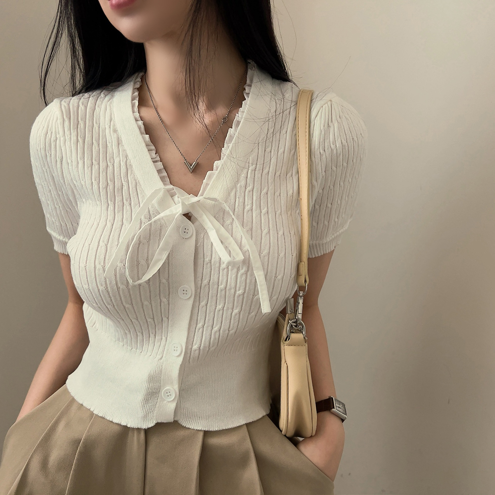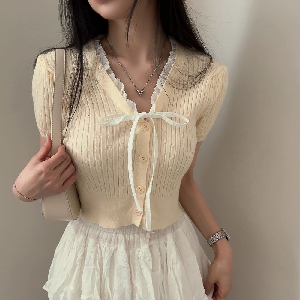 ツイストレースリボンクロップド半袖ニットカーディガン