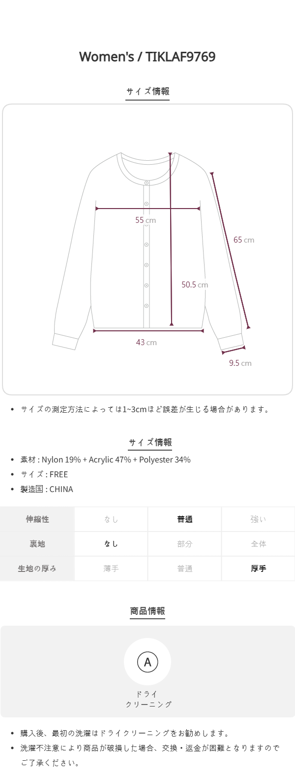가슴55/팔기장65/팔단면17.5/소매단면9.5/밑단43/총장50.5