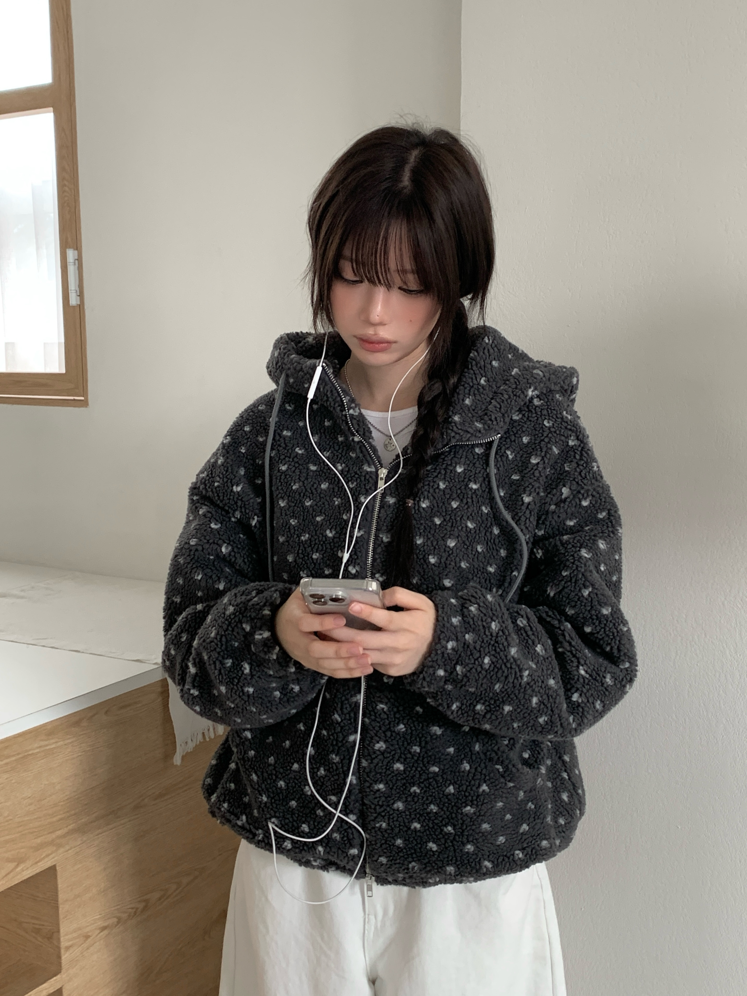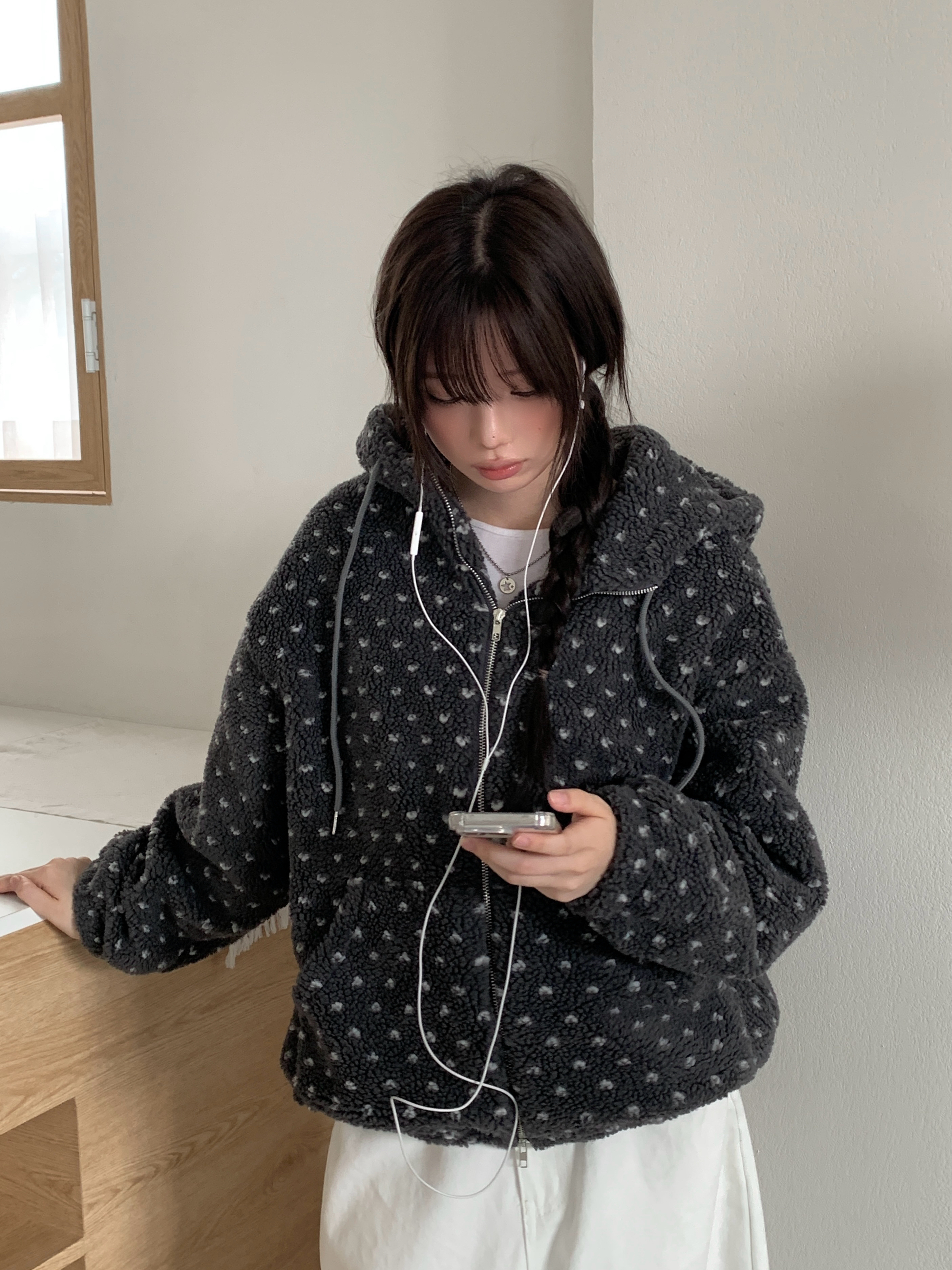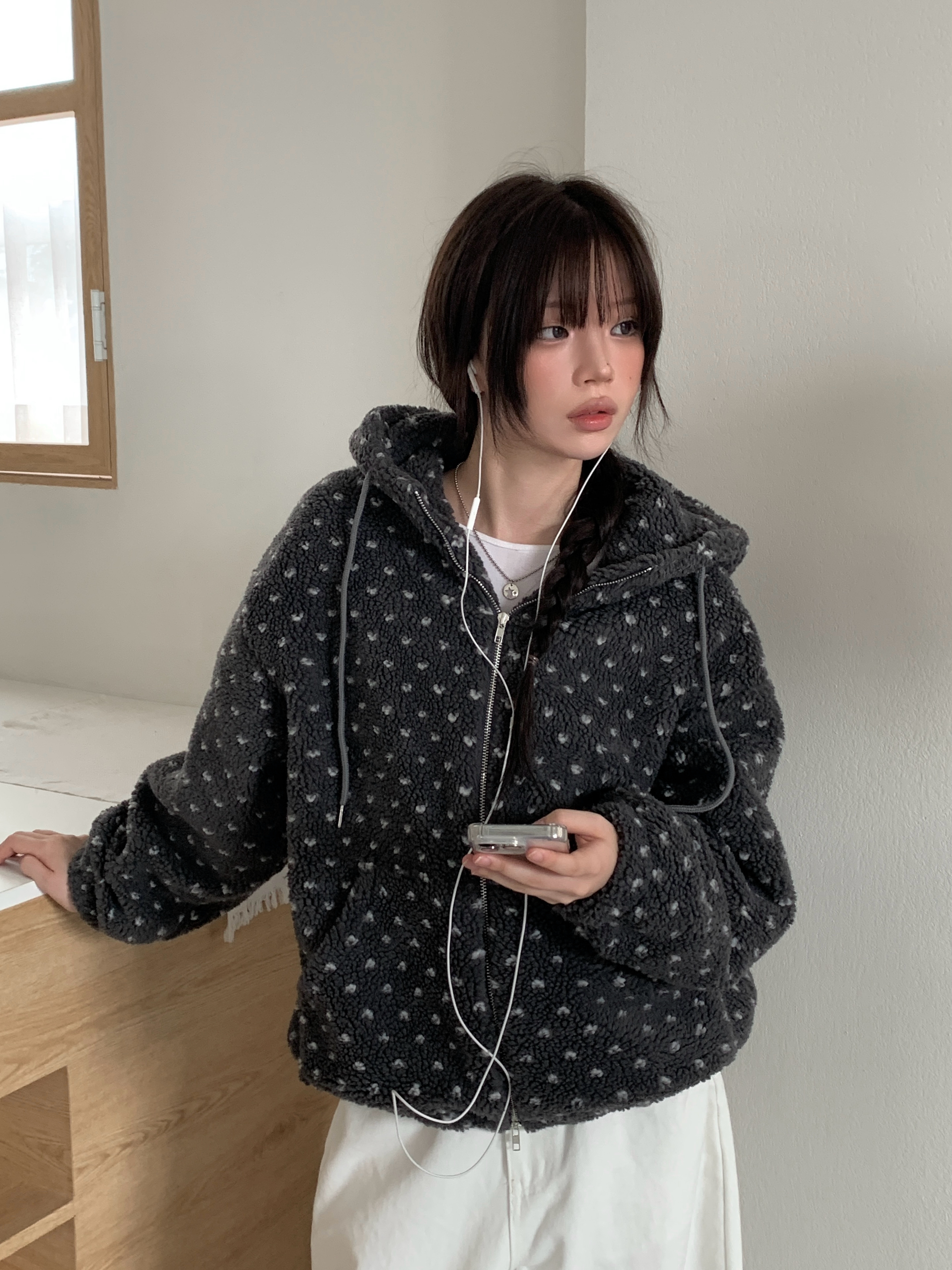 ハート模様ドット柄フリースジップパーカー