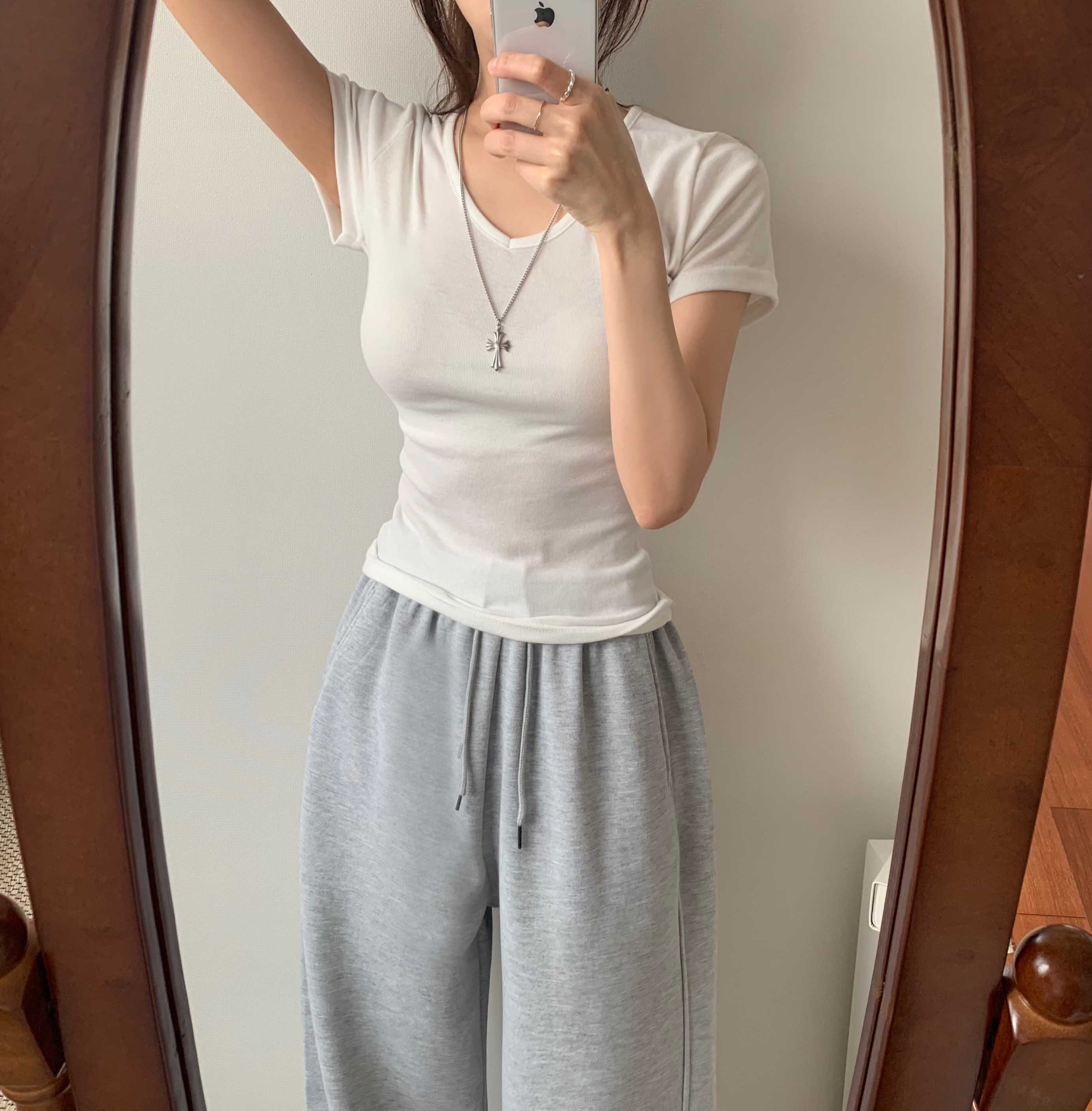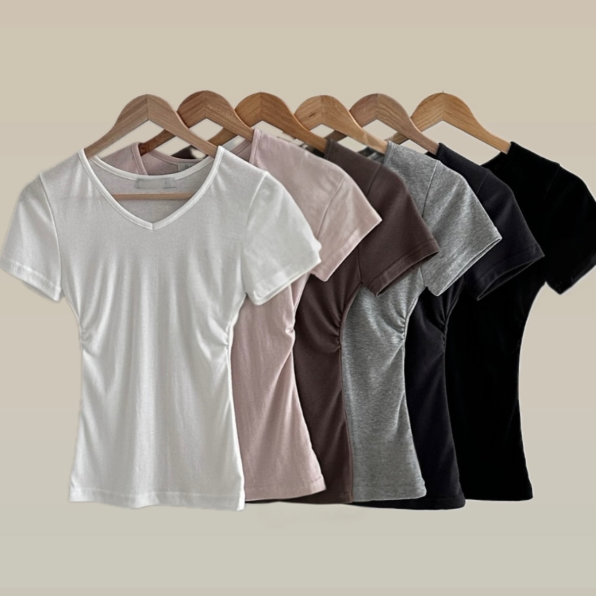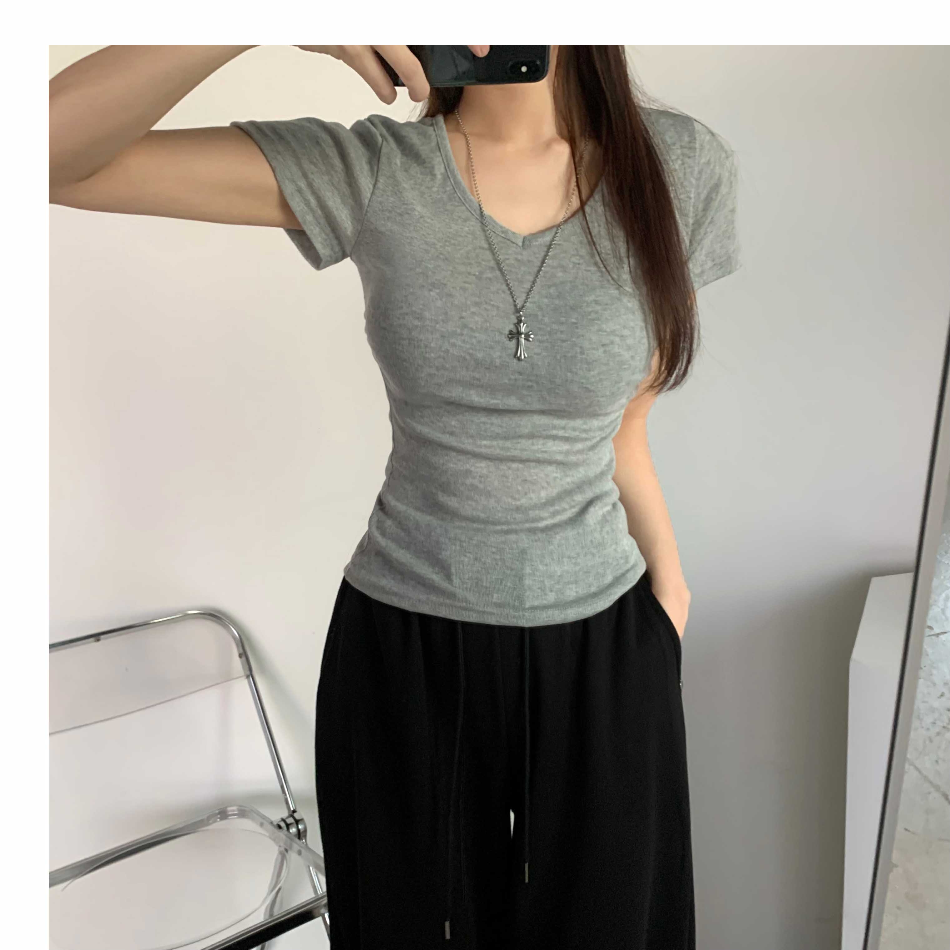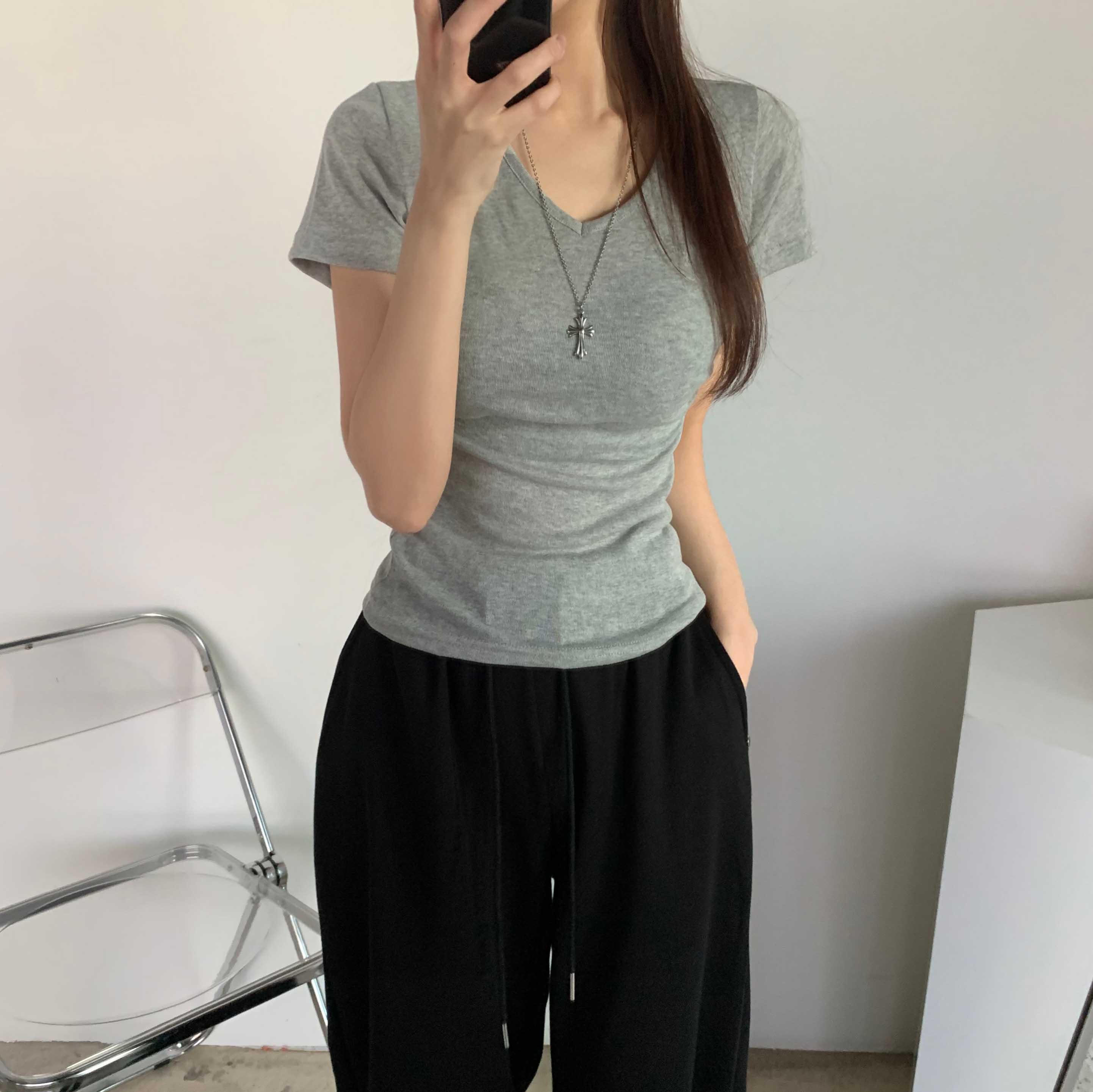 [6color]サイドシャーリングVネックスリム半袖Tシャツ
