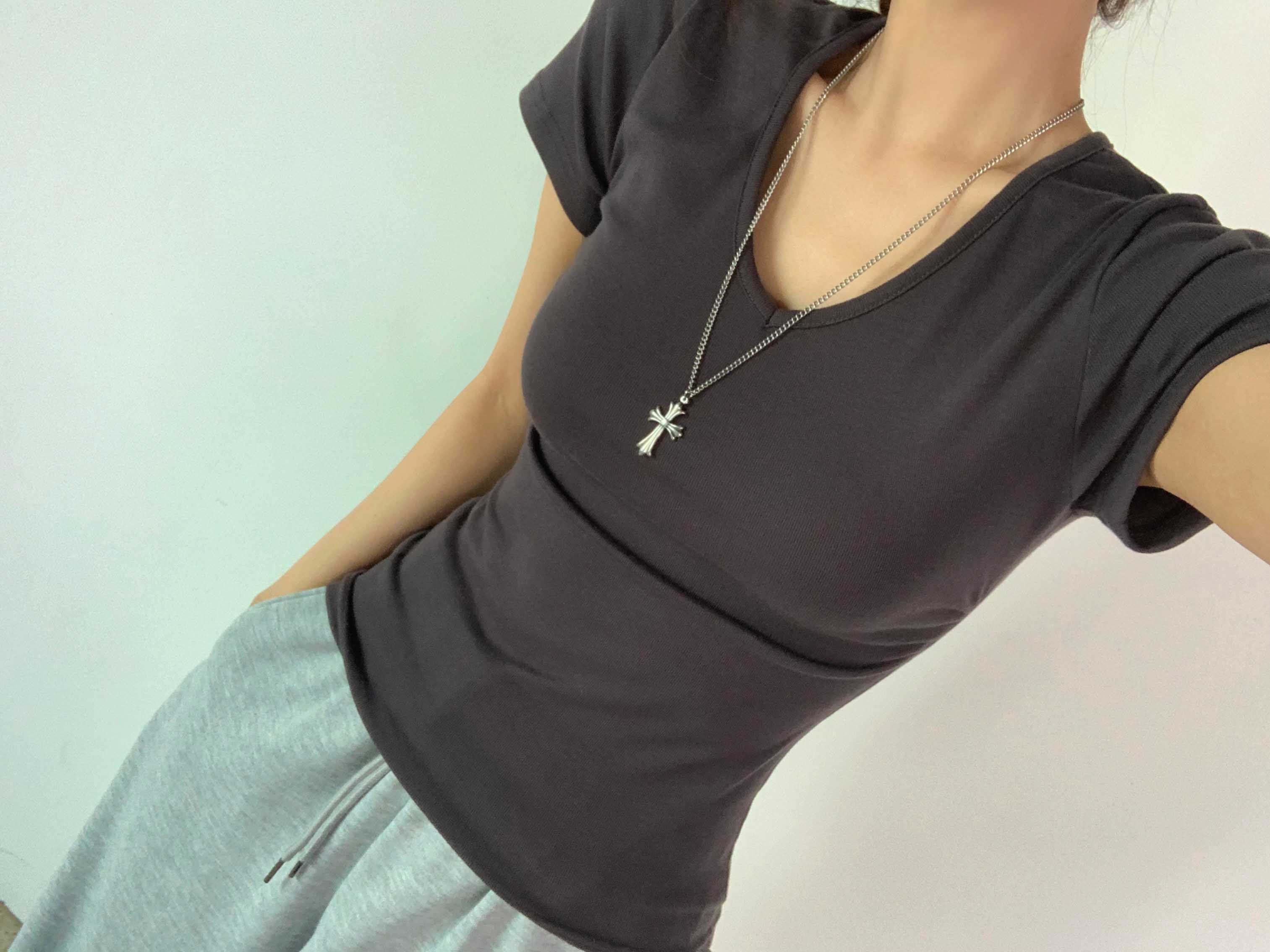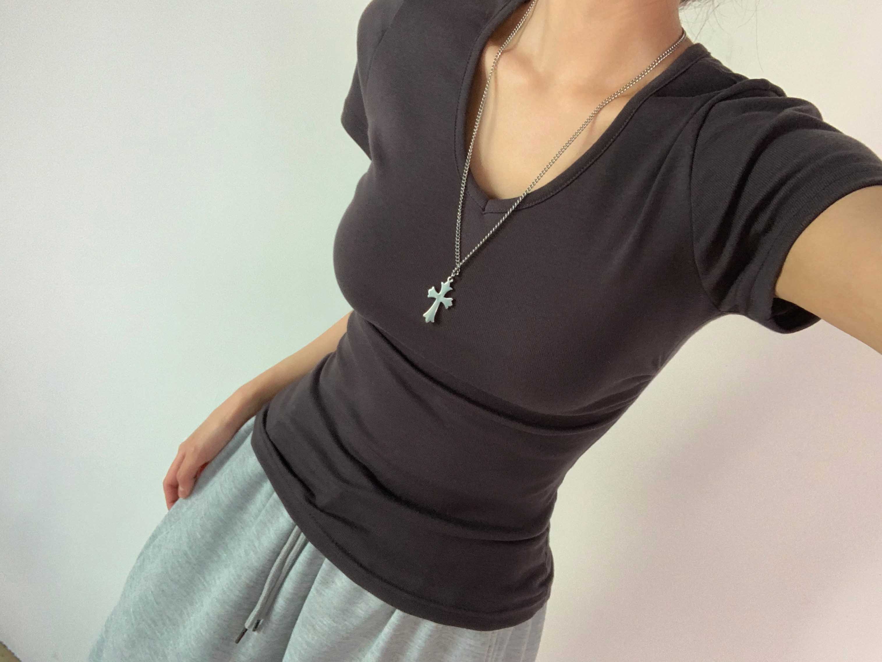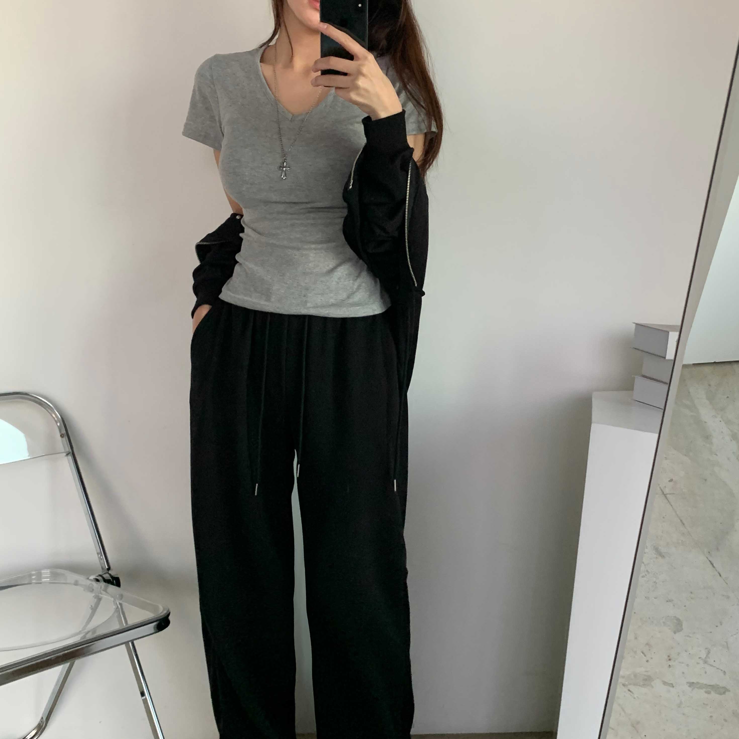[6color]サイドシャーリングVネックスリム半袖Tシャツ