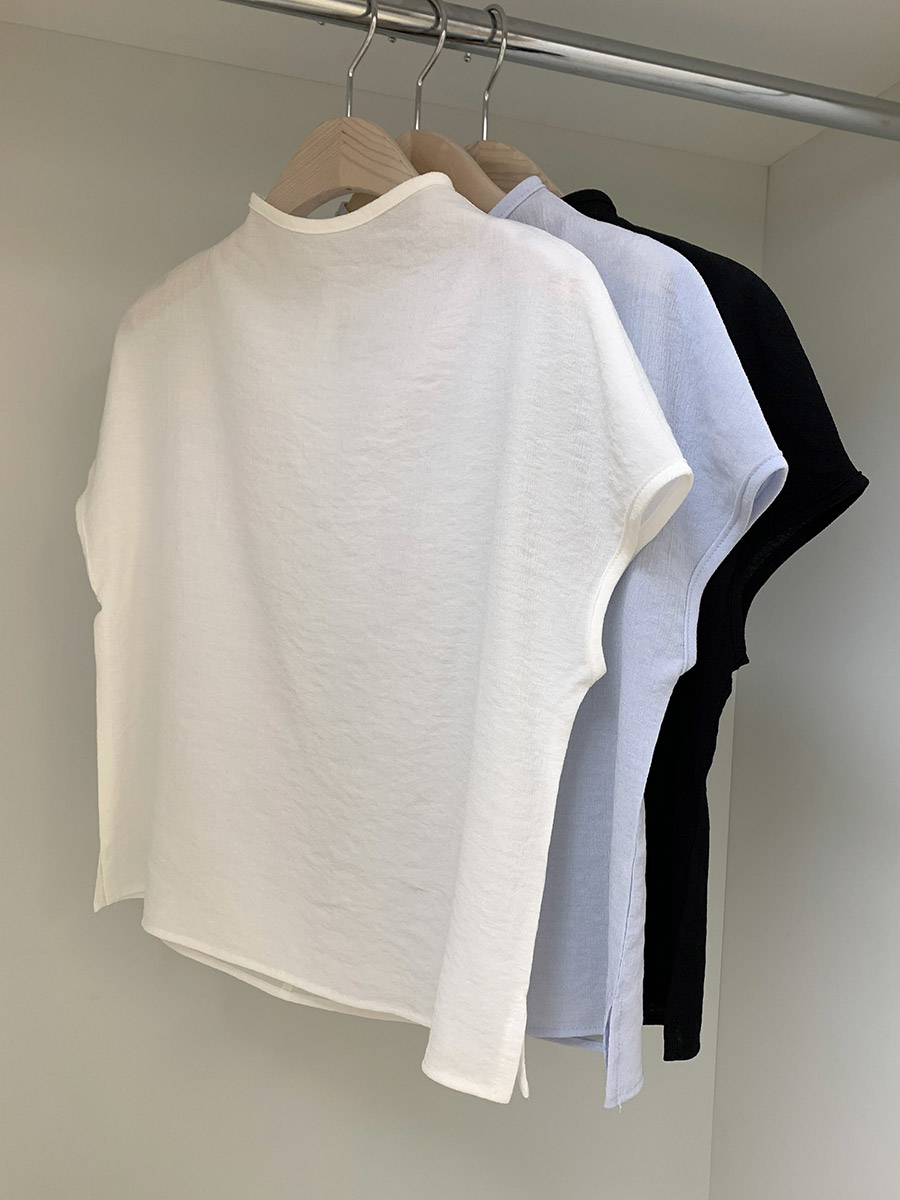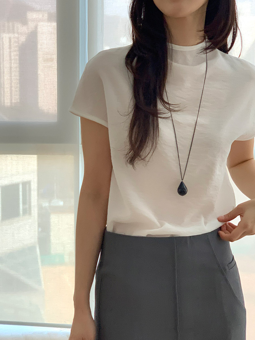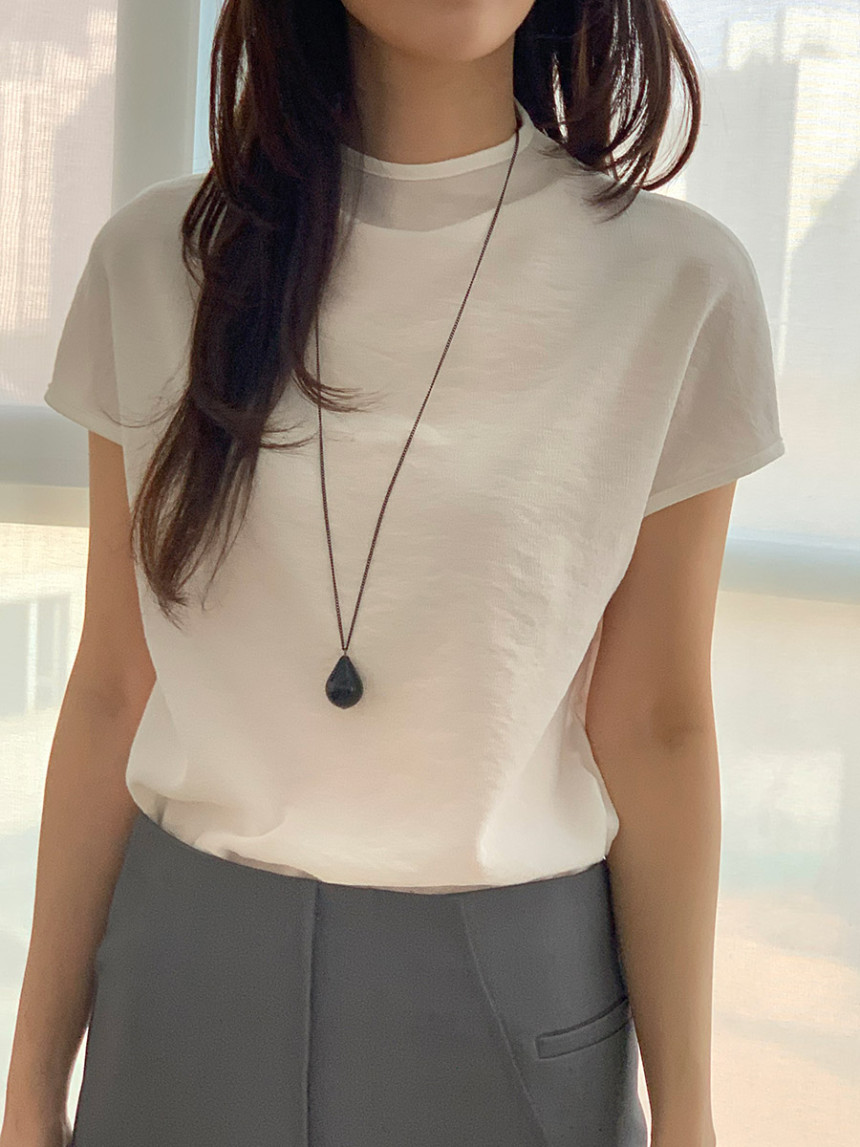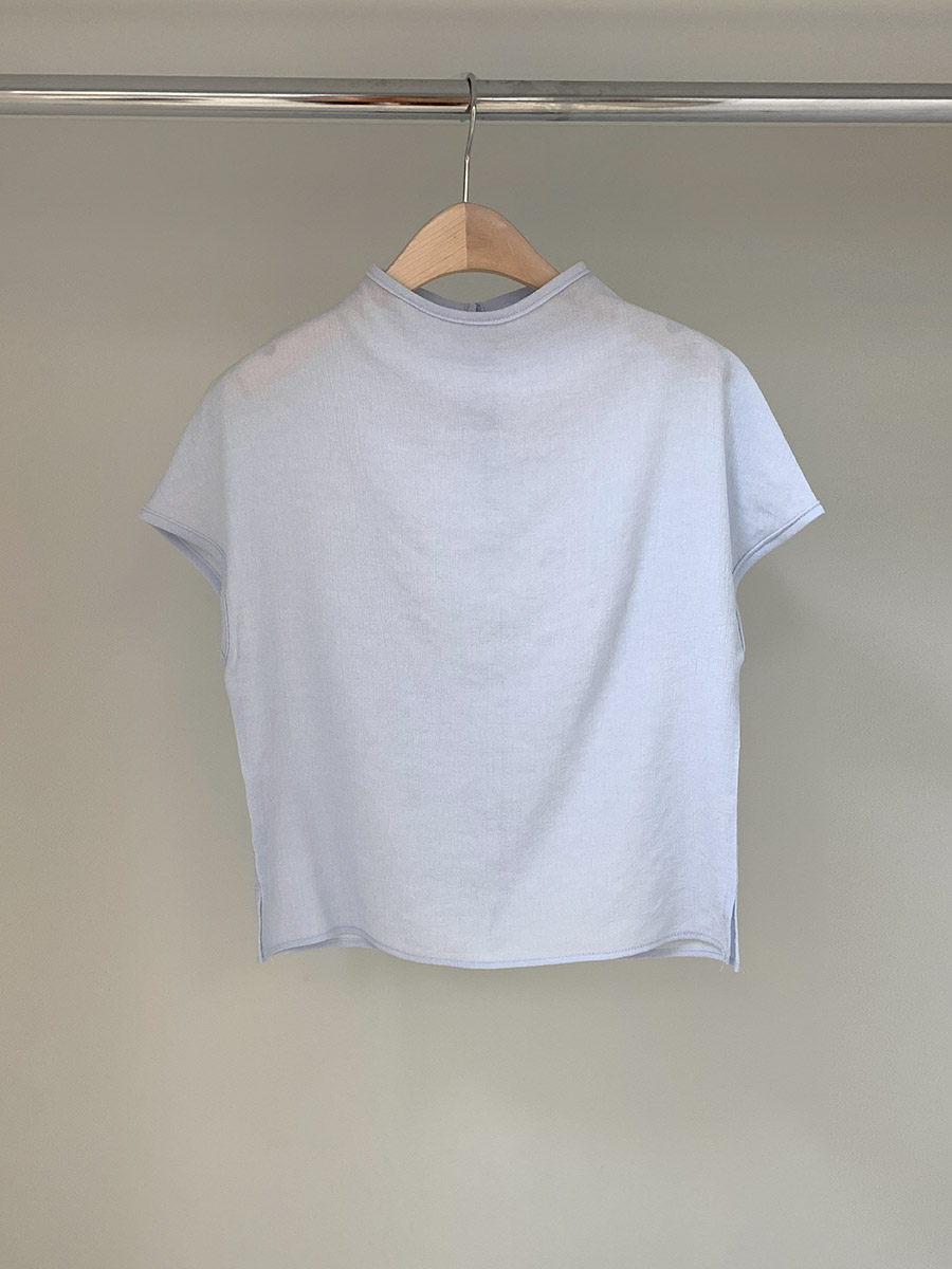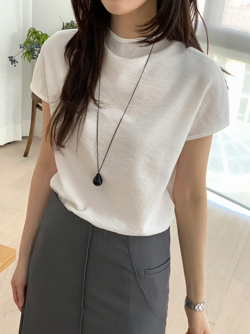 ハーフネックシースルーラグランリンクル半袖ブラウス