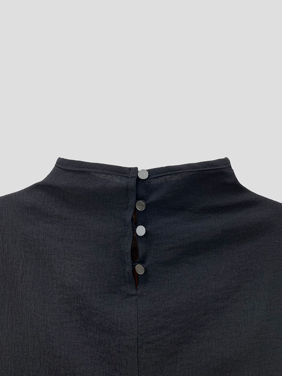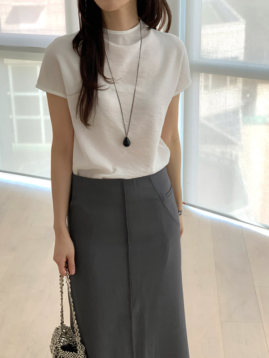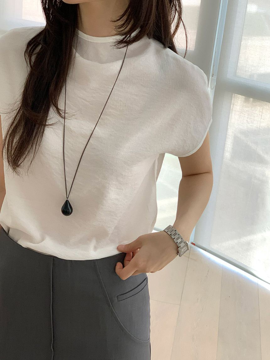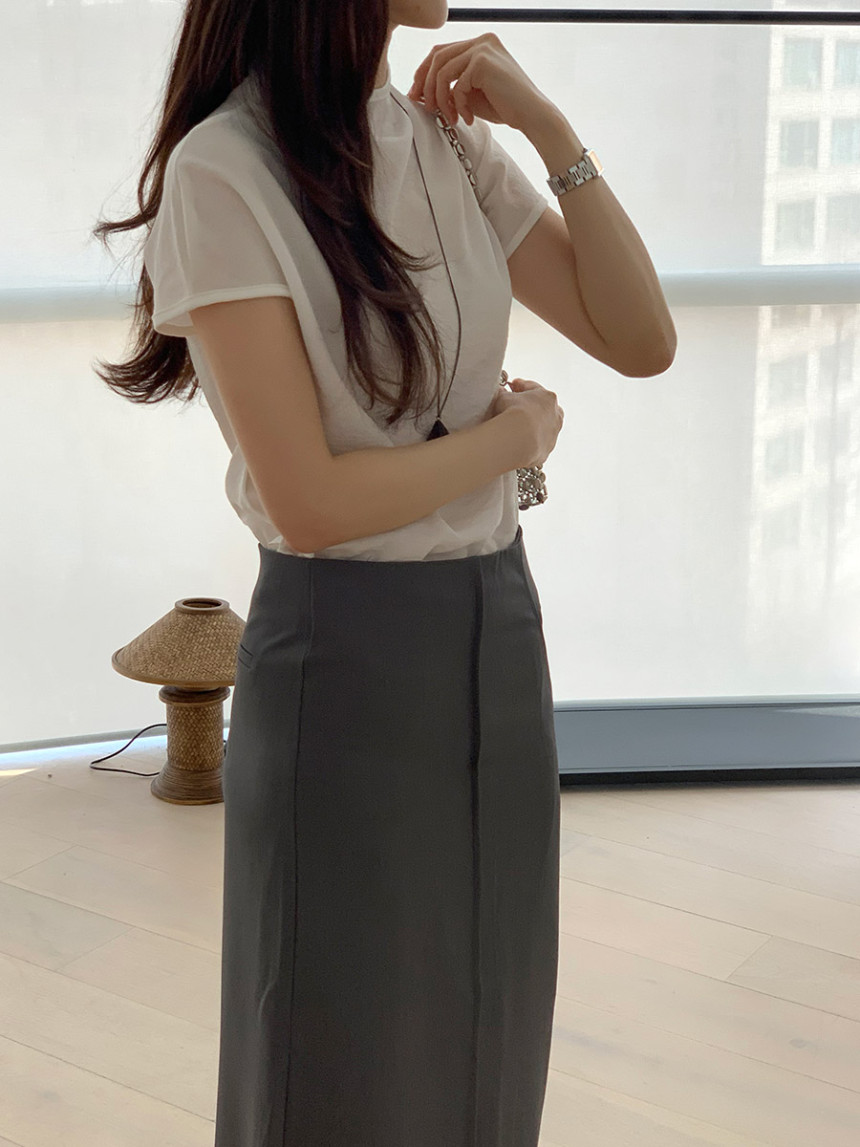 ハーフネックシースルーラグランリンクル半袖ブラウス