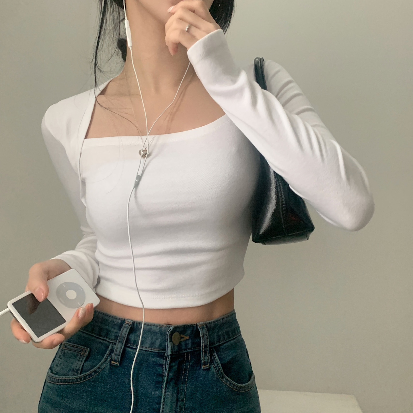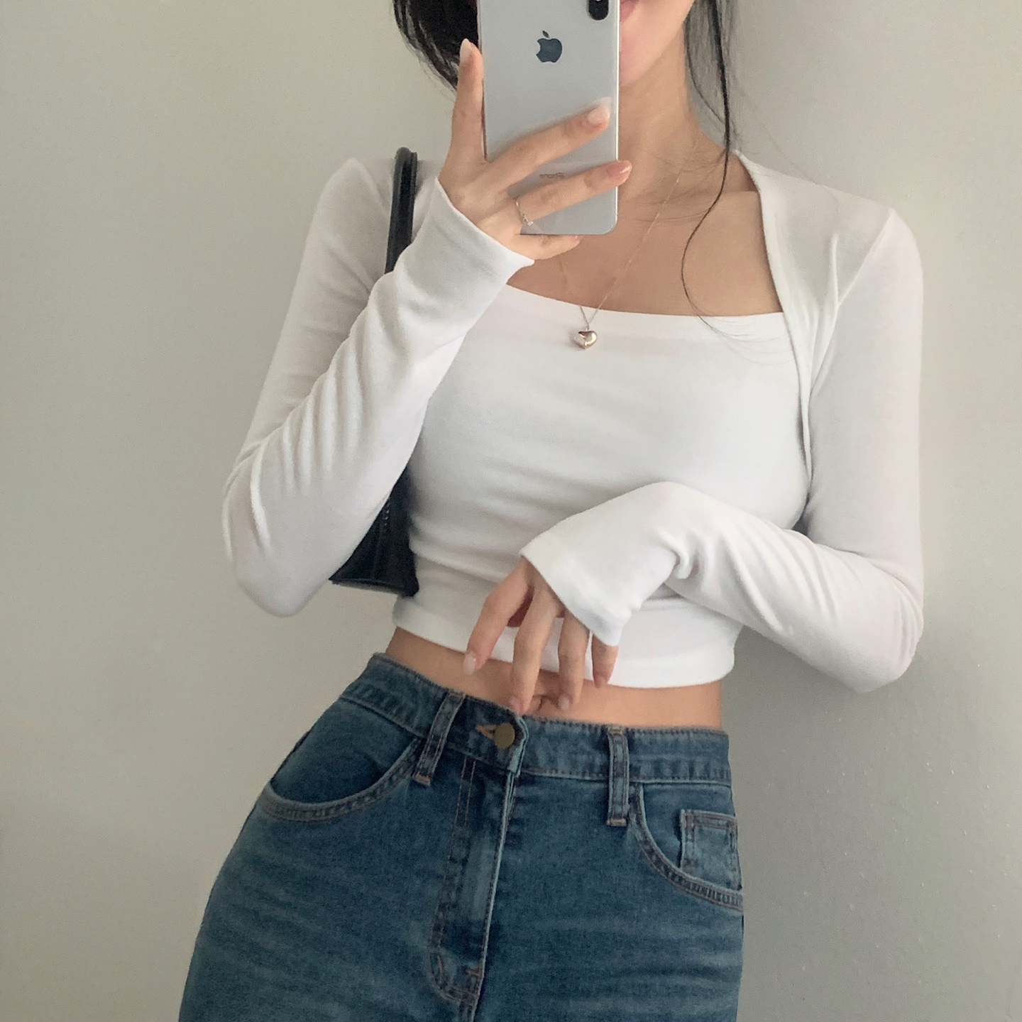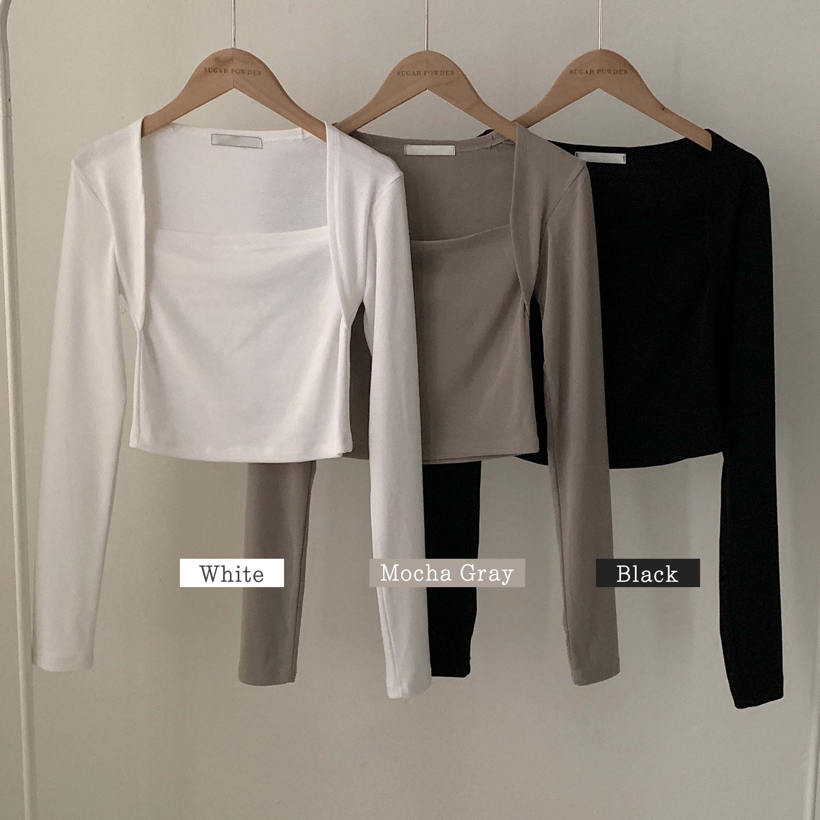 [一体型/裏起毛] スクエアネックボレロ+クロップド長袖Tシャツ-3color