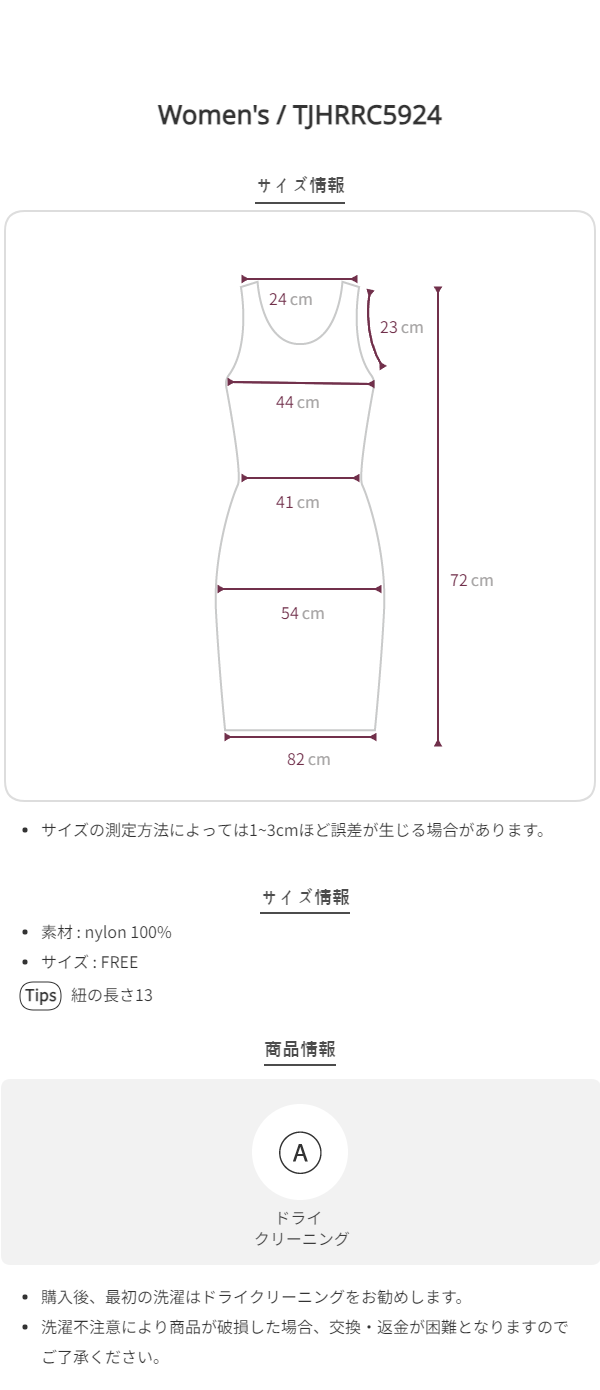 - ニットまたは伸縮性に優れている商品は最大±10cm程度のサイズ誤差がある可能性があります。