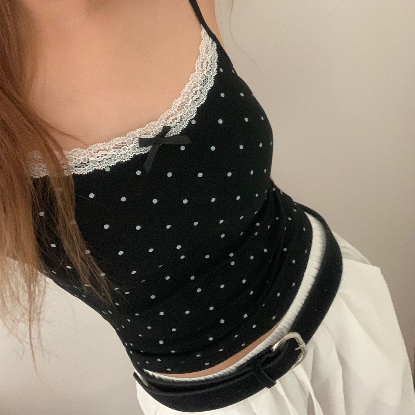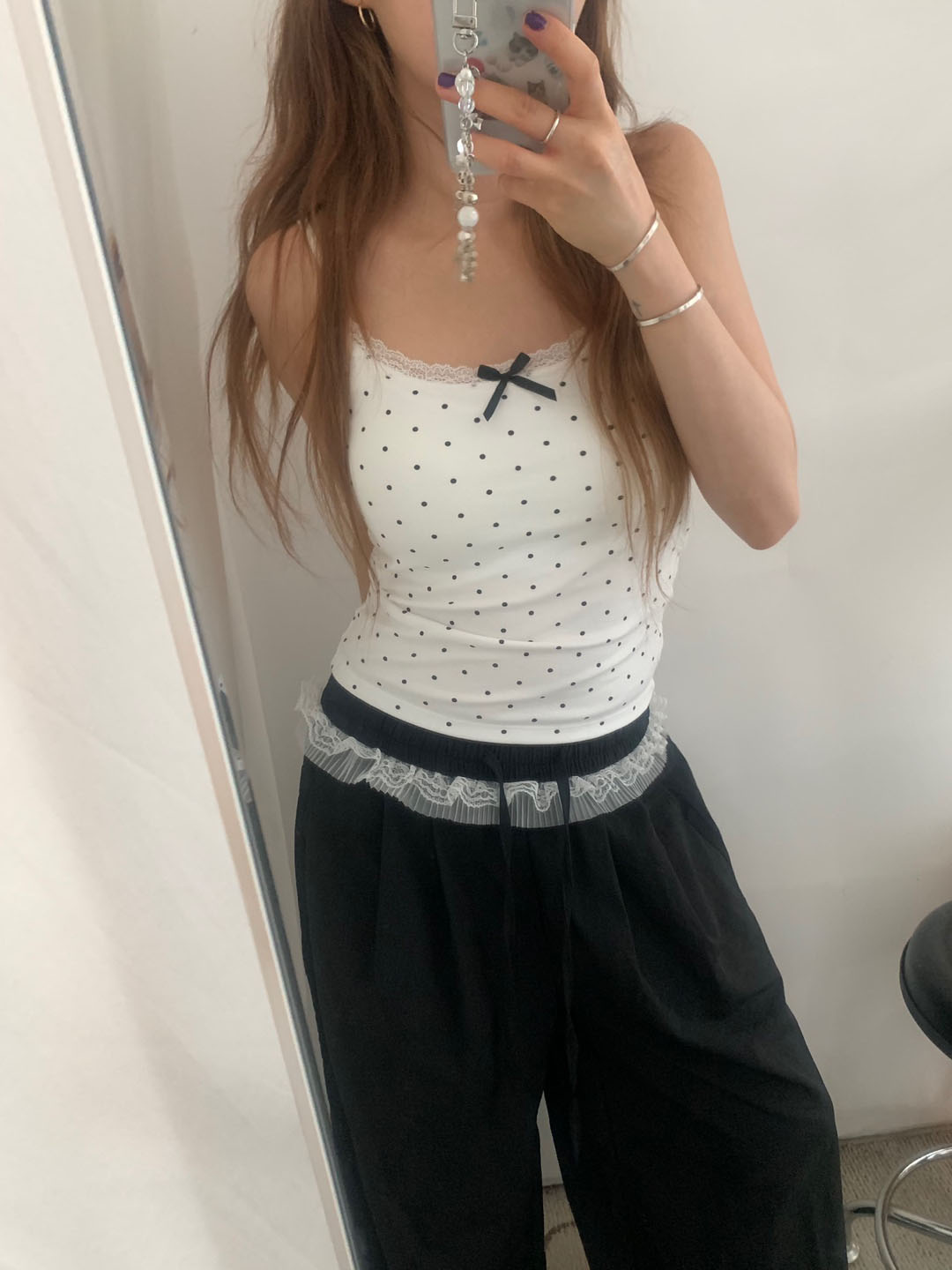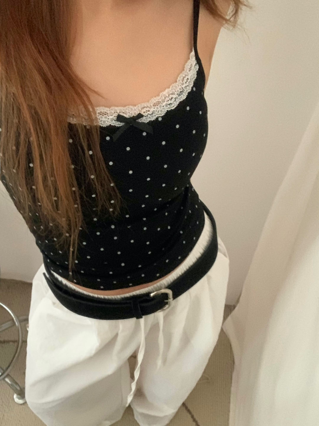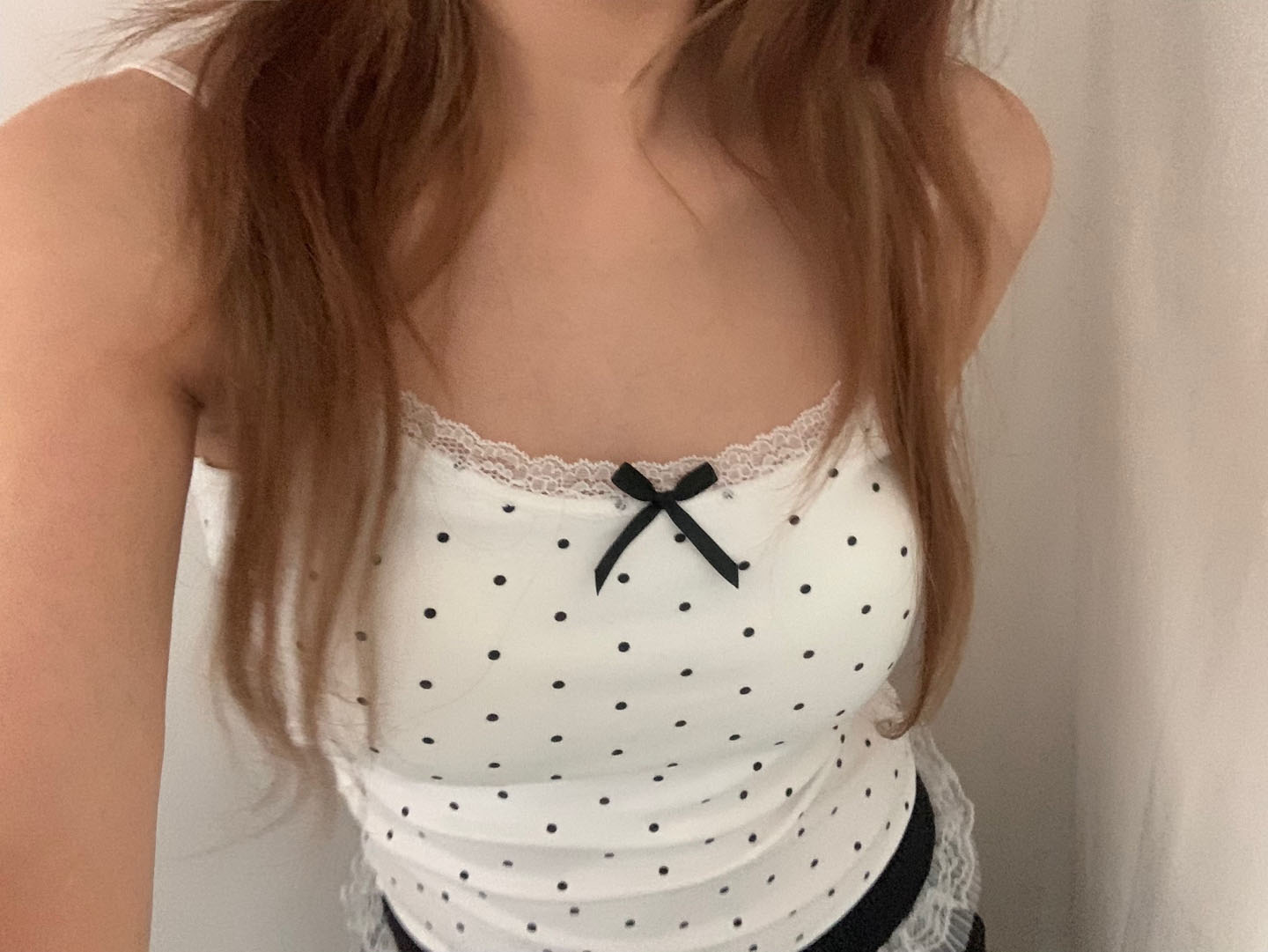 [カップ付き]リボンレースドット柄キャミソール