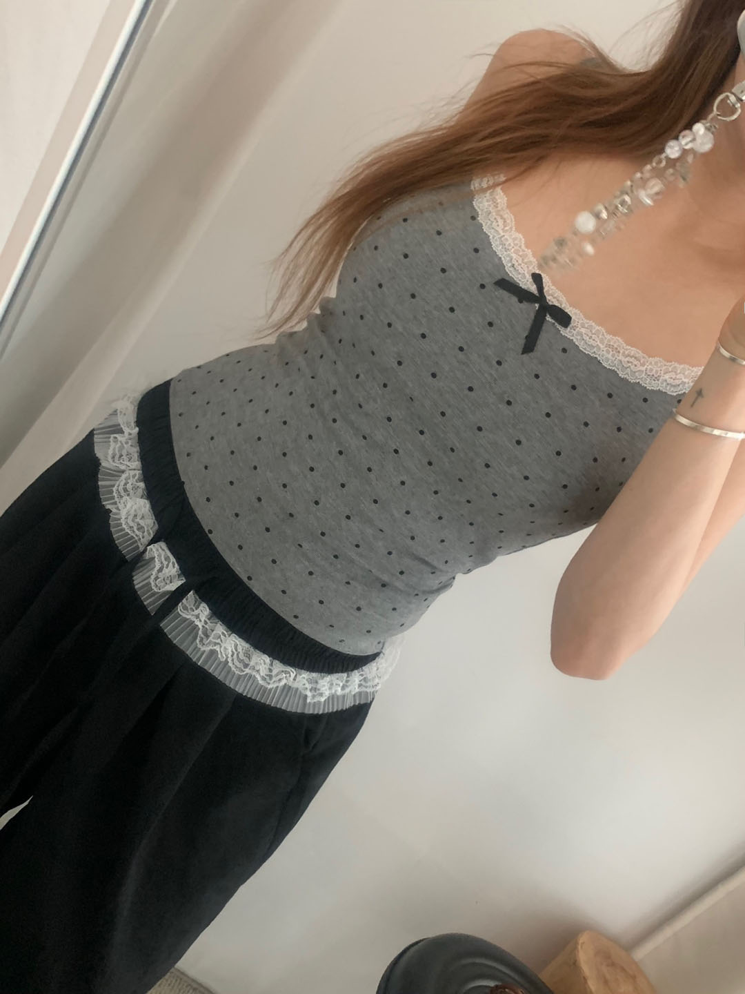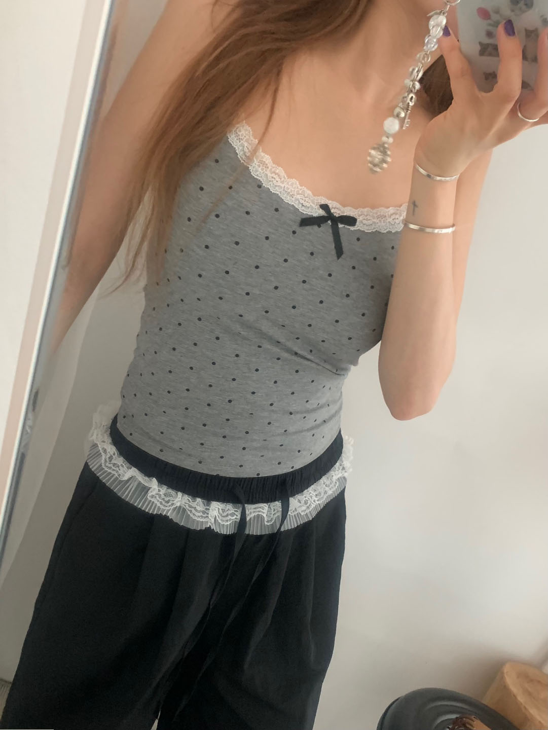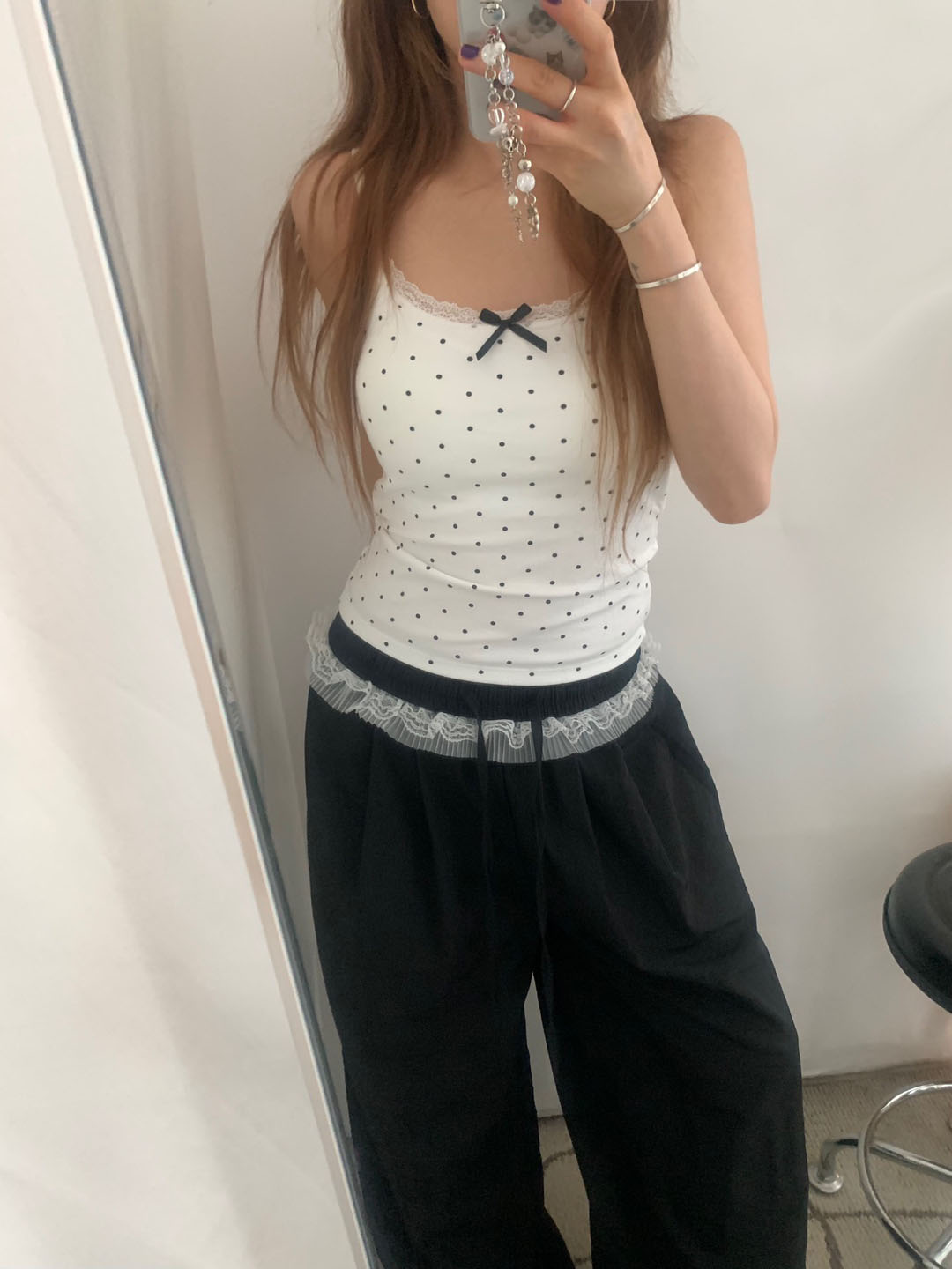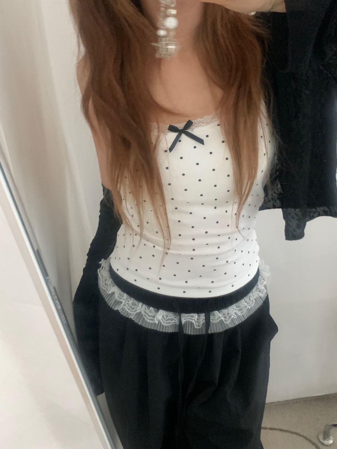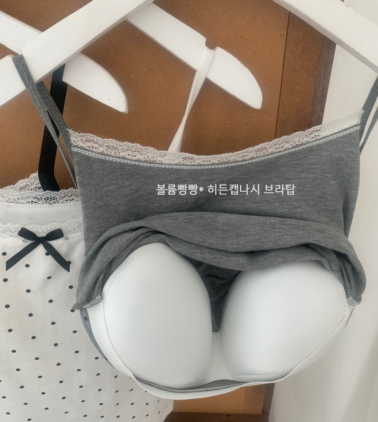 [カップ付き]リボンレースドット柄キャミソール