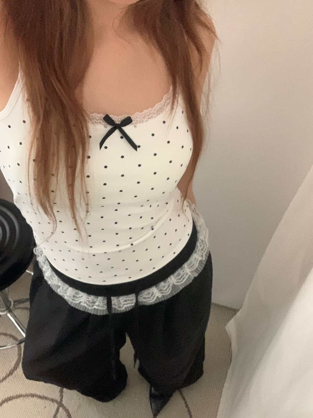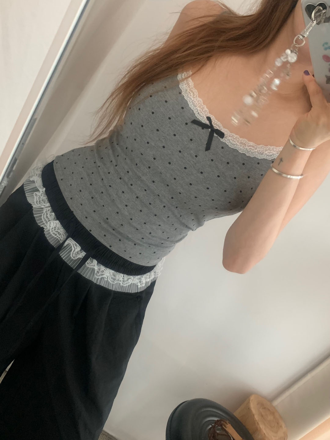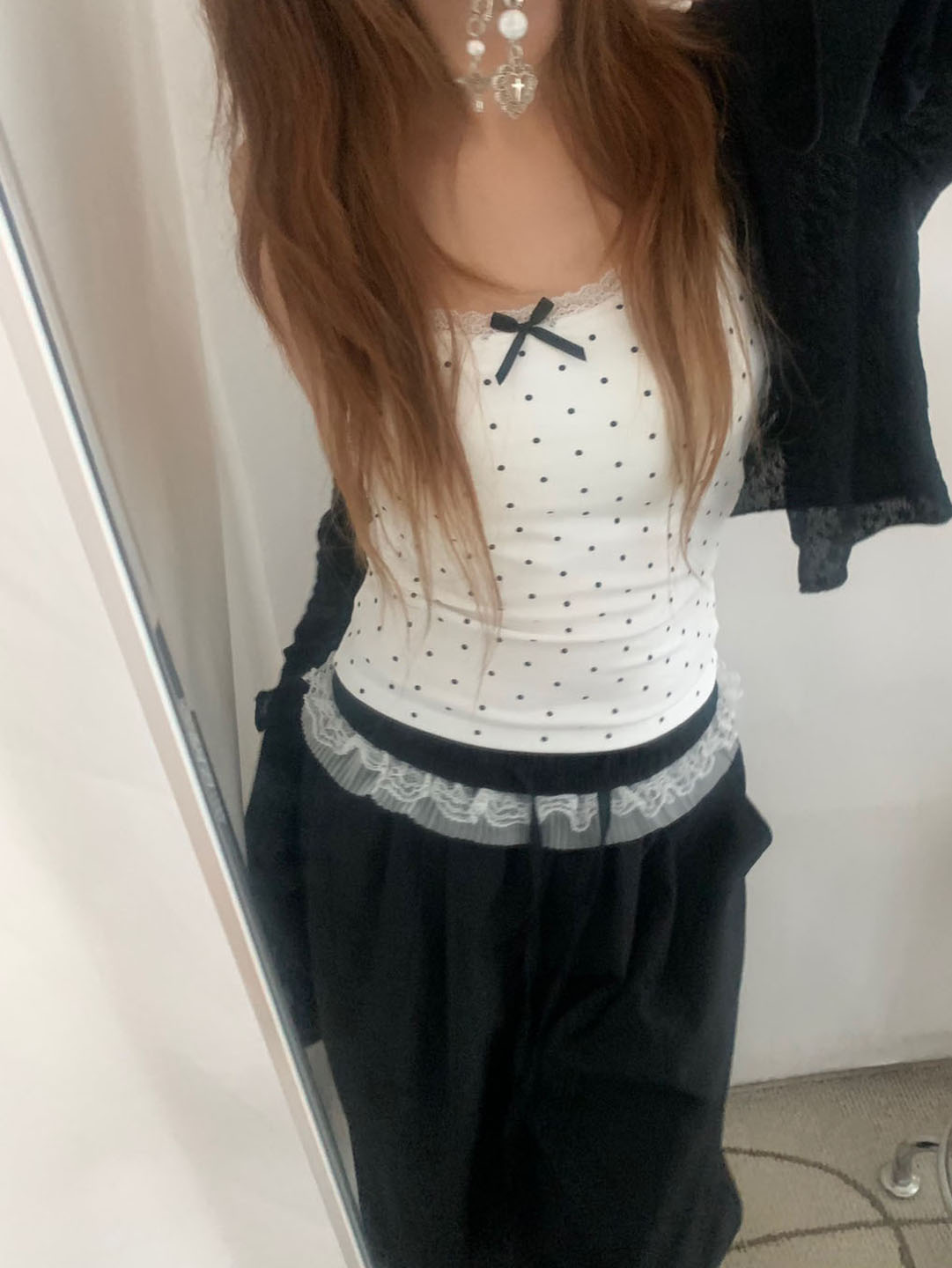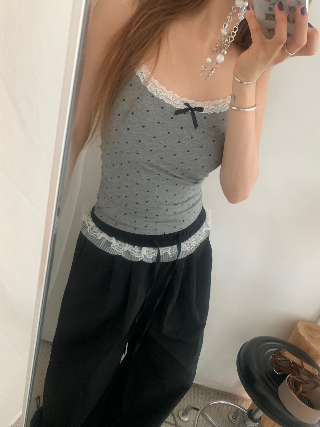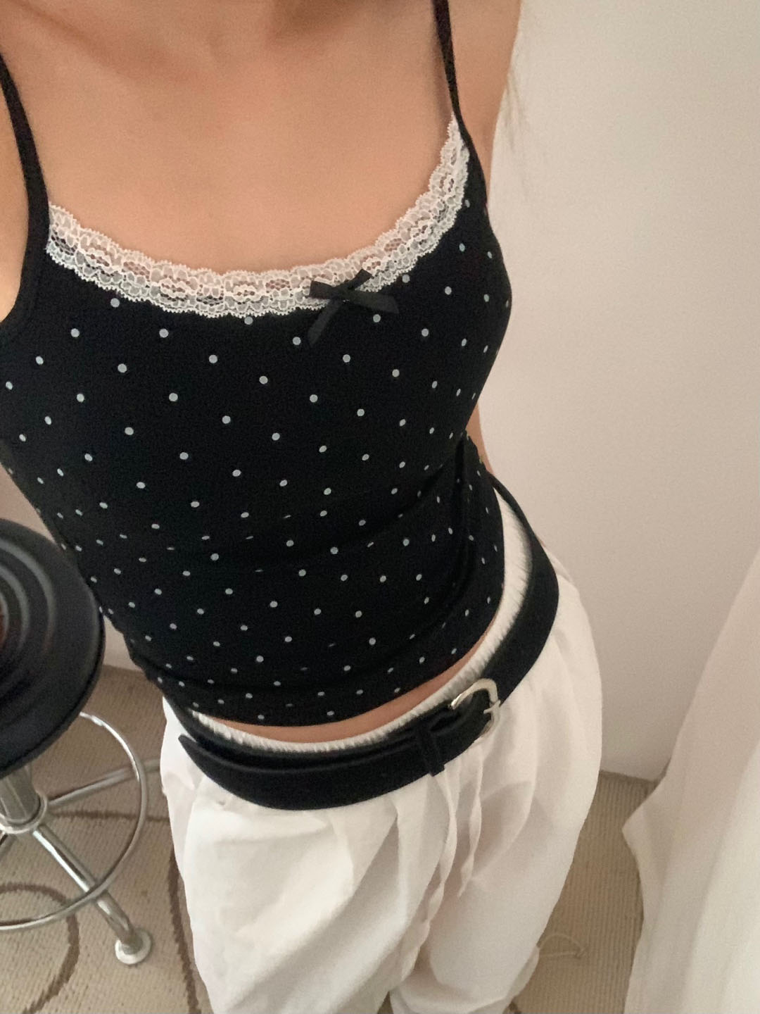 [カップ付き]リボンレースドット柄キャミソール