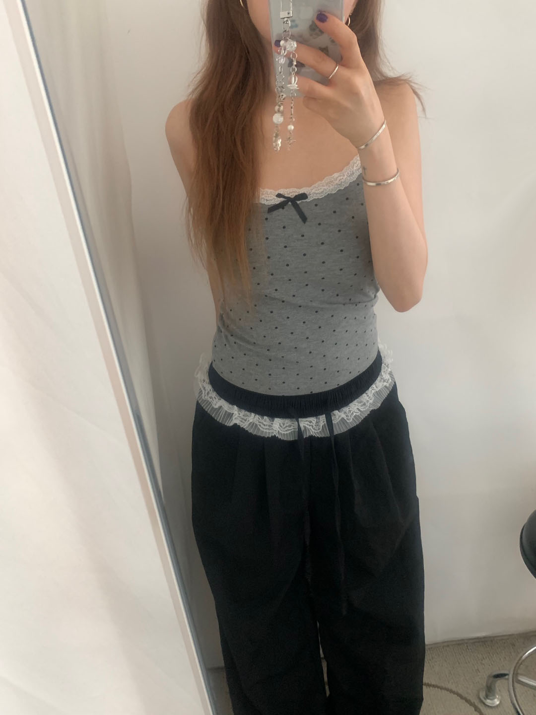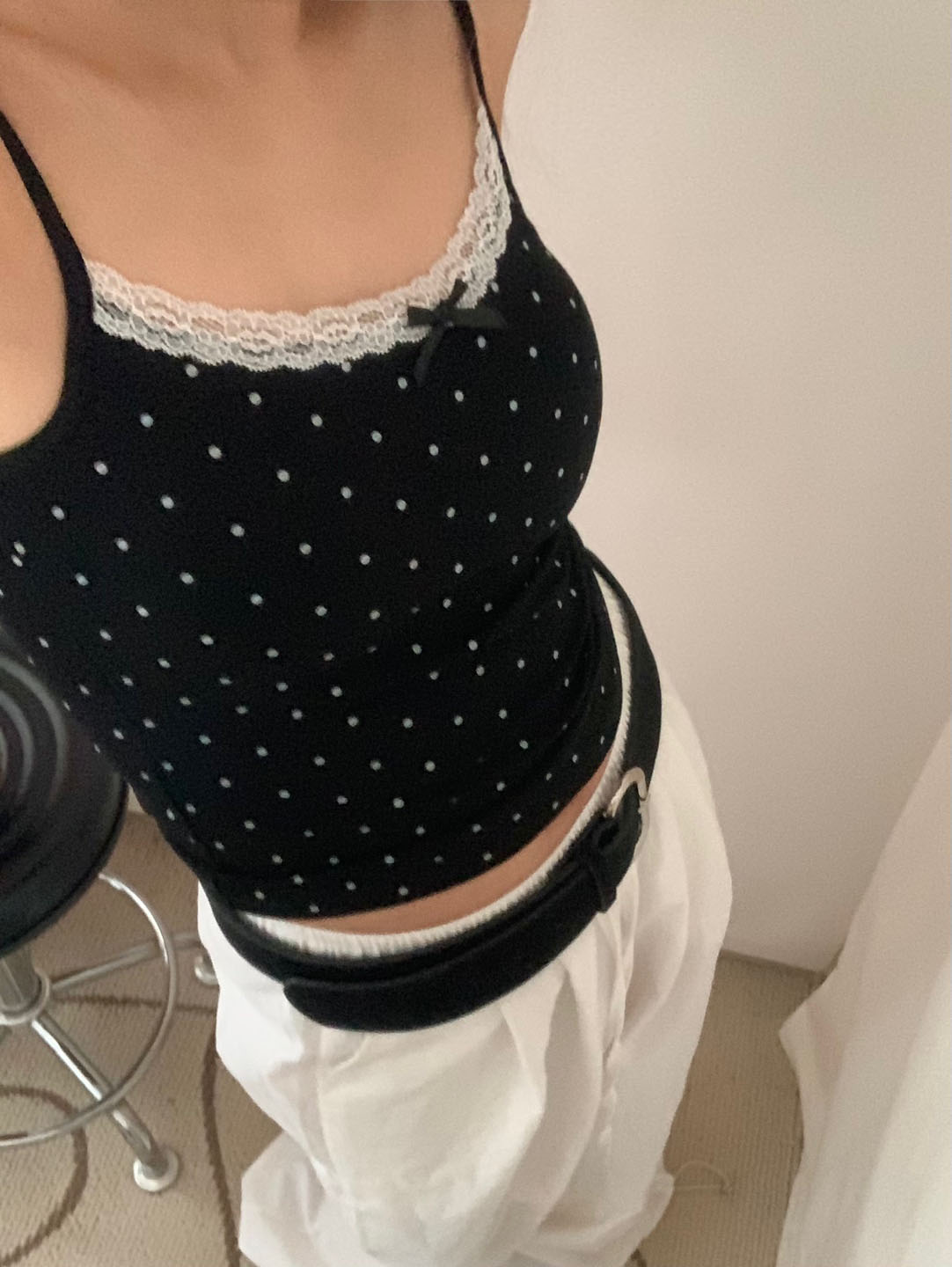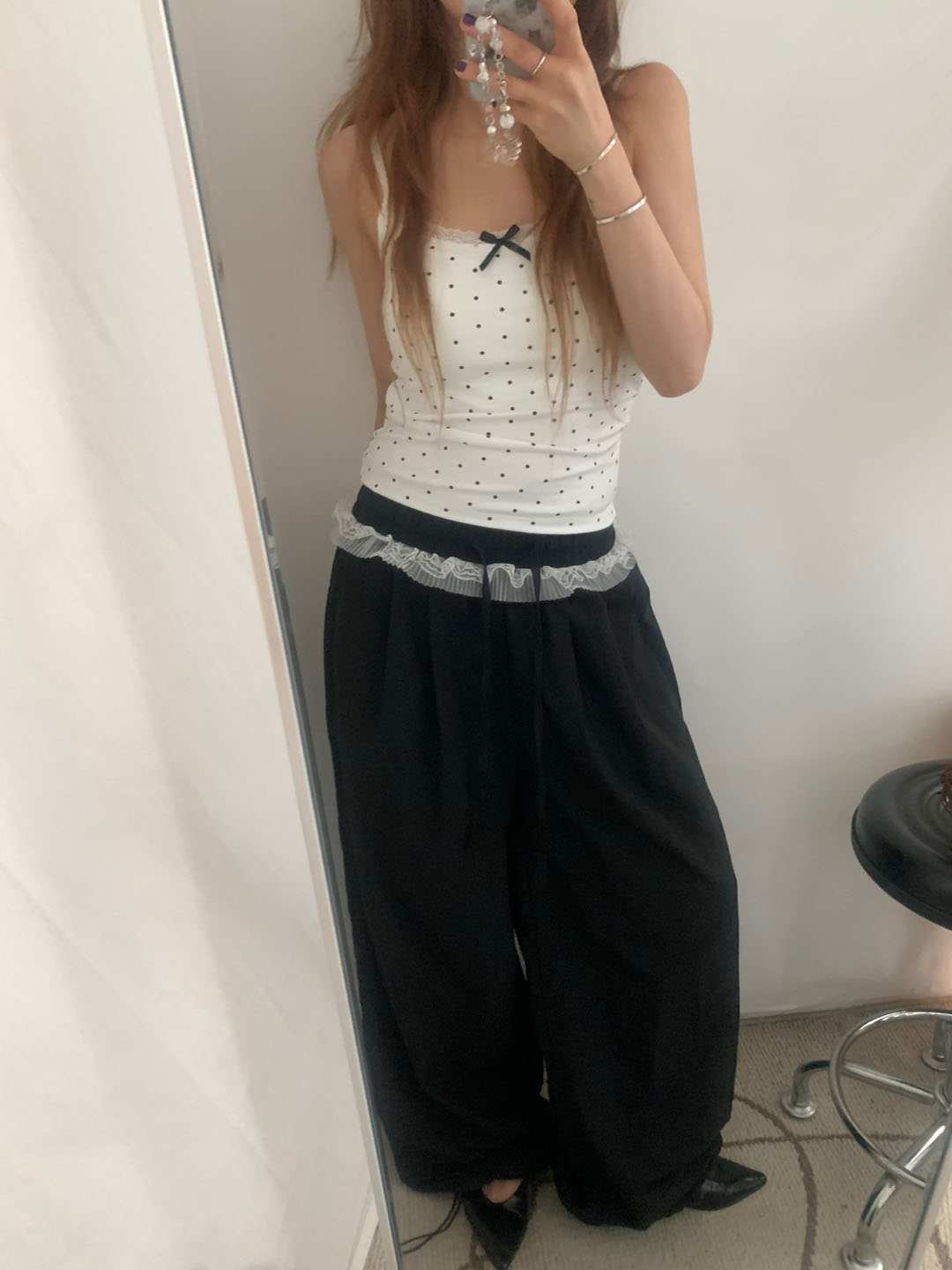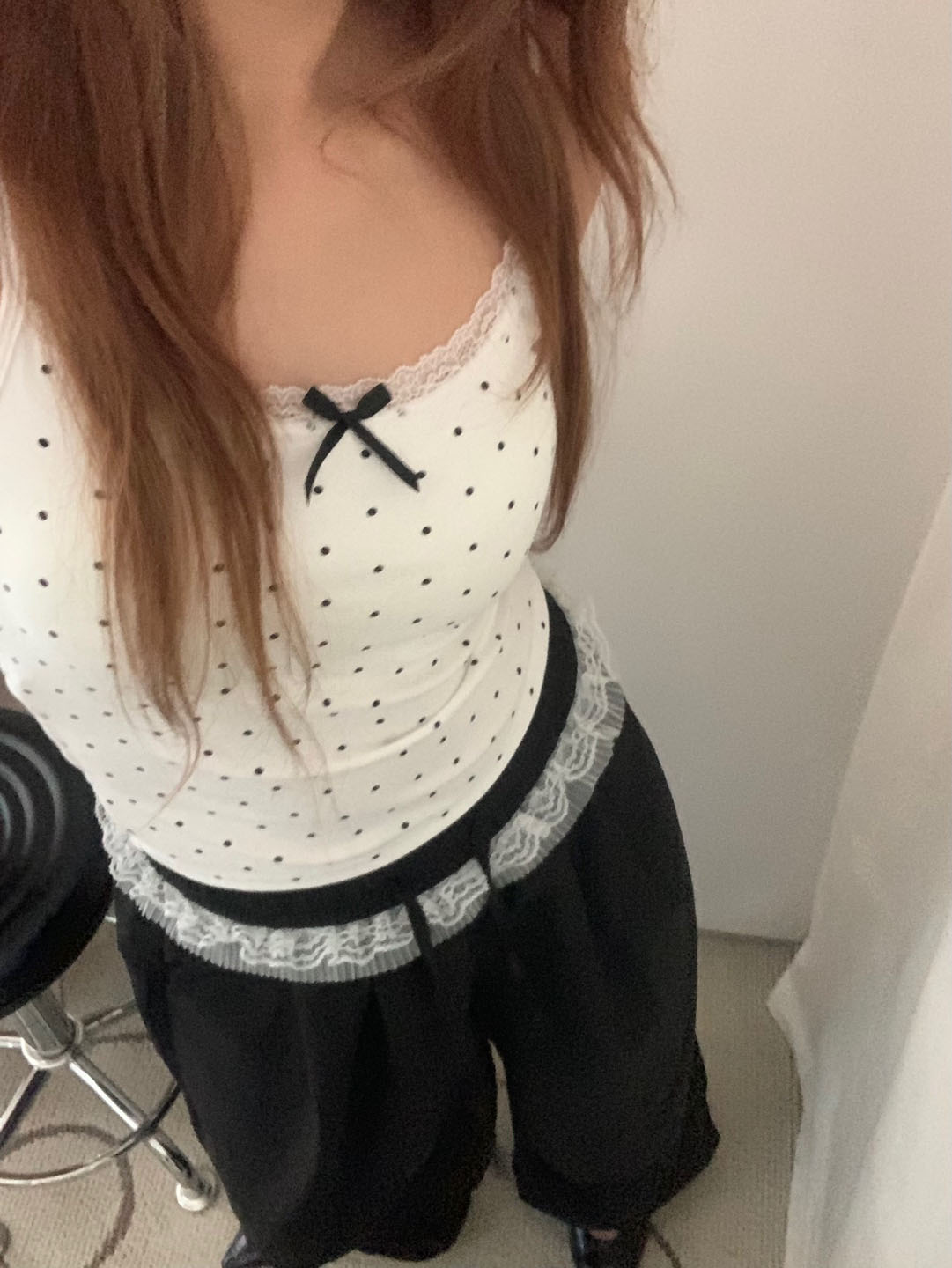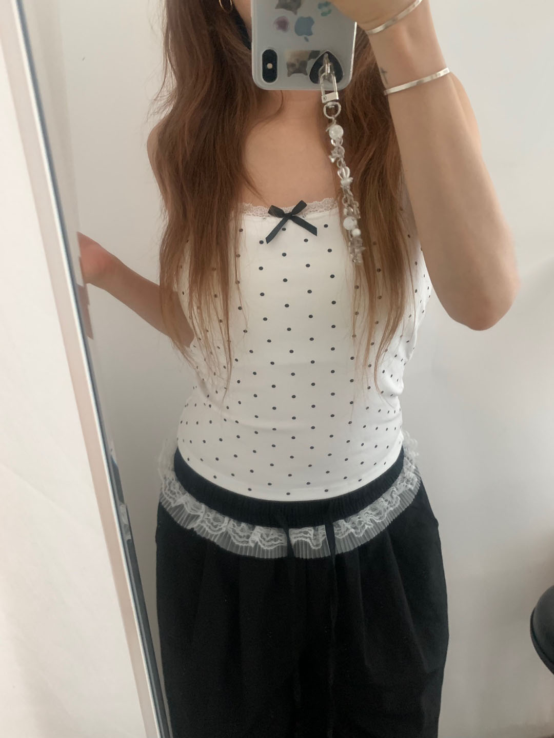 [カップ付き]リボンレースドット柄キャミソール
