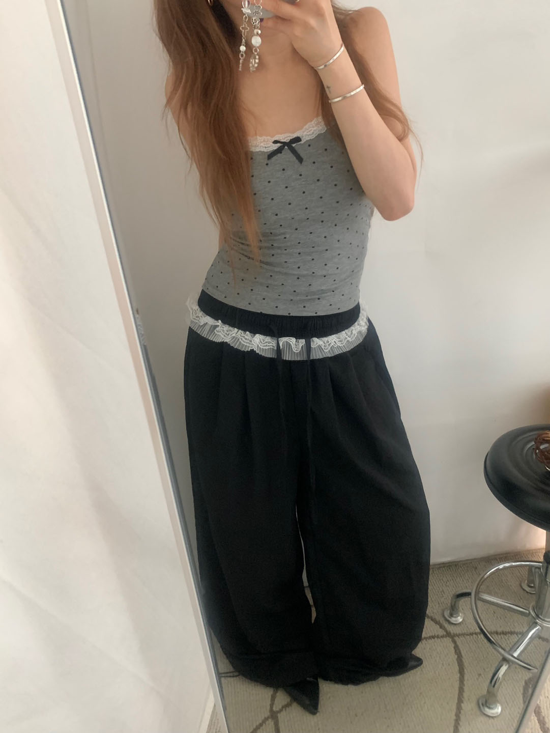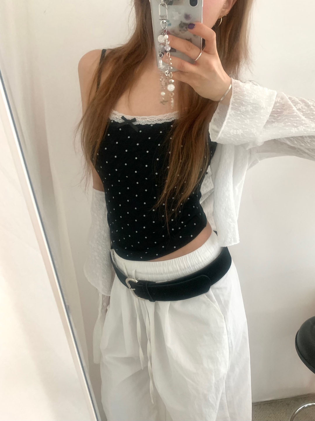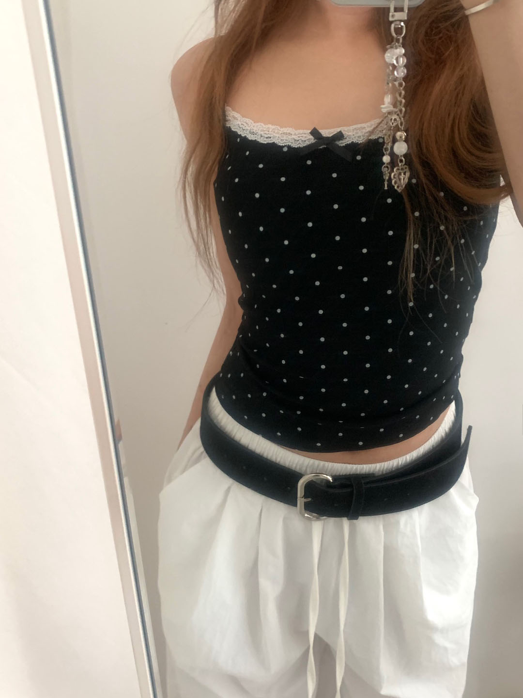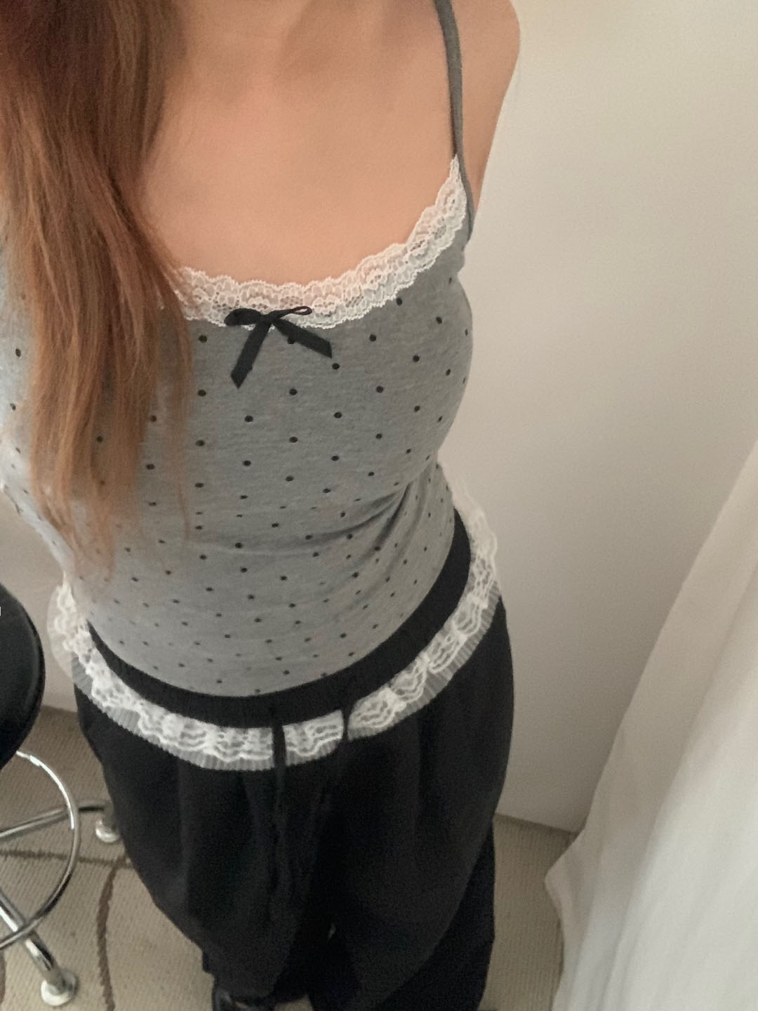 [カップ付き]リボンレースドット柄キャミソール