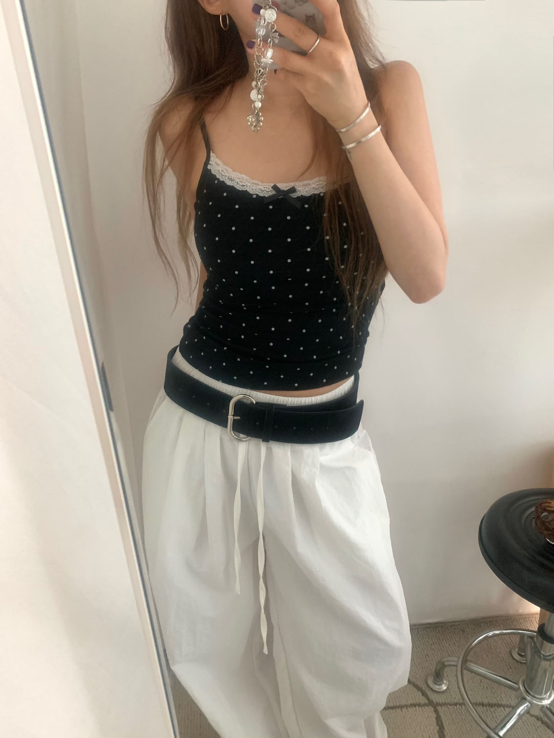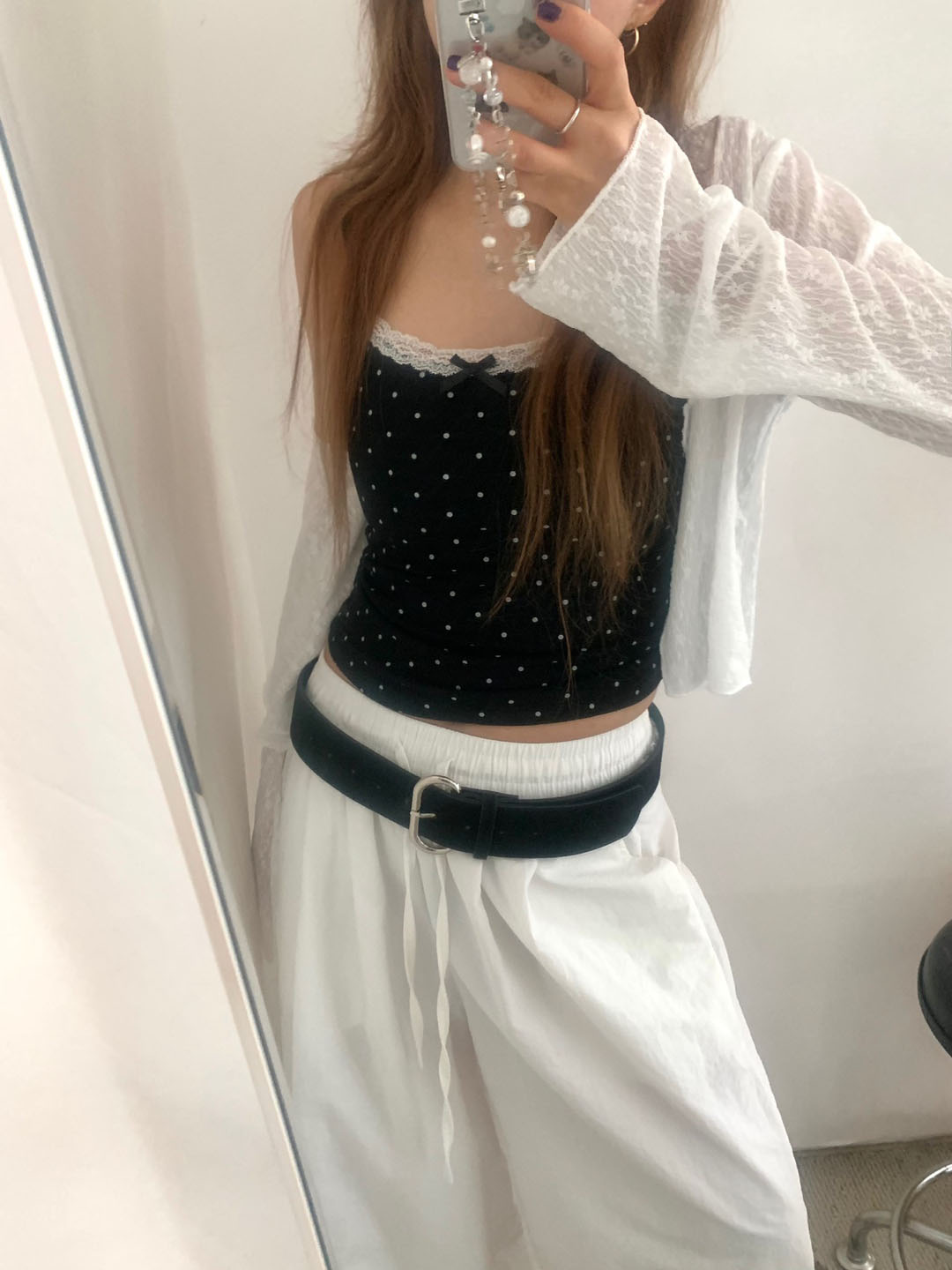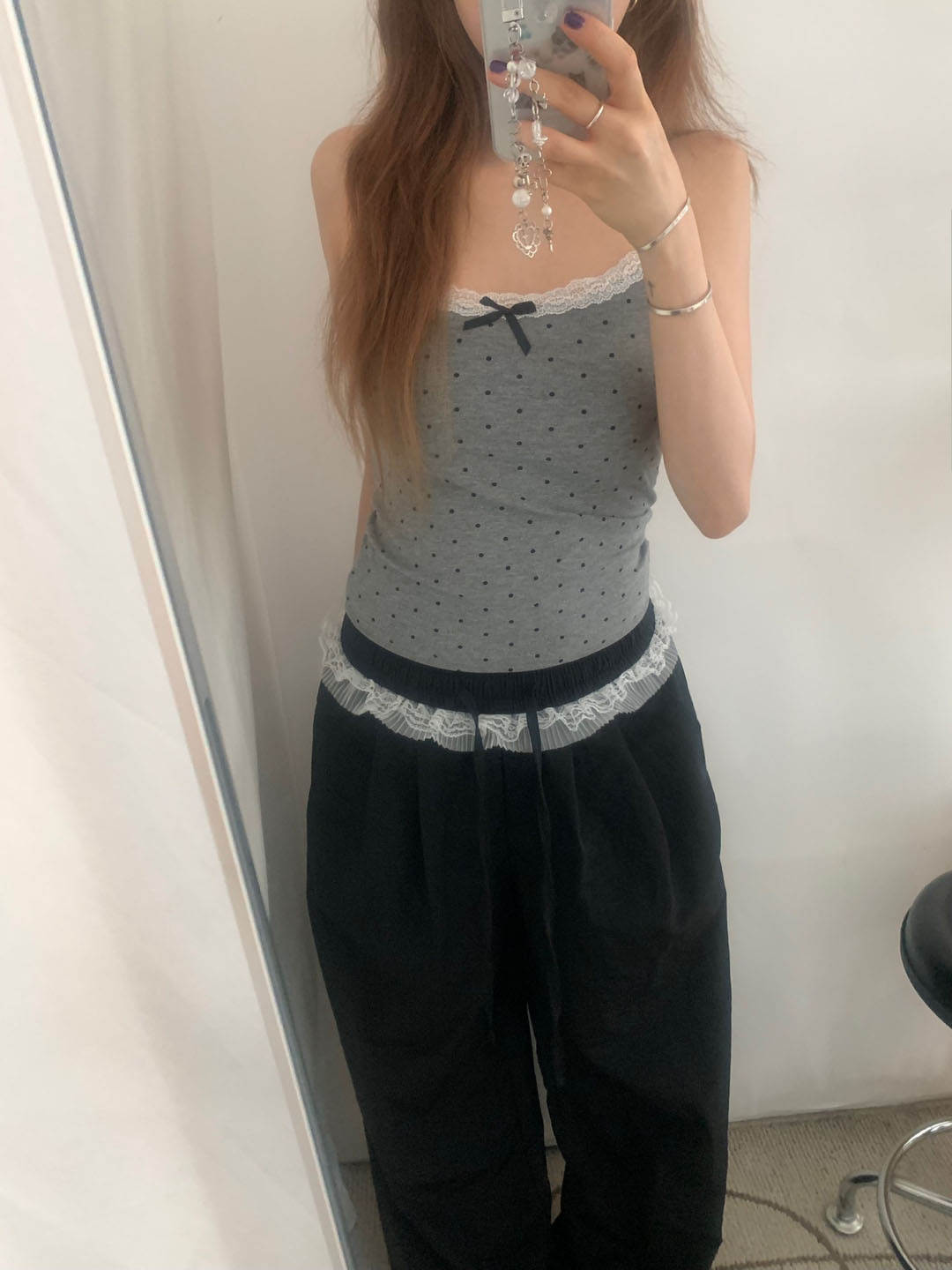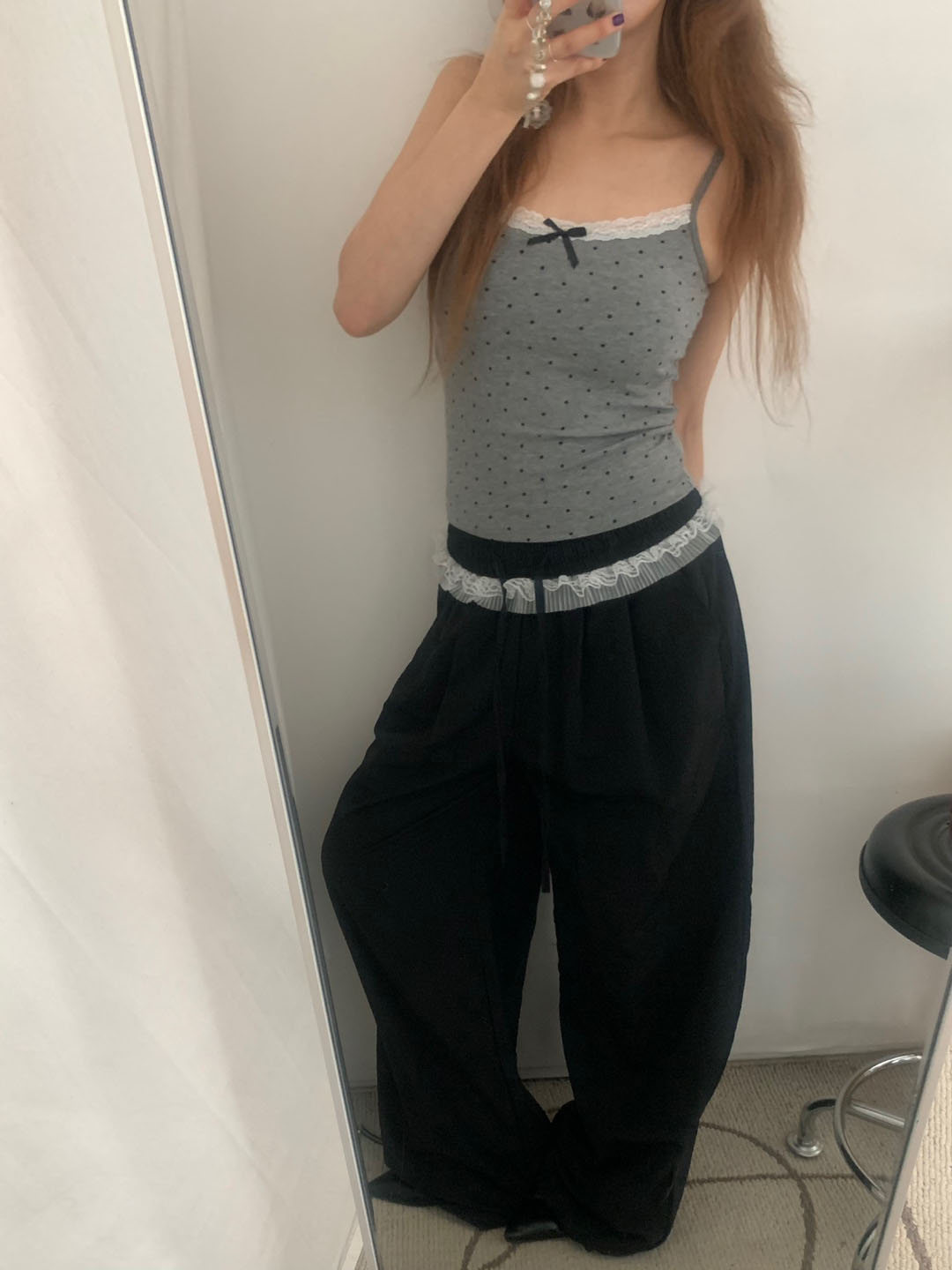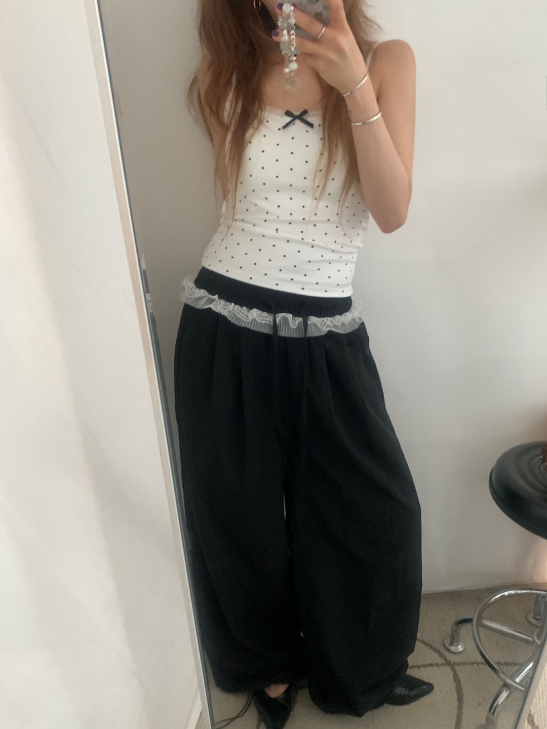 [カップ付き]リボンレースドット柄キャミソール
