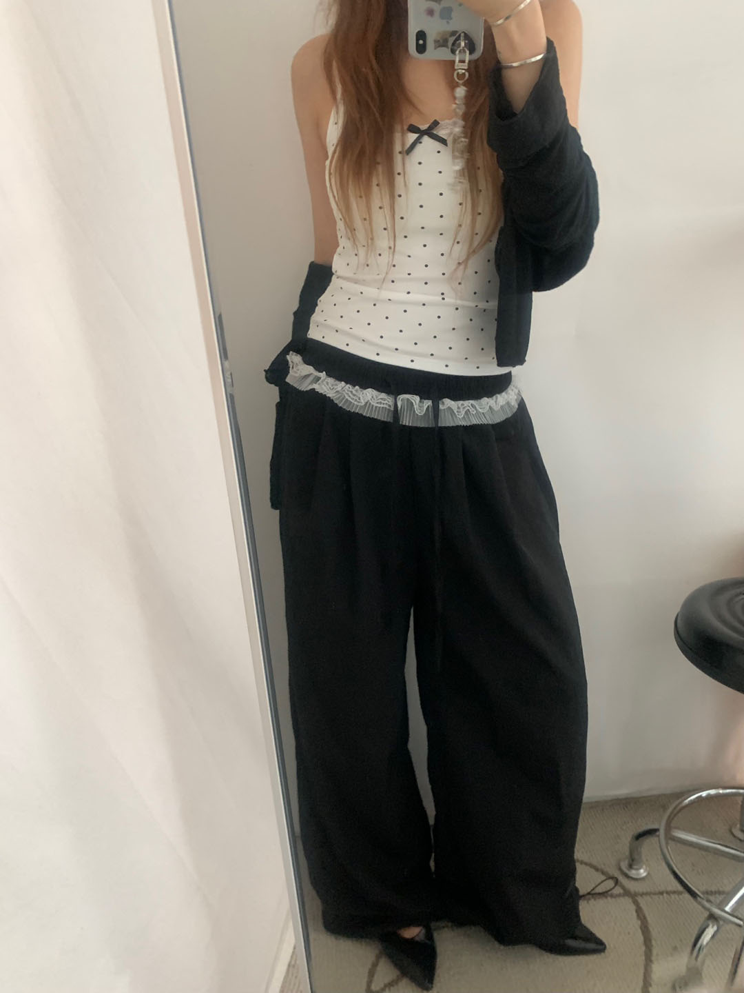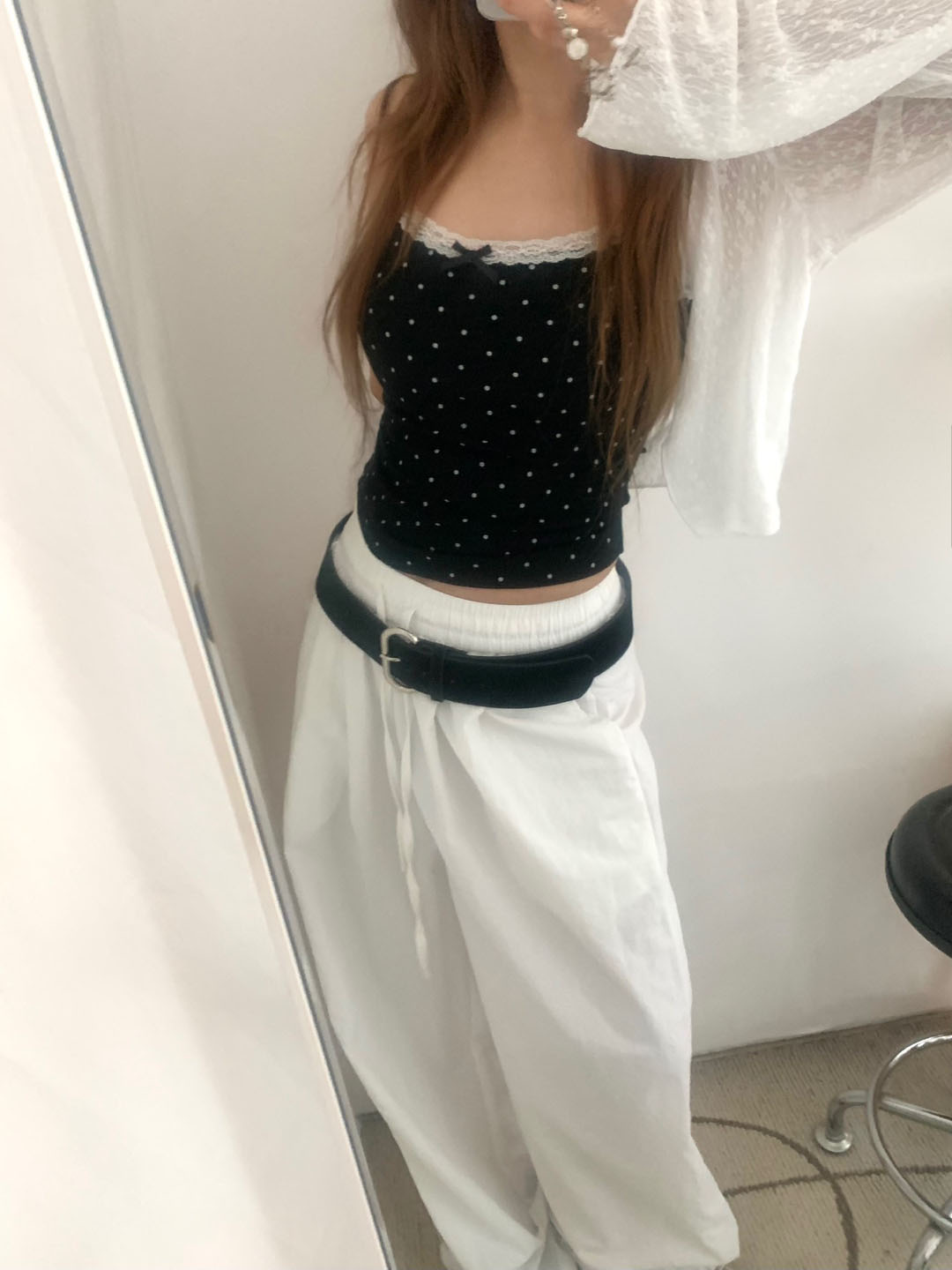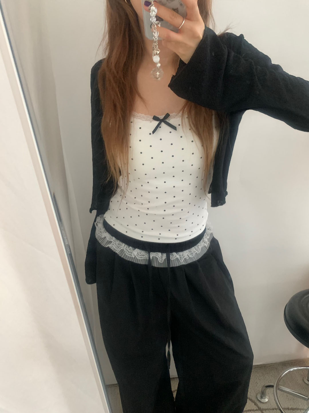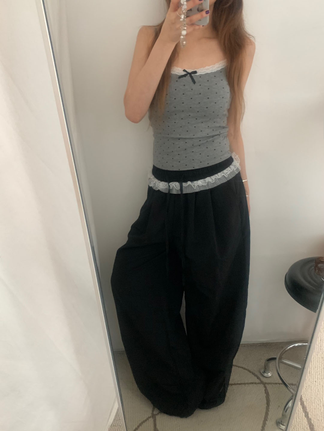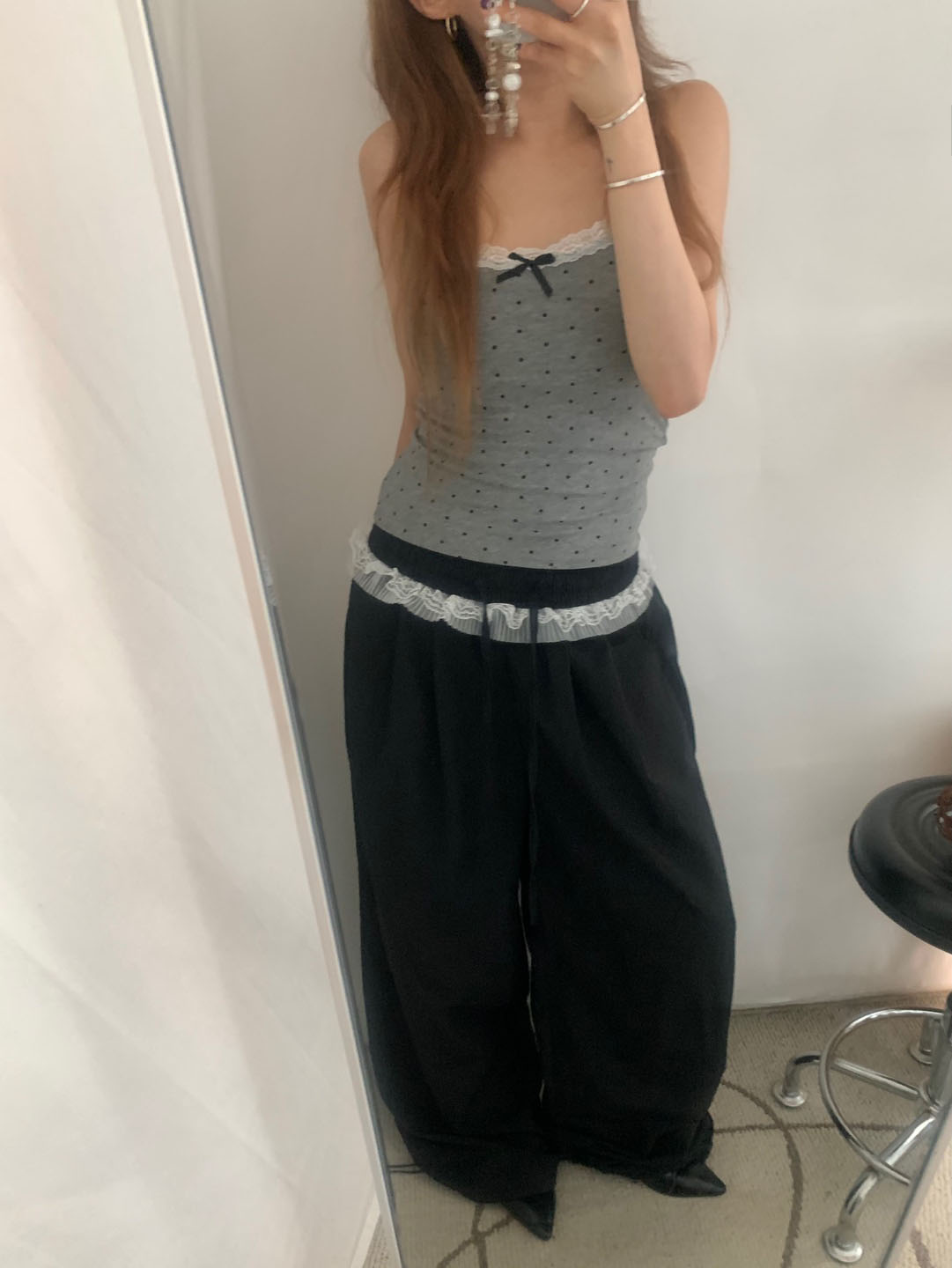 [カップ付き]リボンレースドット柄キャミソール