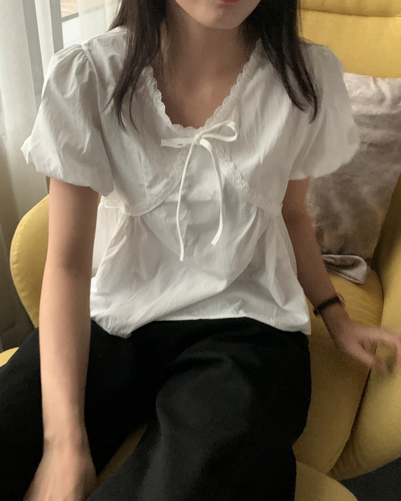 Vネックリボンパフレース半袖ブラウス