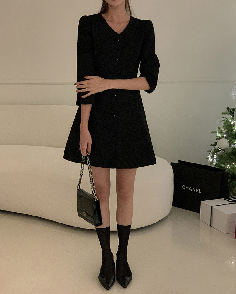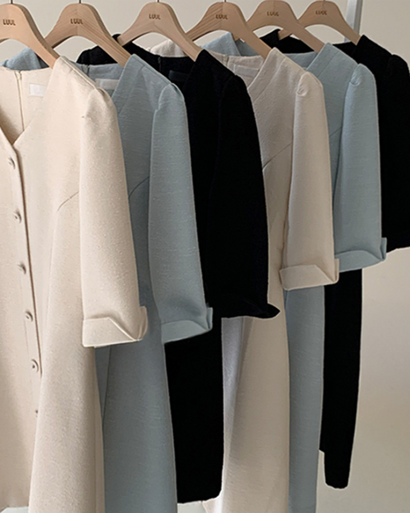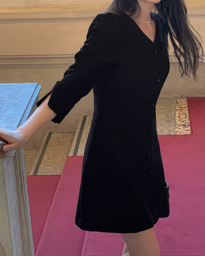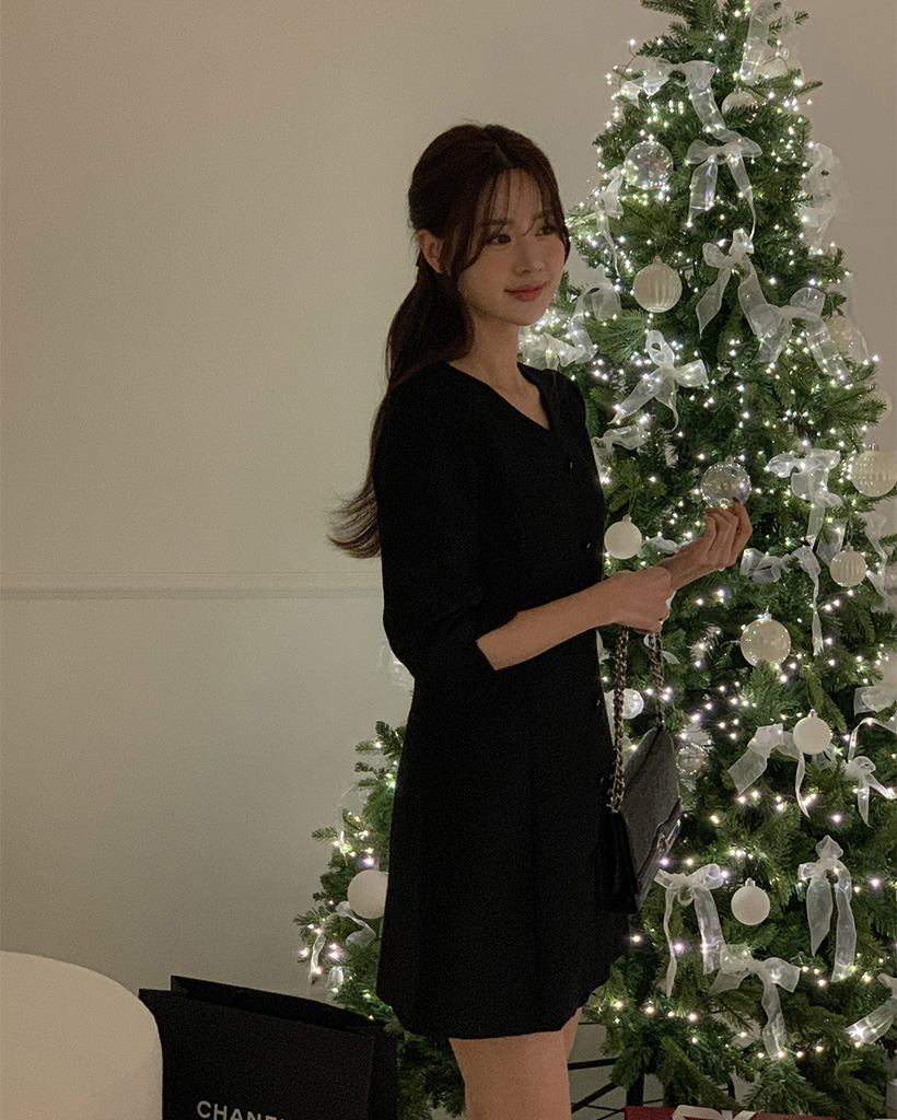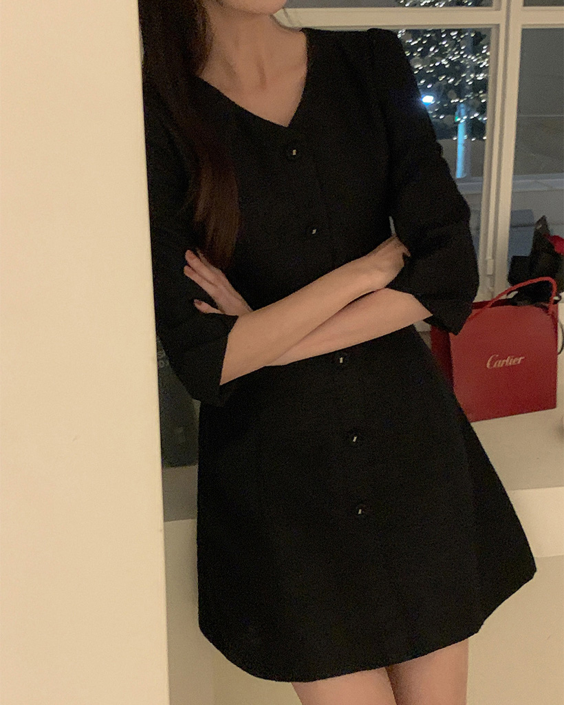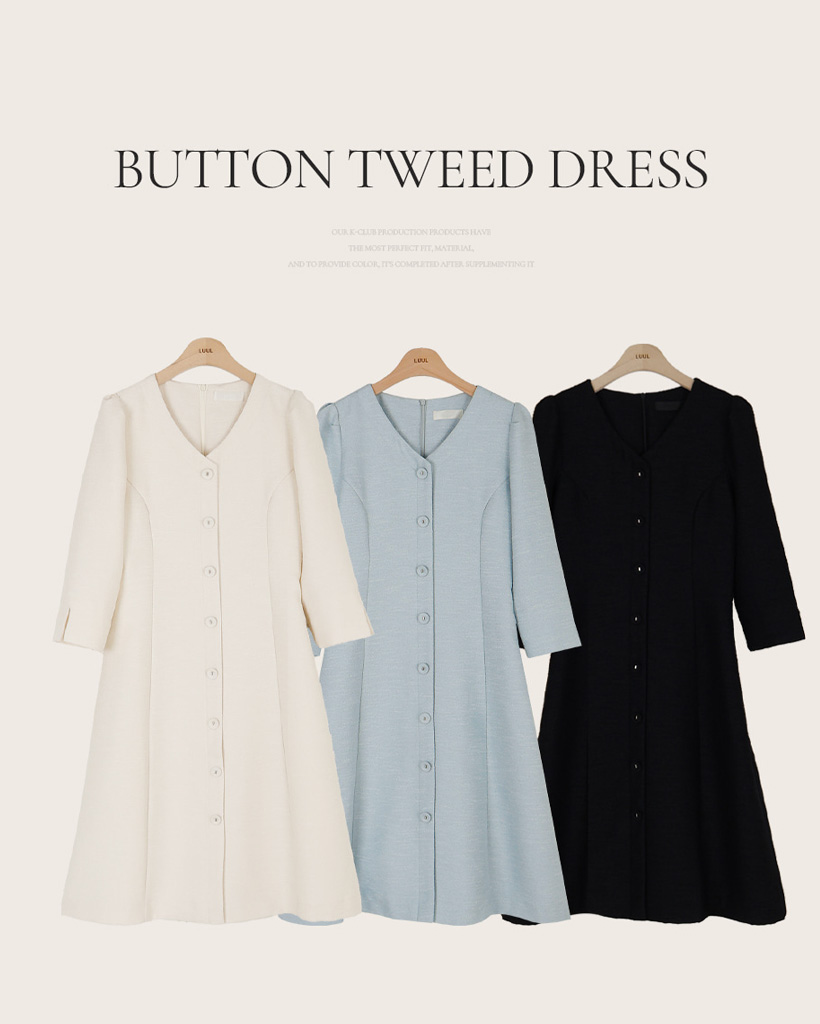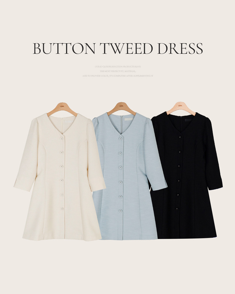 [original] ブイネック ボタン ツイード ワンピース (S-L)
