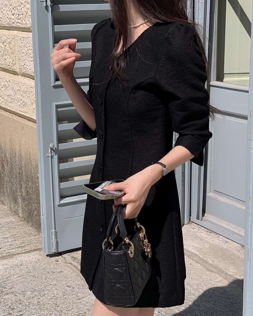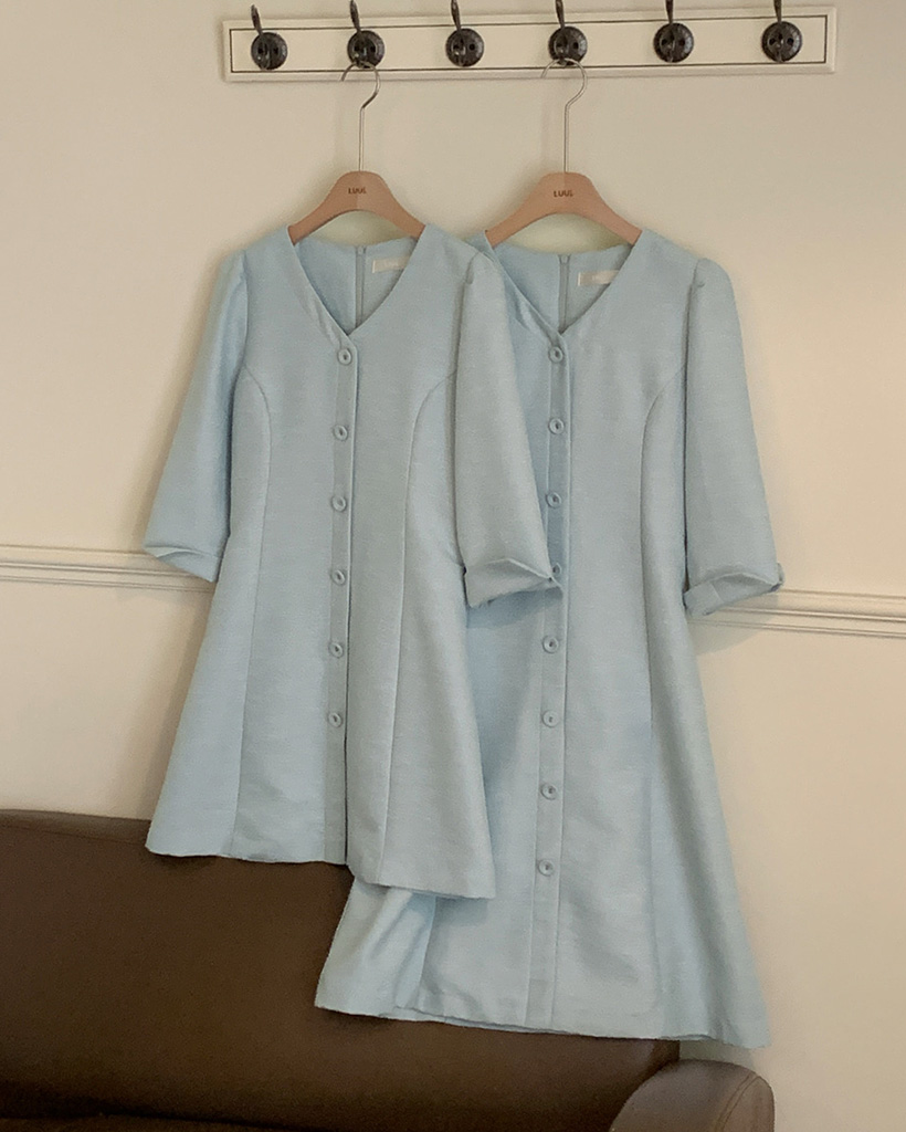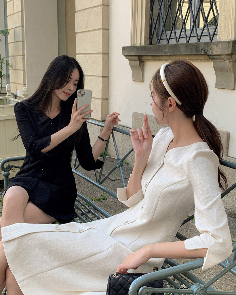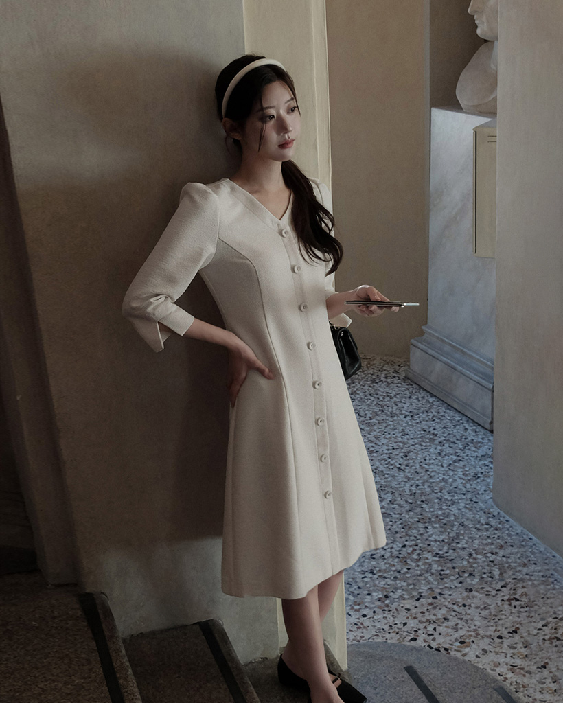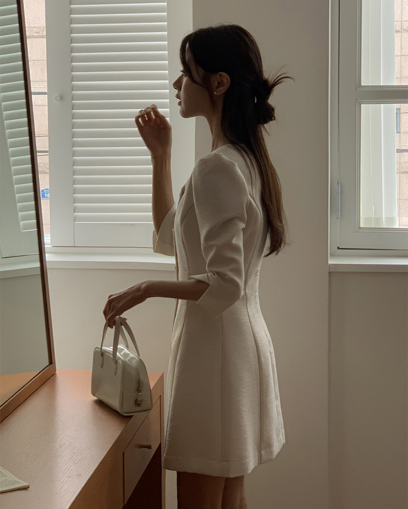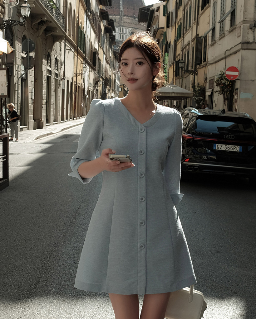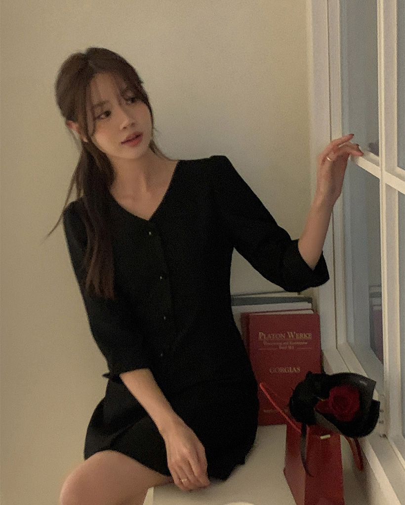 [original] ブイネック ボタン ツイード ワンピース (S-L)